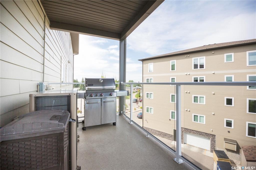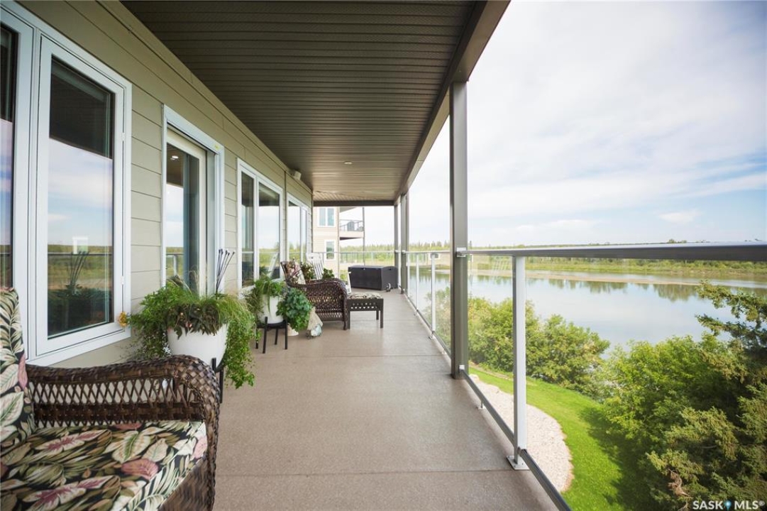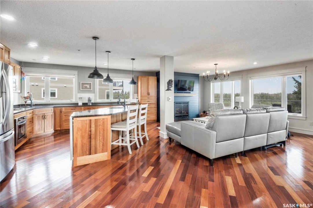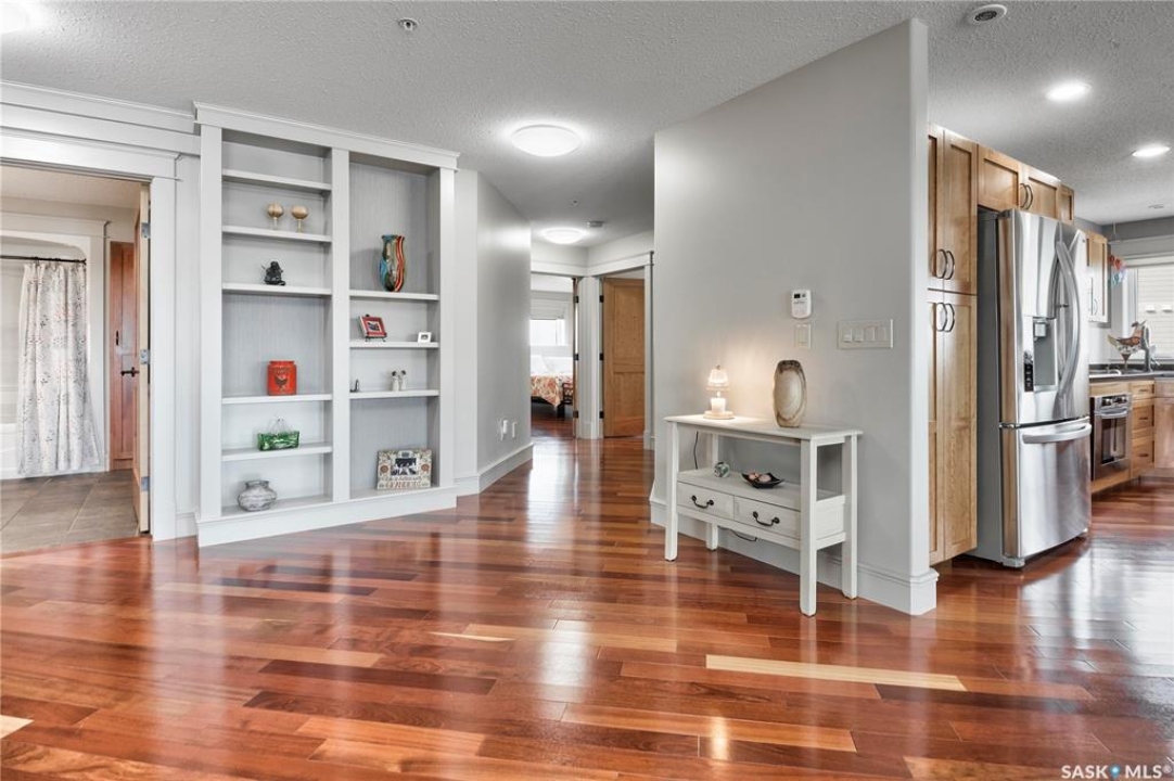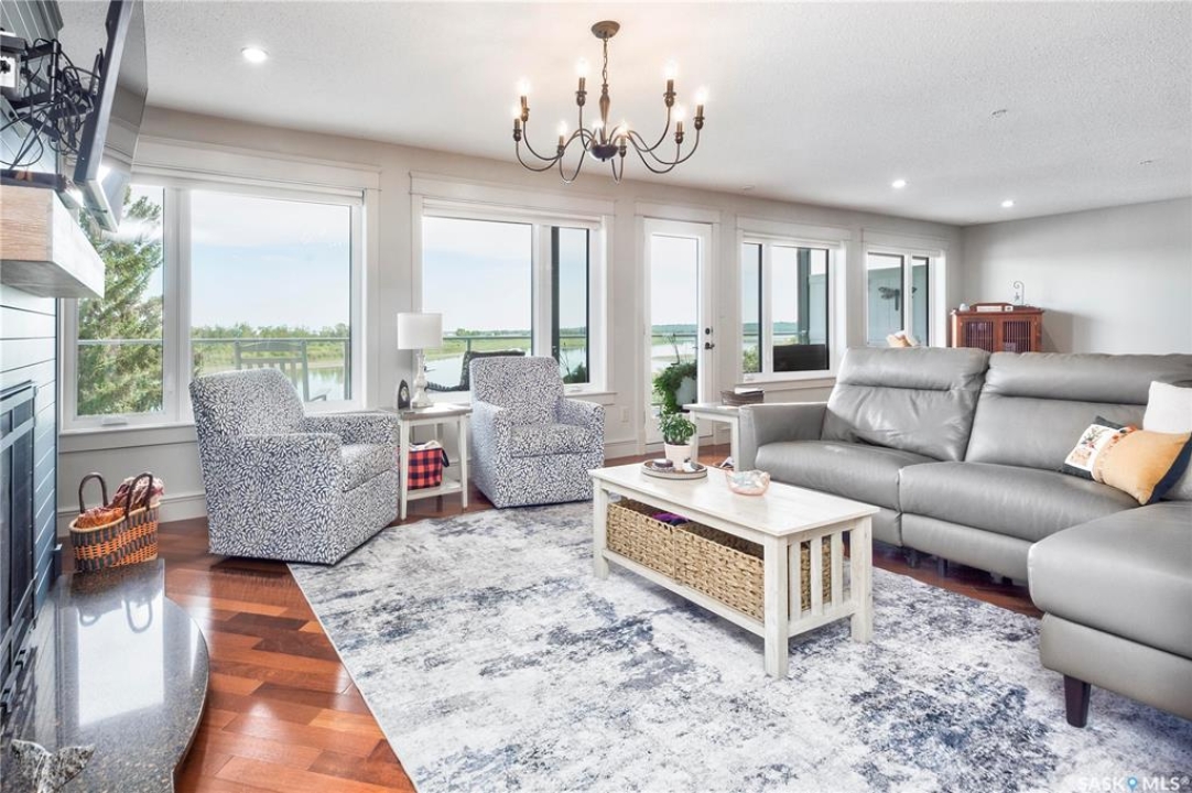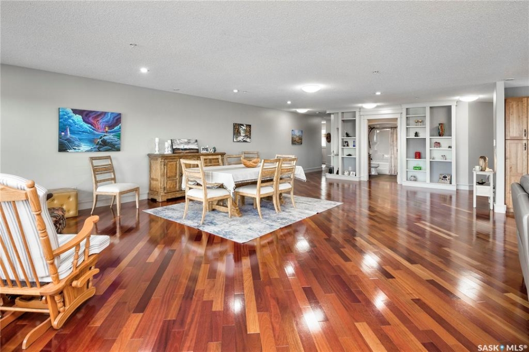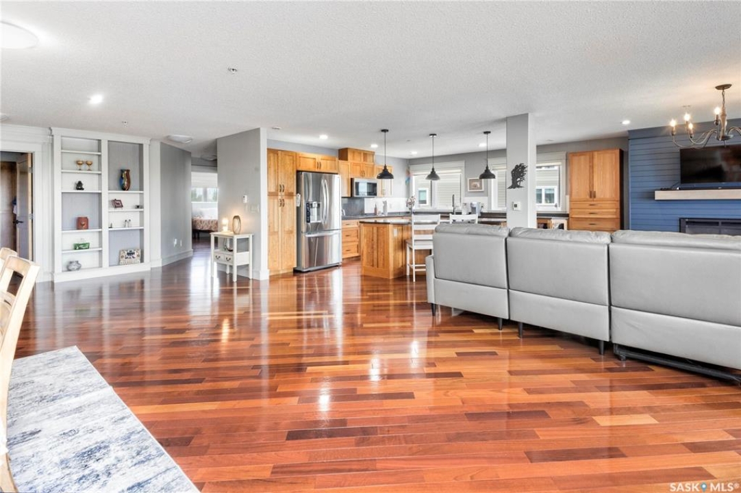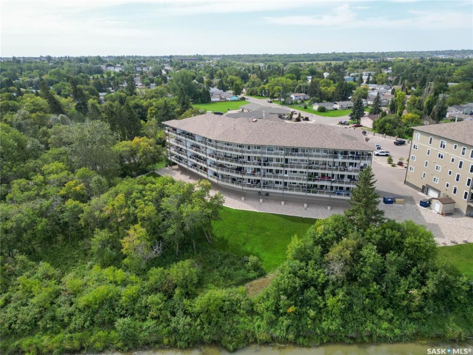 Experience elevated riverfront living in this exceptional third-floor corner condominium, offering 2,000 sq. ft. of luxurious space with some of the finest views in Prince Albert. Northeast facing, this home captures both sunrise and sunset, best enjoyed from the oversized wraparound balcony overlooking the North Saskatchewan River and Rotary Trail. The thoughtfully designed interior features a grand open-concept living and dining area, perfectly suited for entertaining or quiet evenings at home. A chef's kitchen anchors the space with granite countertops, custom cherry cabinetry and an abundance of workspace. Brazilian cherry hardwood flooring flows seamlessly throughout, complemented by tile in the bathrooms, foyer, and laundry room. The private primary suite offers a spa-inspired ensuite and an impressive walk-in closet. Upgraded LED lighting and included heat provide both efficiency and comfort year-round. This exclusive building also offers exceptional amenities, including one in-building heated parking stall and one exterior stall, a generous common area with kitchenette and pool table, plus an exercise room for active living. With direct access to the riverbank and Rotary Trail, this residence blends natural beauty with modern elegance—an extraordinary opportunity to own one of Prince Albert's most desirable riverfront condominiums. Recent upgrades from 2022-2023 include a new fridge, dishwasher, air conditioner, microwave fan, washer, dryer, and freezer.