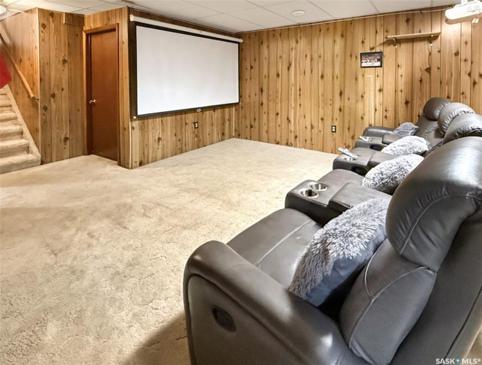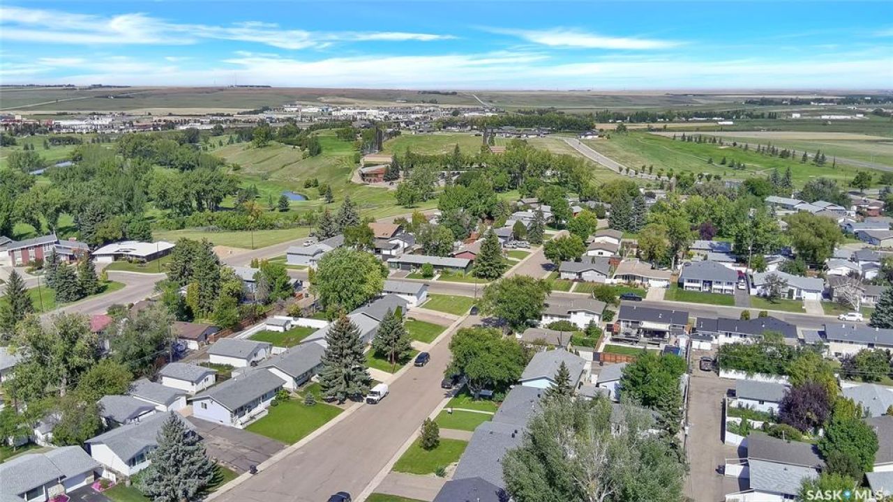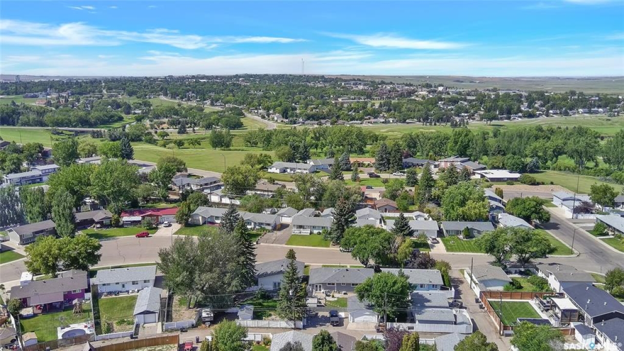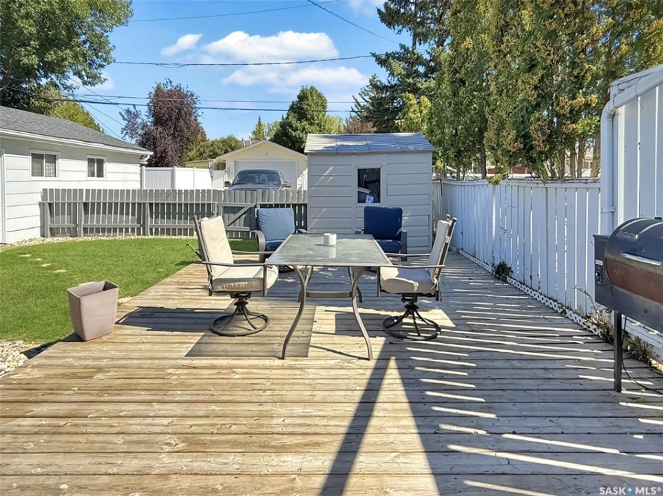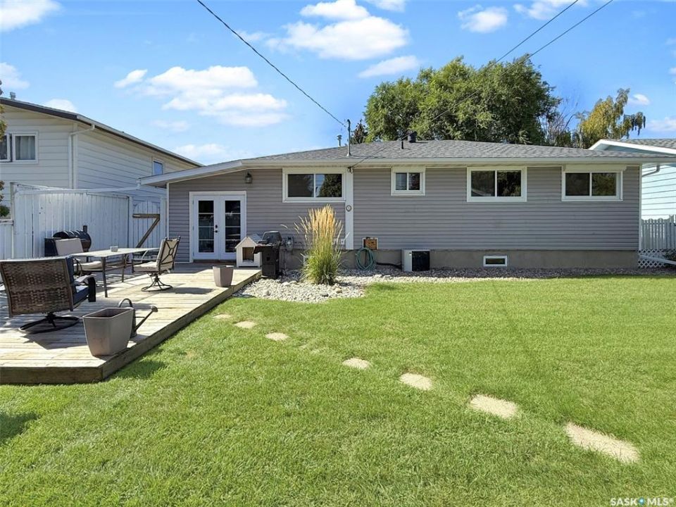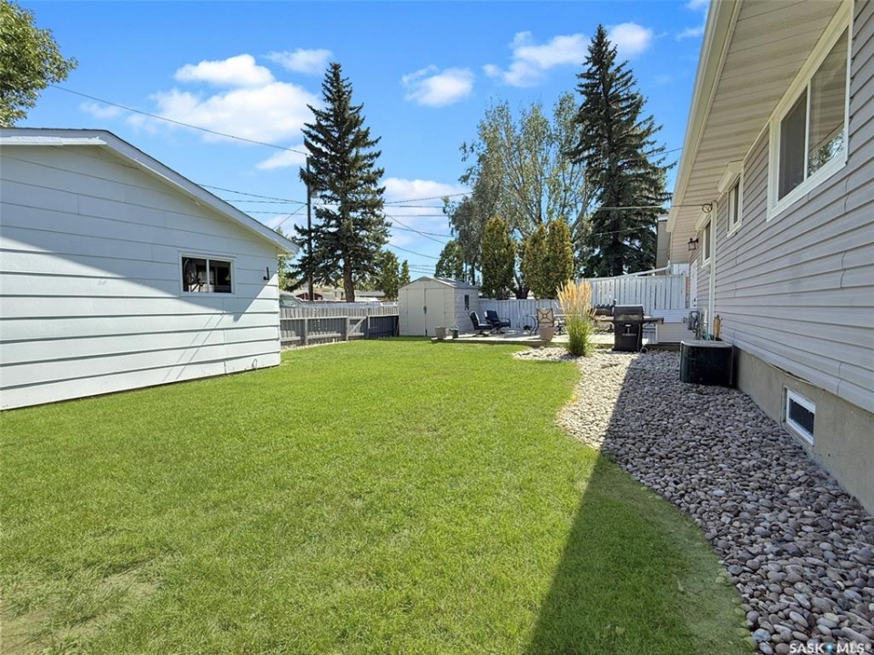 Explore the ideal family residence situated on the sought-after Macdonald Crescent. Nestled in a quiet neighbourhood, this home is just steps from Elmwood Golf Course, within walking distance to K-12 schools, and central to multiple parks and city amenities. Boasting excellent curb appeal, the property features updated vinyl windows and a striking dark blue siding. The spacious bungalow offers an open-concept layout with the kitchen, dining, and living areas at the front, and three well-sized bedrooms at the back. The master bedroom includes a private two-piece ensuite, while a renovated four-piece bathroom serves the other rooms. The living room is inviting with its cozy gas fireplace and large windows, creating a bright and airy atmosphere. The kitchen is equipped with quality cabinetry, stainless steel appliances, and a pantry. The main floor has been freshly painted, new interior doors added and complete with new trim and light fixtures. Next to the kitchen, you will enjoy the additional living space offered in the den boasting vaulted ceilings, perfect for a golf simulator, sitting room or oversized mud room and complete with a 11x10 storage room, the perfect drop space for your sports equipment, room for your deep freeze/extra storage items.. The den space opens to the backyard, via French doors. The basement offers a large recreation room, perfectly staged as a theatre space, complete with an office nook, a fourth bedroom, and a flex room. A renovated three-piece bathroom and updated mechanical room with an energy-efficient furnace, water heater, water softener, and 100 amp electric panel are also located here. The yard is a haven featuring lush grass, a large deck, a shed, and an additional parking pad that can accommodate an RV or even an outdoor hockey rink for the kids. A double car garage completes this remarkable home in a neighbourhood you'll love. Call today for more information!