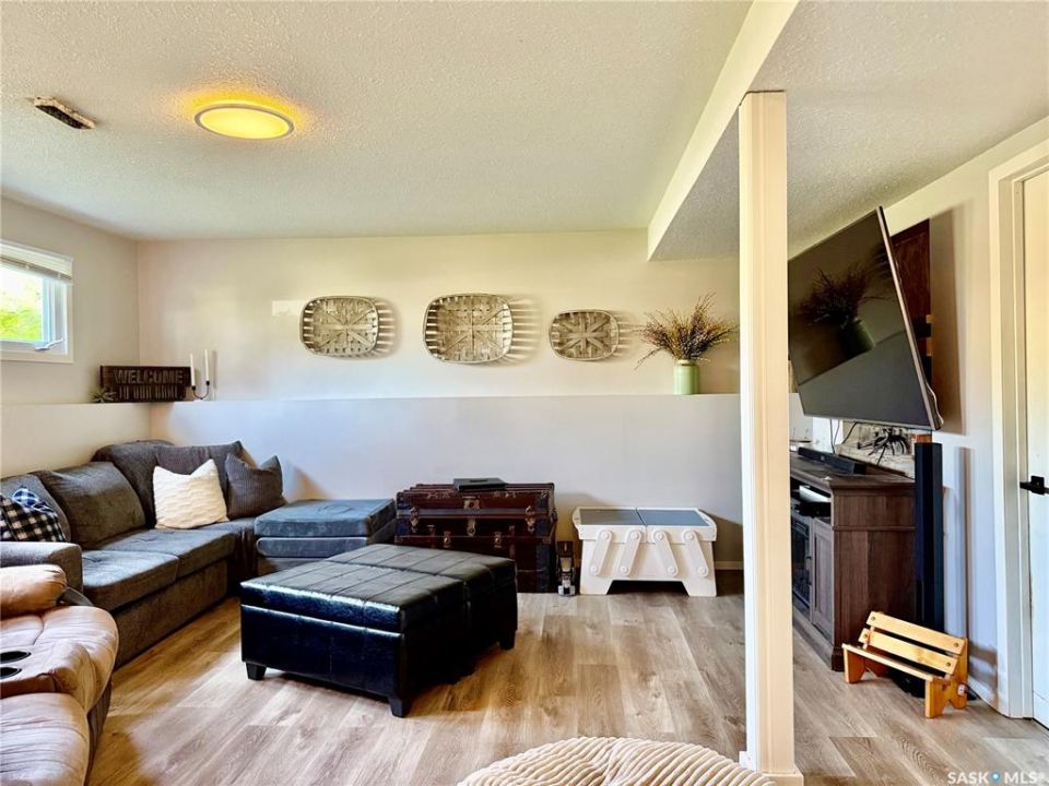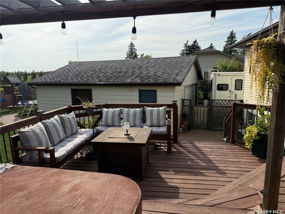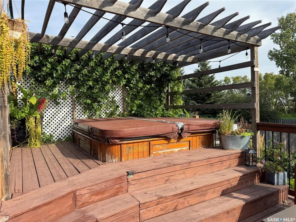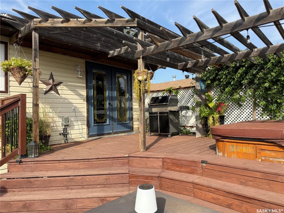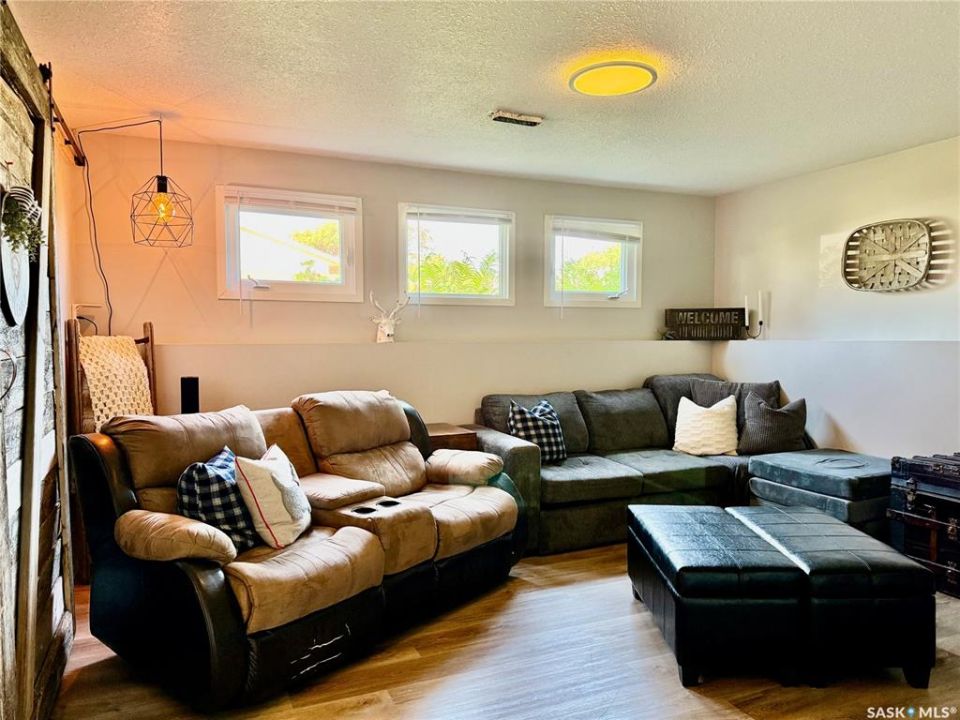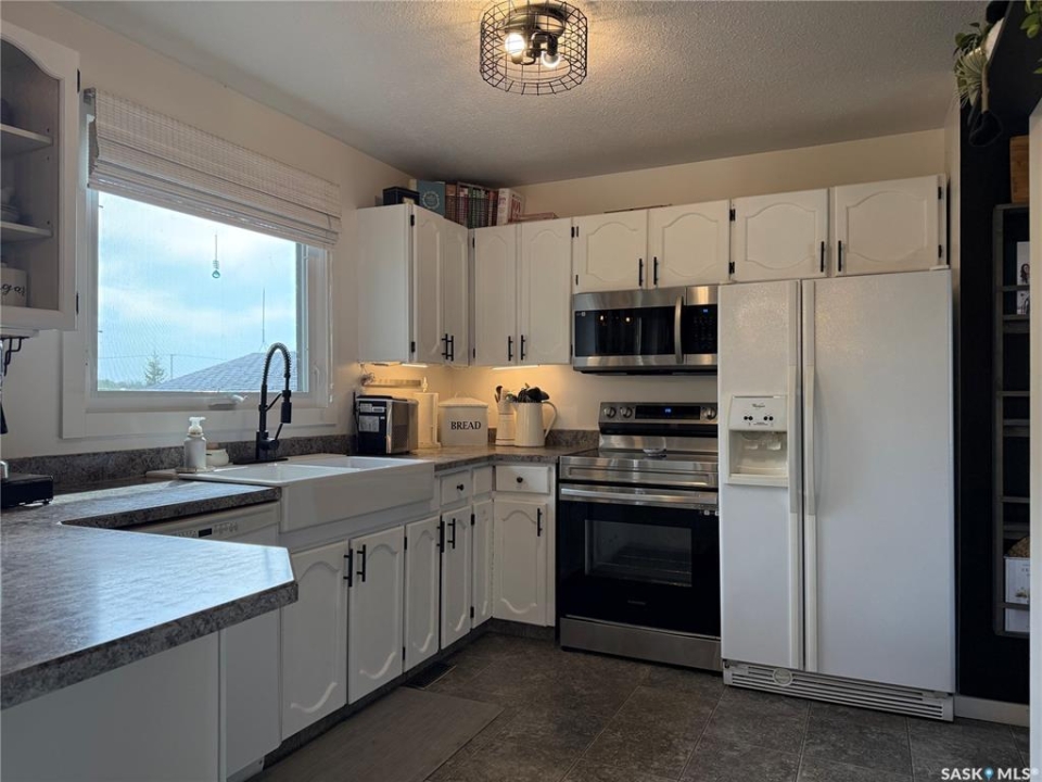 Show Home Style Bi-Level with 4 Bedrooms in Lanigan! Step into this beautifully maintained bi-level home, featuring 4 bedrooms, 2 bathrooms, and exceptional upgrades throughout. The bright and inviting foyer welcomes you into a space that combines comfort and style! Upstairs, the kitchen boasts ample cabinetry, a pantry, and views of the backyard, flowing seamlessly into the dining area with access to the two-tiered back deck—perfect for entertaining. The living room showcases a stunning electric fireplace feature wall, creating a cozy focal point for gatherings. The main floor offers 2 bedrooms and a 3-piece bath with tile shower, while the fully developed lower level includes 2 additional bedrooms, a spacious family room, 4-piece bathroom, dedicated storage room, and a laundry/utility area. Enjoy outdoor living in the fenced backyard, complete with a two-tiered deck, natural gas BBQ hookup, hot tub, patio area, raised garden beds, mature trees and shrubs, and a storage shed. A double detached garage with updated opener (2022) and a rear RV parking area adds convenience and value. Notable Updates Include:2015: Water heater 2019: Electric fireplace, backyard fence, RV parking area 2022: Garage door opener system 2023: Washer/dryer, farmhouse apron sink, basement tub/toilet/taps 2024: Fresh paint, kitchen tap, central vac attachments Ongoing: Trim work, wainscoting, dental molding, added shelving, updated closet doors Located in the welcoming community of Lanigan, close to BHP Jansen and Nutrien Lanigan mine sites, with great amenities including a new K–12 school, new daycare (under construction), new swimming pool, golf course, rec complex, and hospital. This move-in-ready home truly has it all—call today to schedule your private viewing!