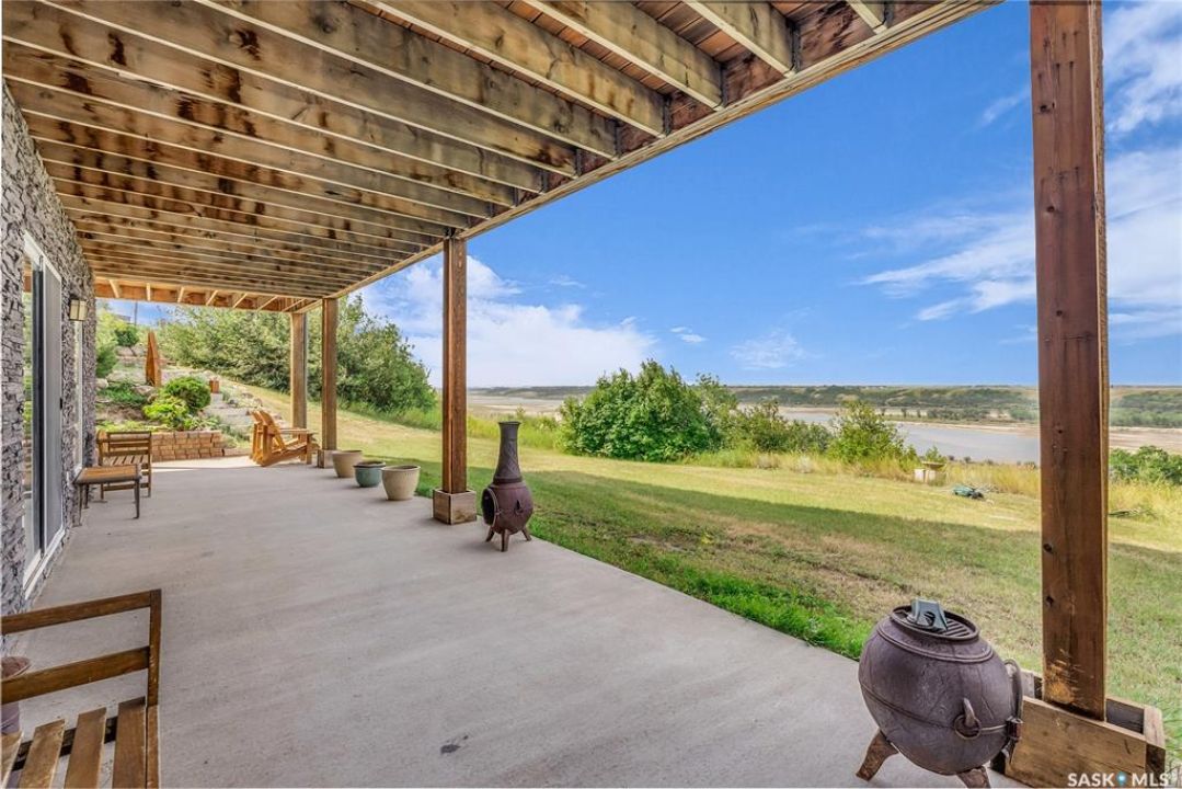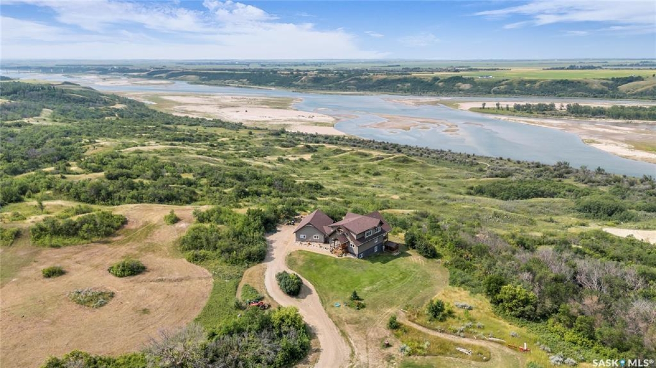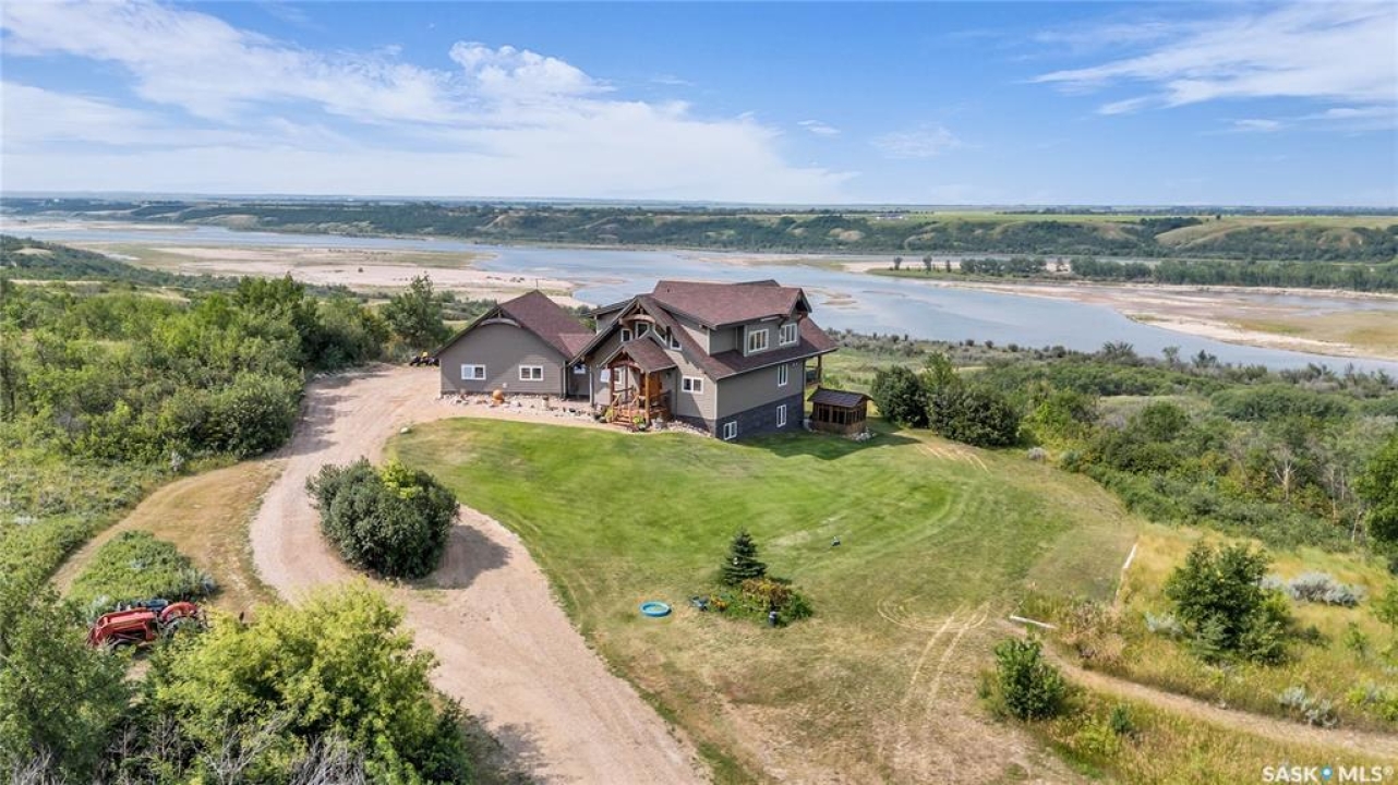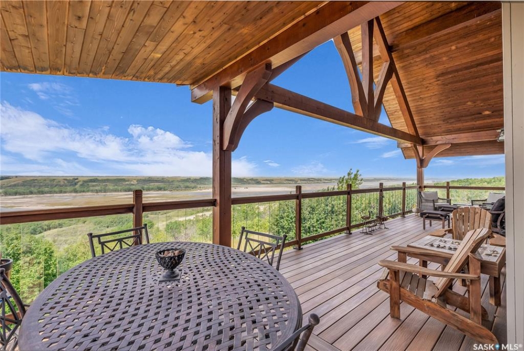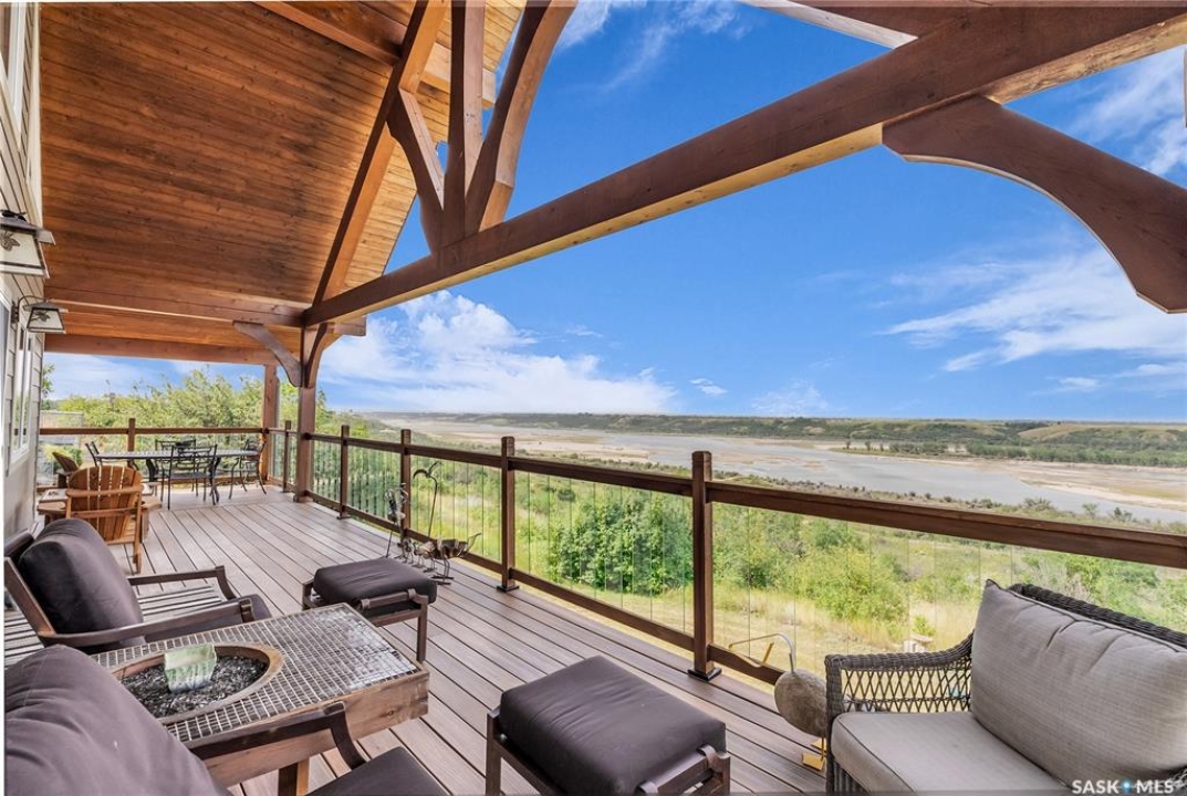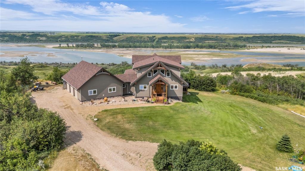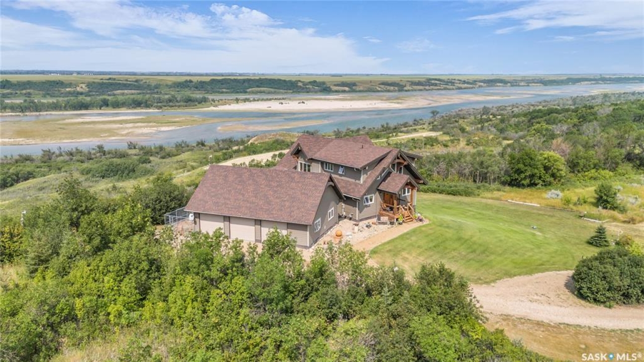 Year round sanctuary AWAITS! This stunning location of almost 5km panoramic view of the River will indeed captivate you! Inside, the interior reflects a charm and elegance. Vaulted ceilings with exposed beams, tree trunks for posts are like no other home you have seen before! A stone gas fireplace stands as the centerpiece of the main floor living space with another stove on the other side, radiating warmth and inviting cozy gatherings. The rustic style carries throughout with the light fixtures, unique vanities and imported medieval times inspired doors that greet you! The kitchen, a culinary haven, boasts handcrafted cabinetry and granite countertops, offering both functionality and style. Adjoining the dining area, it sets the stage for memorable meals shared with loved ones against the backdrop of the river. Ascending the staircase, one discovers a sanctuary of rest and relaxation in the primary bedroom suite. The primary bedroom loft allows for a bird's eye view of the surroundings in & out! Step downstairs and as you enter, you'll be greeted by the inviting gas fireplace, perfect for cozy gatherings while watching the sun set. Adjacent to the fireplace is the built-in wet bar area, ideal for entertaining guests. The walkout feature leads directly to a the enclosed hot tub structure that keeps the wind and elements away year round! The heated attached 3 car garage (28x40) is a huge asset as it combines functionality with convenience with its workshop area and vehicle storage. The yard beckons exploration, with meandering pathways leading to secluded areas for self reflection with nature. Whether basking in the warmth of the sun or reveling in the serenity of starlit nights, every moment spent in this idyllic retreat will feel like such a unique place to be! Come for your own tour and see what this hillside home offers along with its unobstructed sight lines of the South Saskatchewan River! We have a video tour available!