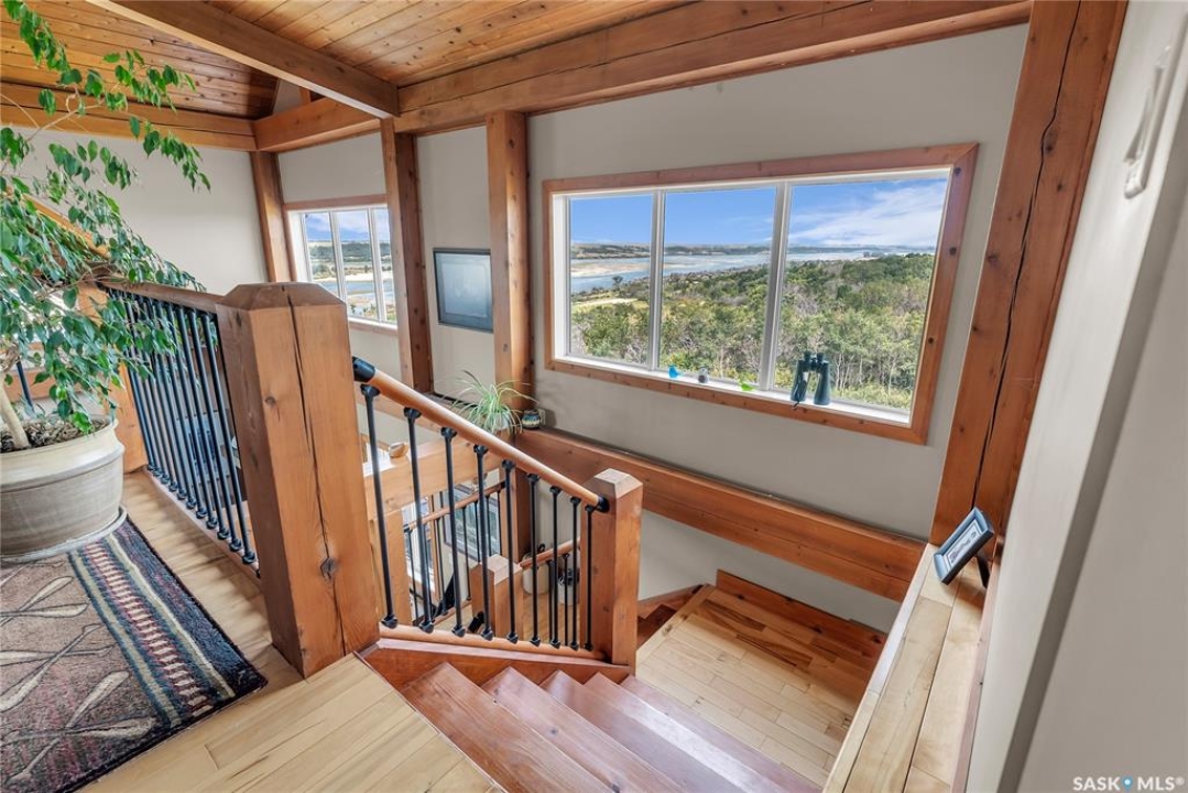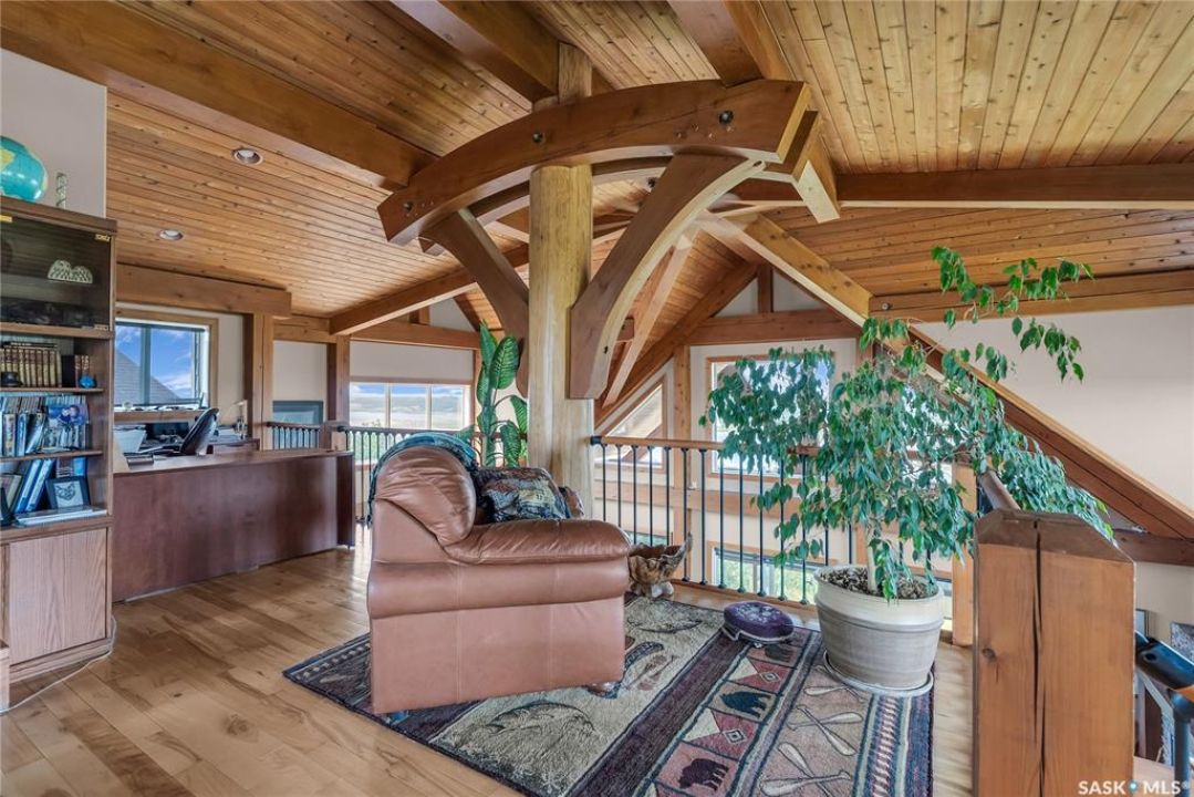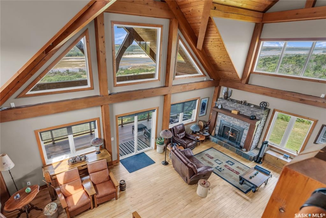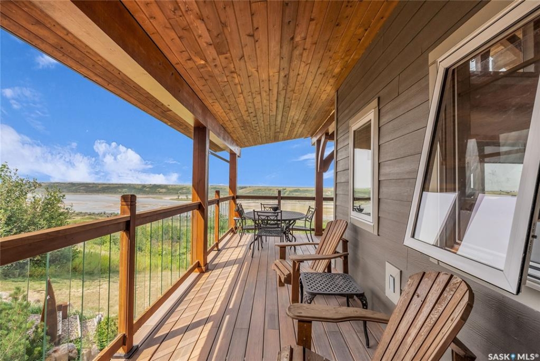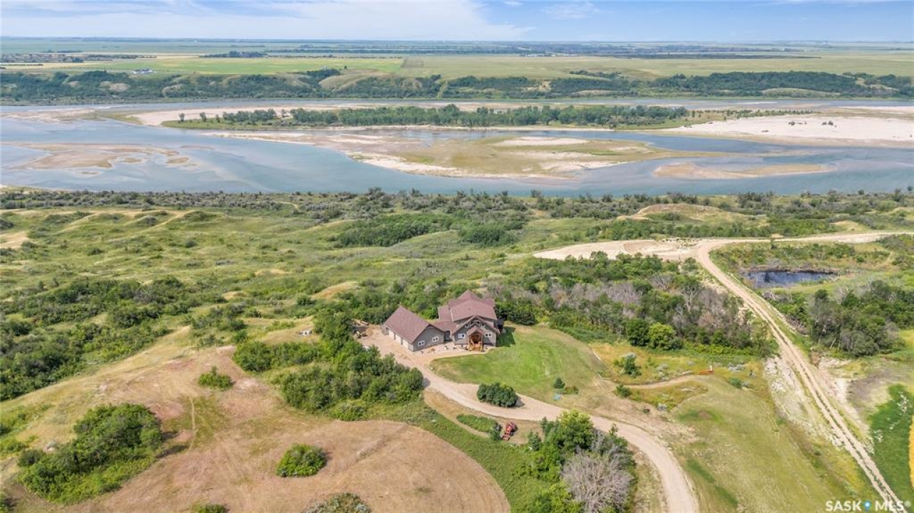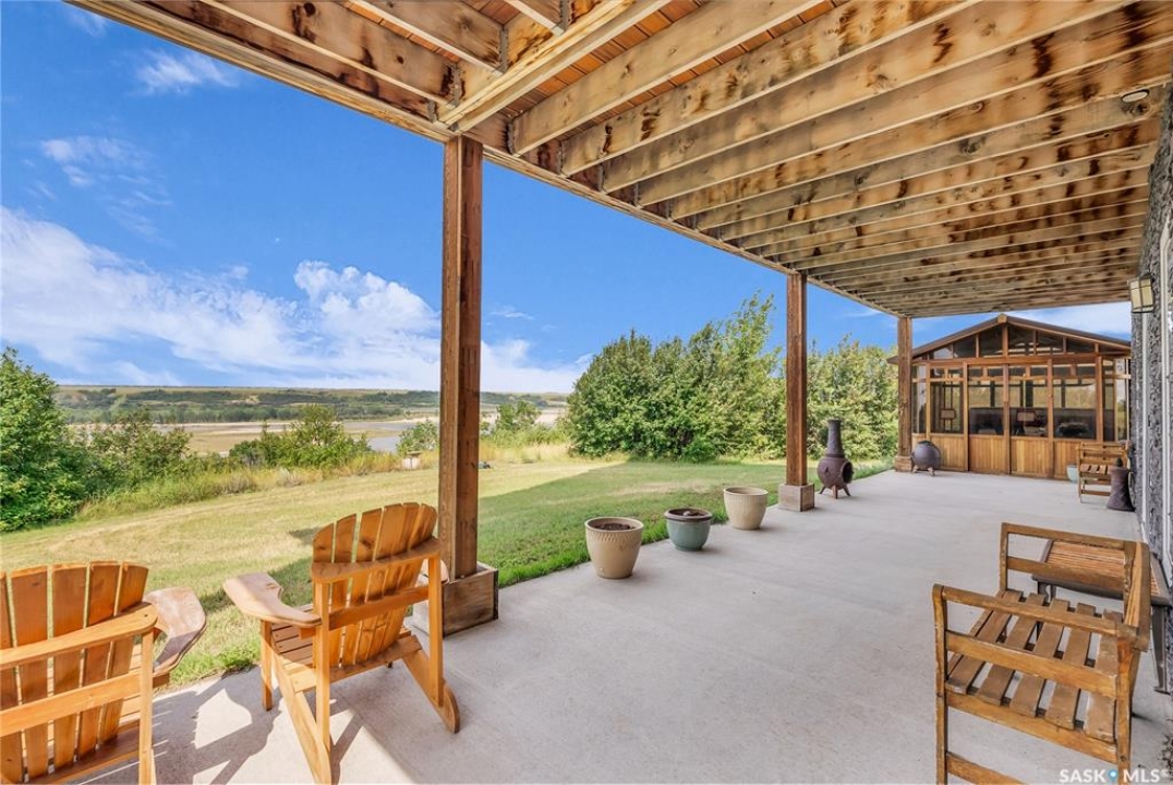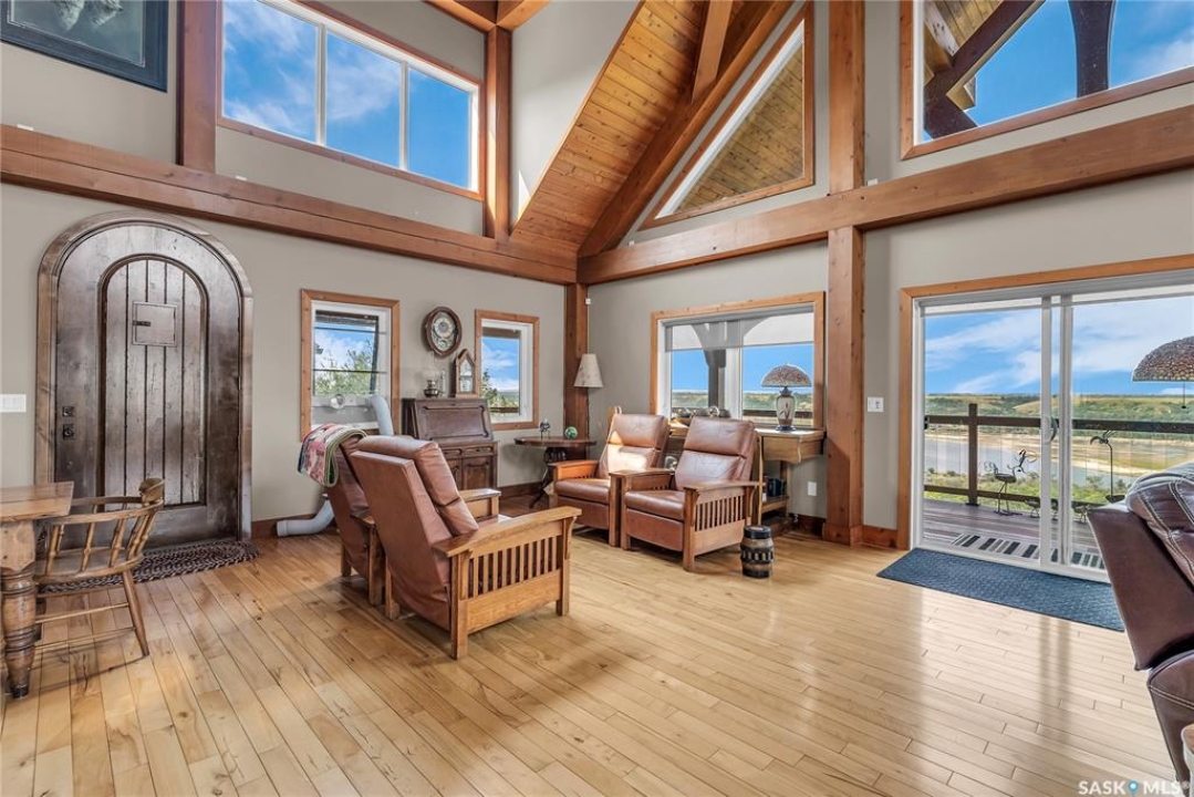 Year round sanctuary AWAITS! This stunning location of almost 5km panoramic view of the River will indeed captivate you! Inside, the interior reflects a charm and elegance. Vaulted ceilings with exposed beams, tree trunks for posts are like no other home you have seen before! A stone gas fireplace stands as the centerpiece of the main floor living space with another stove on the other side, radiating warmth and inviting cozy gatherings. The rustic style carries throughout with the light fixtures, unique vanities and imported medieval times inspired doors that greet you! The kitchen, a culinary haven, boasts handcrafted cabinetry and granite countertops, offering both functionality and style. Adjoining the dining area, it sets the stage for memorable meals shared with loved ones against the backdrop of the river. Ascending the staircase, one discovers a sanctuary of rest and relaxation in the primary bedroom suite. The primary bedroom loft allows for a bird's eye view of the surroundings in & out! Step downstairs and as you enter, you'll be greeted by the inviting gas fireplace, perfect for cozy gatherings while watching the sun set. Adjacent to the fireplace is the built-in wet bar area, ideal for entertaining guests. The walkout feature leads directly to a the enclosed hot tub structure that keeps the wind and elements away year round! The heated attached 3 car garage (28x40) is a huge asset as it combines functionality with convenience with its workshop area and vehicle storage. The yard beckons exploration, with meandering pathways leading to secluded areas for self reflection with nature. Whether basking in the warmth of the sun or reveling in the serenity of starlit nights, every moment spent in this idyllic retreat will feel like such a unique place to be! Come for your own tour and see what this hillside home offers along with its unobstructed sight lines of the South Saskatchewan River! We have a video tour available!