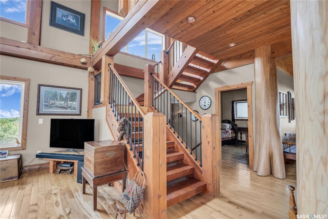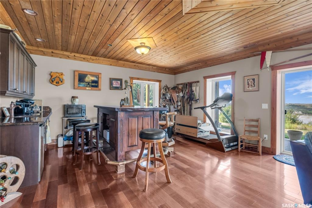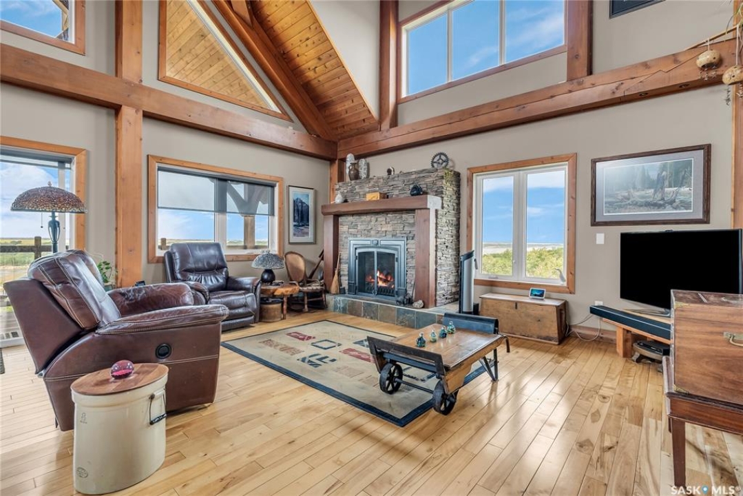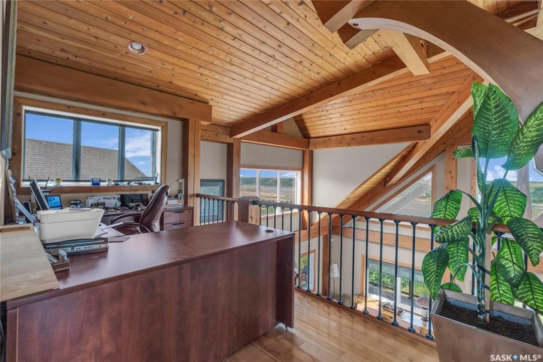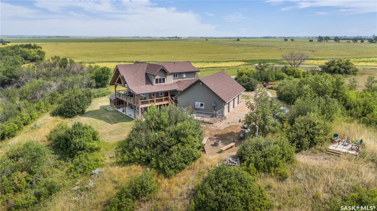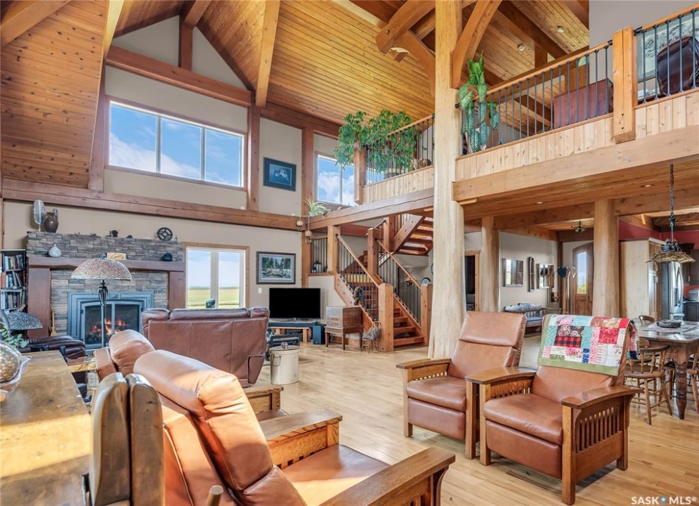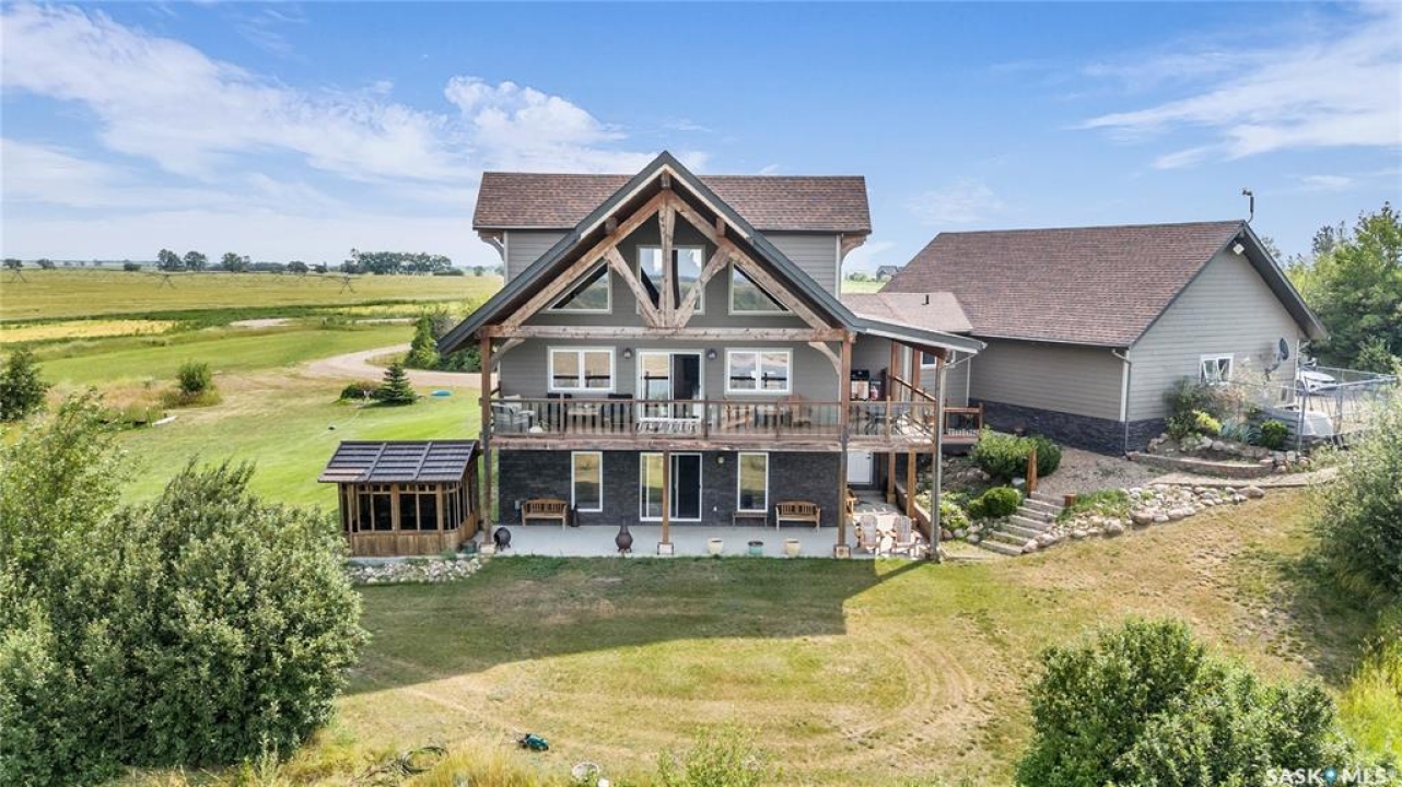 Year round sanctuary AWAITS! This stunning location of almost 5km panoramic view of the River will indeed captivate you! Inside, the interior reflects a charm and elegance. Vaulted ceilings with exposed beams, tree trunks for posts are like no other home you have seen before! A stone gas fireplace stands as the centerpiece of the main floor living space with another stove on the other side, radiating warmth and inviting cozy gatherings. The rustic style carries throughout with the light fixtures, unique vanities and imported medieval times inspired doors that greet you! The kitchen, a culinary haven, boasts handcrafted cabinetry and granite countertops, offering both functionality and style. Adjoining the dining area, it sets the stage for memorable meals shared with loved ones against the backdrop of the river. Ascending the staircase, one discovers a sanctuary of rest and relaxation in the primary bedroom suite. The primary bedroom loft allows for a bird's eye view of the surroundings in & out! Step downstairs and as you enter, you'll be greeted by the inviting gas fireplace, perfect for cozy gatherings while watching the sun set. Adjacent to the fireplace is the built-in wet bar area, ideal for entertaining guests. The walkout feature leads directly to a the enclosed hot tub structure that keeps the wind and elements away year round! The heated attached 3 car garage (28x40) is a huge asset as it combines functionality with convenience with its workshop area and vehicle storage. The yard beckons exploration, with meandering pathways leading to secluded areas for self reflection with nature. Whether basking in the warmth of the sun or reveling in the serenity of starlit nights, every moment spent in this idyllic retreat will feel like such a unique place to be! Come for your own tour and see what this hillside home offers along with its unobstructed sight lines of the South Saskatchewan River! We have a video tour available!