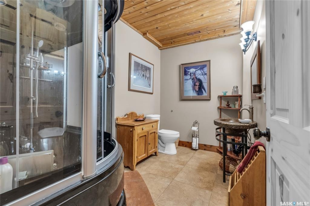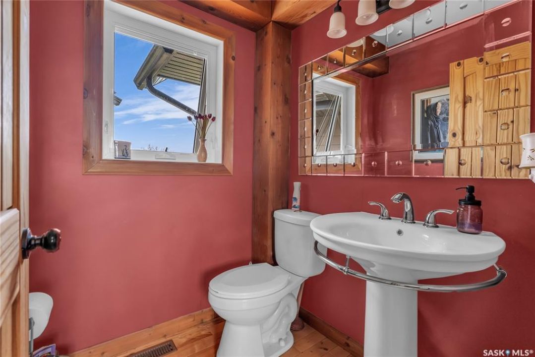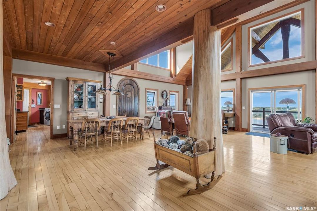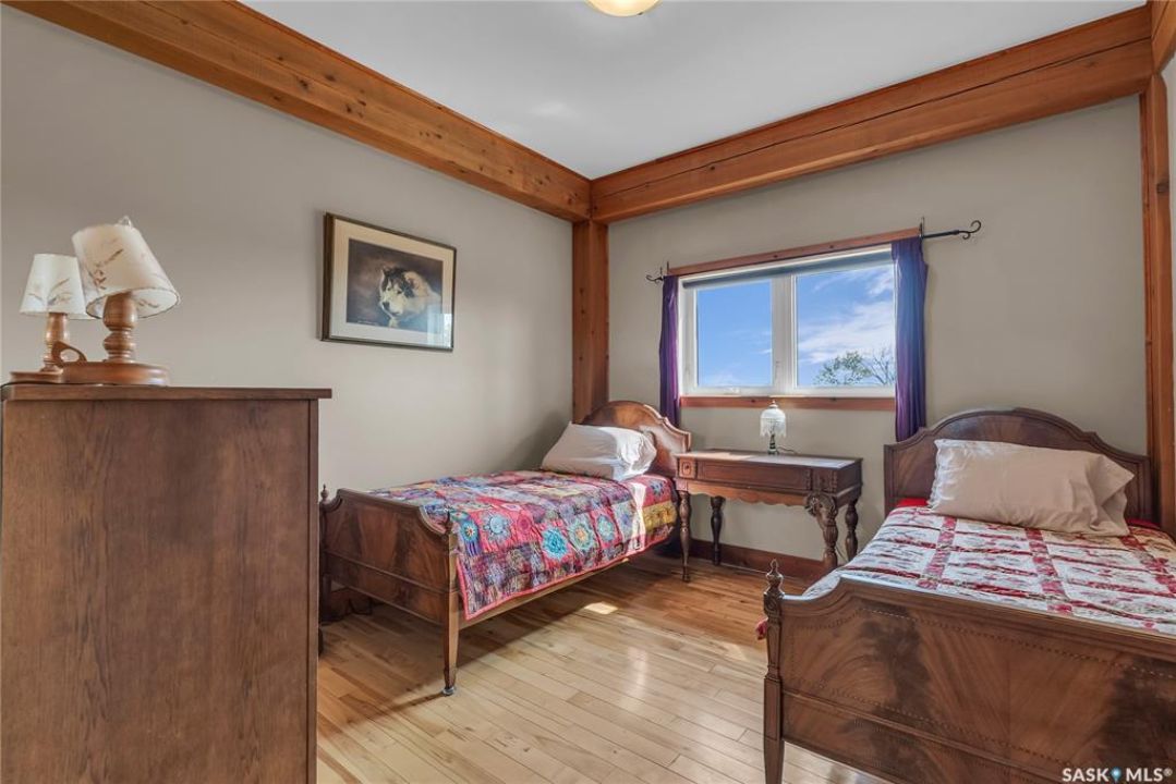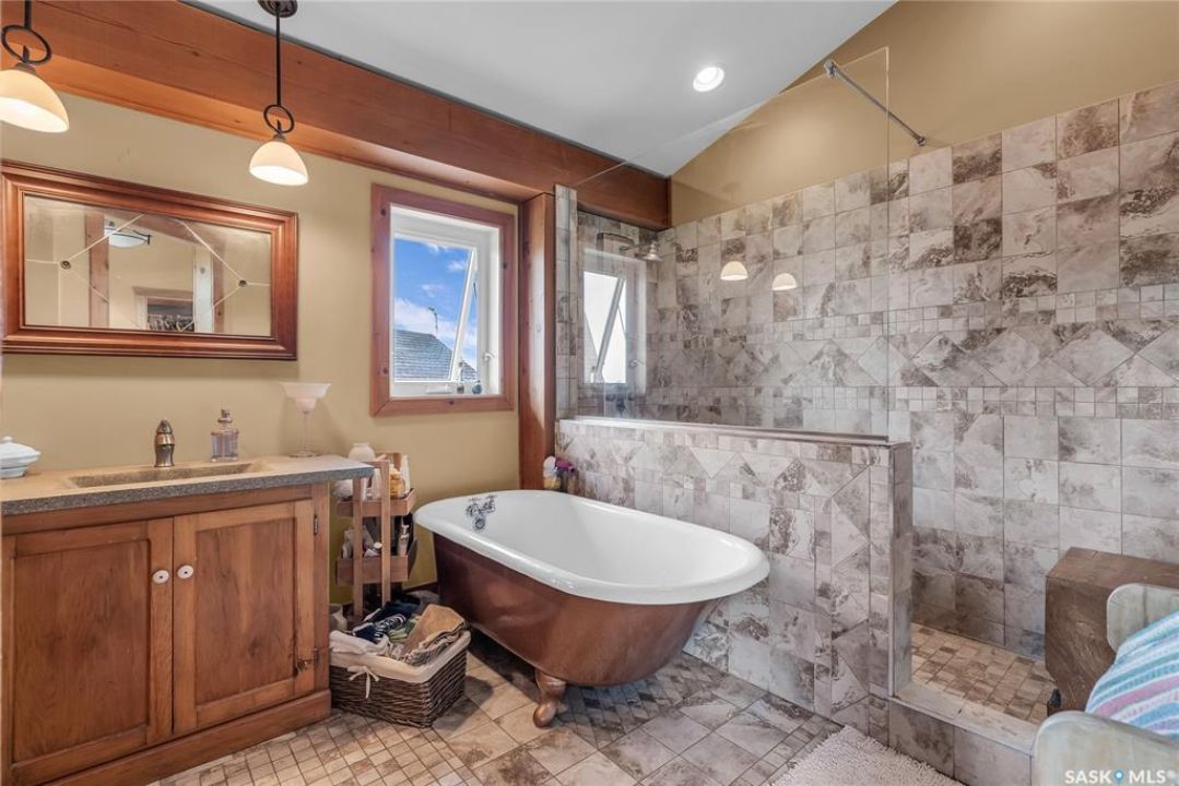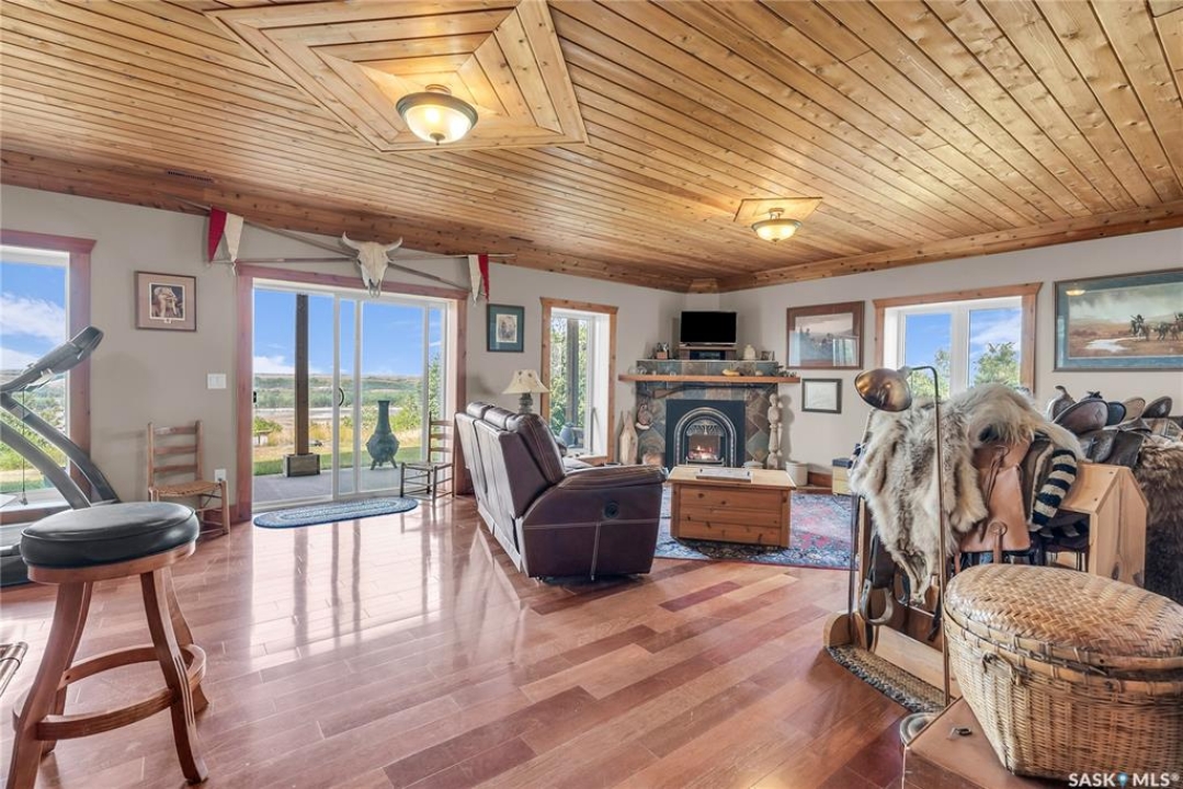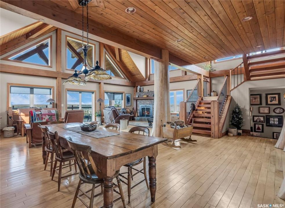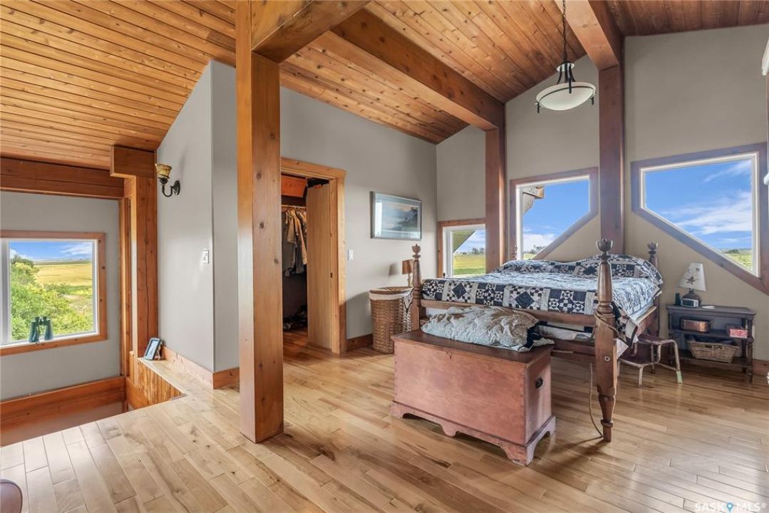 Year round sanctuary AWAITS! This stunning location of almost 5km panoramic view of the River will indeed captivate you! Inside, the interior reflects a charm and elegance. Vaulted ceilings with exposed beams, tree trunks for posts are like no other home you have seen before! A stone gas fireplace stands as the centerpiece of the main floor living space with another stove on the other side, radiating warmth and inviting cozy gatherings. The rustic style carries throughout with the light fixtures, unique vanities and imported medieval times inspired doors that greet you! The kitchen, a culinary haven, boasts handcrafted cabinetry and granite countertops, offering both functionality and style. Adjoining the dining area, it sets the stage for memorable meals shared with loved ones against the backdrop of the river. Ascending the staircase, one discovers a sanctuary of rest and relaxation in the primary bedroom suite. The primary bedroom loft allows for a bird's eye view of the surroundings in & out! Step downstairs and as you enter, you'll be greeted by the inviting gas fireplace, perfect for cozy gatherings while watching the sun set. Adjacent to the fireplace is the built-in wet bar area, ideal for entertaining guests. The walkout feature leads directly to a the enclosed hot tub structure that keeps the wind and elements away year round! The heated attached 3 car garage (28x40) is a huge asset as it combines functionality with convenience with its workshop area and vehicle storage. The yard beckons exploration, with meandering pathways leading to secluded areas for self reflection with nature. Whether basking in the warmth of the sun or reveling in the serenity of starlit nights, every moment spent in this idyllic retreat will feel like such a unique place to be! Come for your own tour and see what this hillside home offers along with its unobstructed sight lines of the South Saskatchewan River! We have a video tour available!