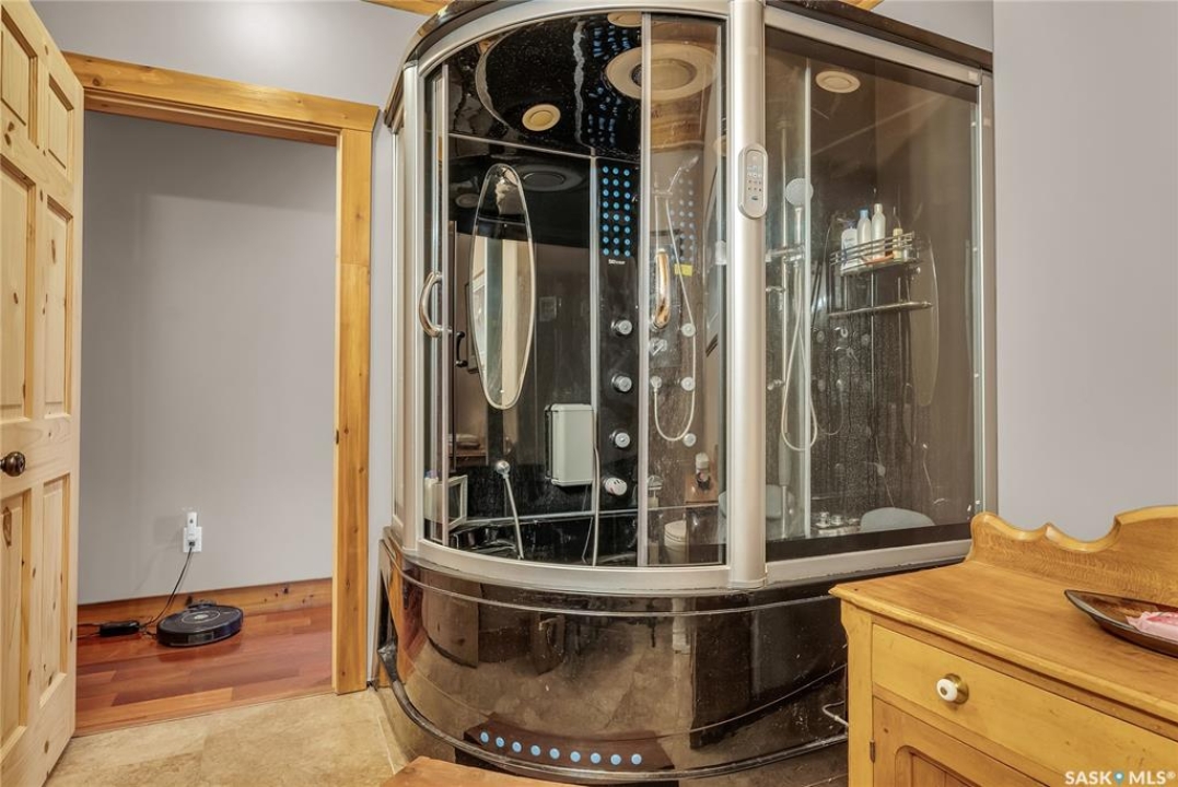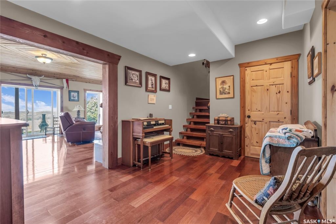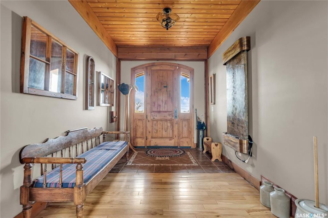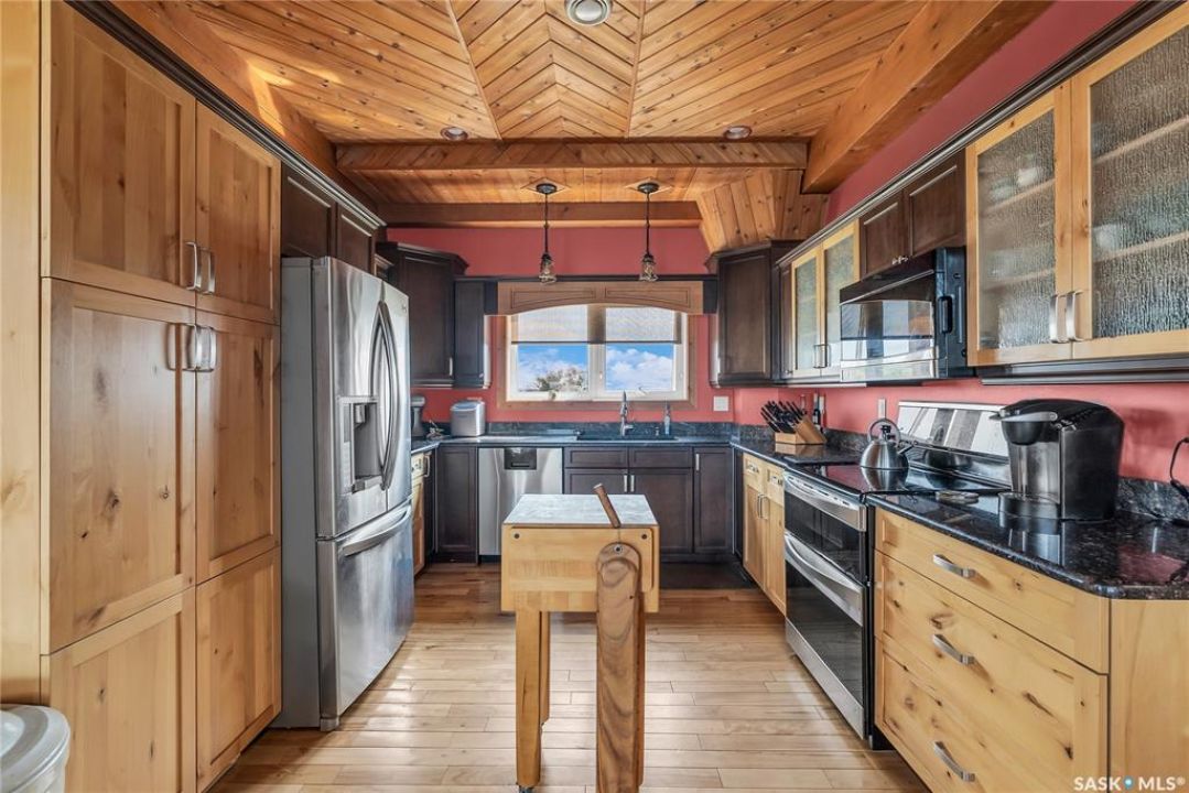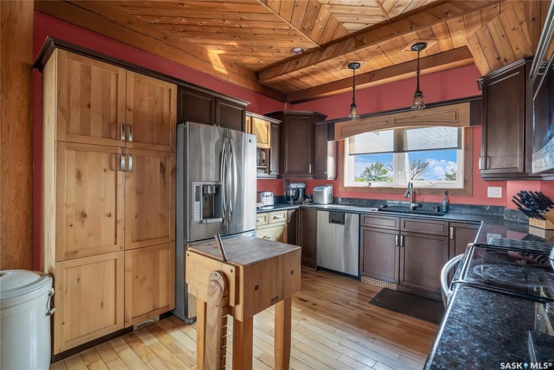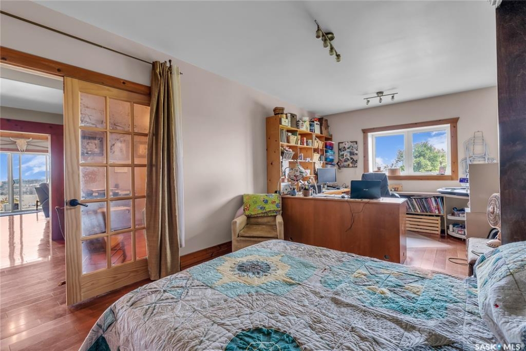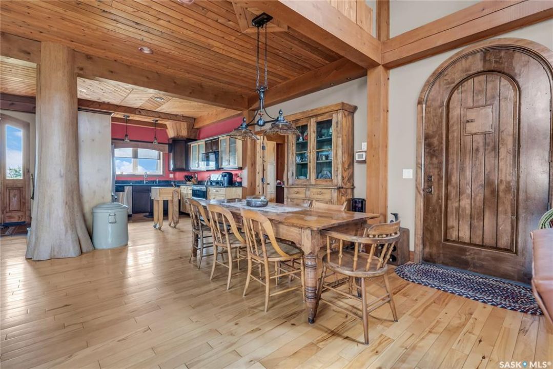 Year round sanctuary AWAITS! This stunning location of almost 5km panoramic view of the River will indeed captivate you! Inside, the interior reflects a charm and elegance. Vaulted ceilings with exposed beams, tree trunks for posts are like no other home you have seen before! A stone gas fireplace stands as the centerpiece of the main floor living space with another stove on the other side, radiating warmth and inviting cozy gatherings. The rustic style carries throughout with the light fixtures, unique vanities and imported medieval times inspired doors that greet you! The kitchen, a culinary haven, boasts handcrafted cabinetry and granite countertops, offering both functionality and style. Adjoining the dining area, it sets the stage for memorable meals shared with loved ones against the backdrop of the river. Ascending the staircase, one discovers a sanctuary of rest and relaxation in the primary bedroom suite. The primary bedroom loft allows for a bird's eye view of the surroundings in & out! Step downstairs and as you enter, you'll be greeted by the inviting gas fireplace, perfect for cozy gatherings while watching the sun set. Adjacent to the fireplace is the built-in wet bar area, ideal for entertaining guests. The walkout feature leads directly to a the enclosed hot tub structure that keeps the wind and elements away year round! The heated attached 3 car garage (28x40) is a huge asset as it combines functionality with convenience with its workshop area and vehicle storage. The yard beckons exploration, with meandering pathways leading to secluded areas for self reflection with nature. Whether basking in the warmth of the sun or reveling in the serenity of starlit nights, every moment spent in this idyllic retreat will feel like such a unique place to be! Come for your own tour and see what this hillside home offers along with its unobstructed sight lines of the South Saskatchewan River! We have a video tour available!