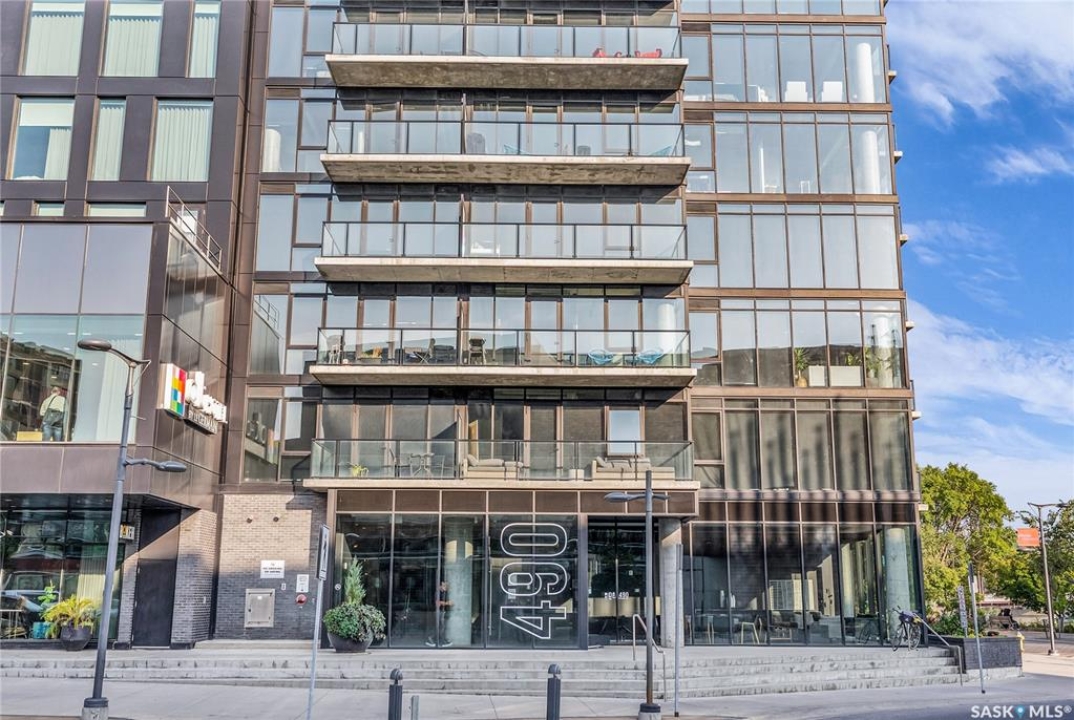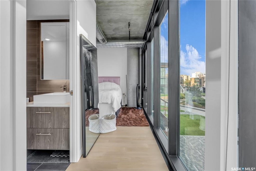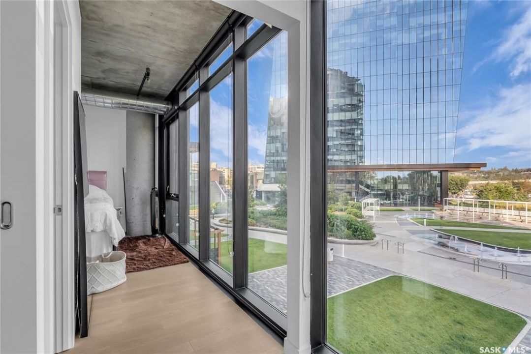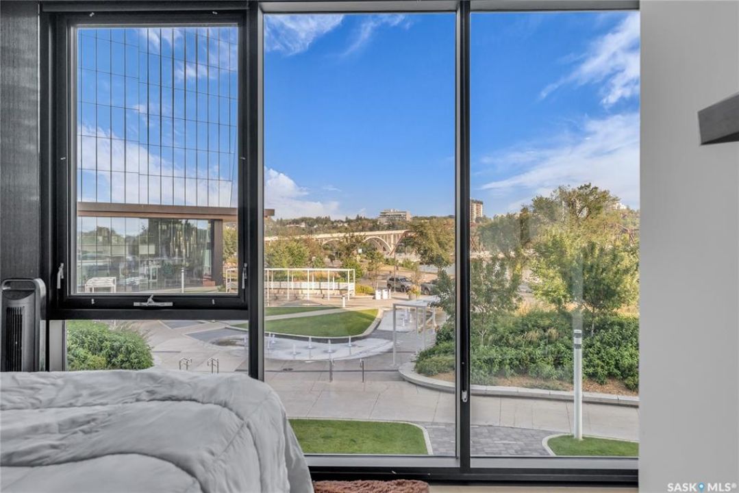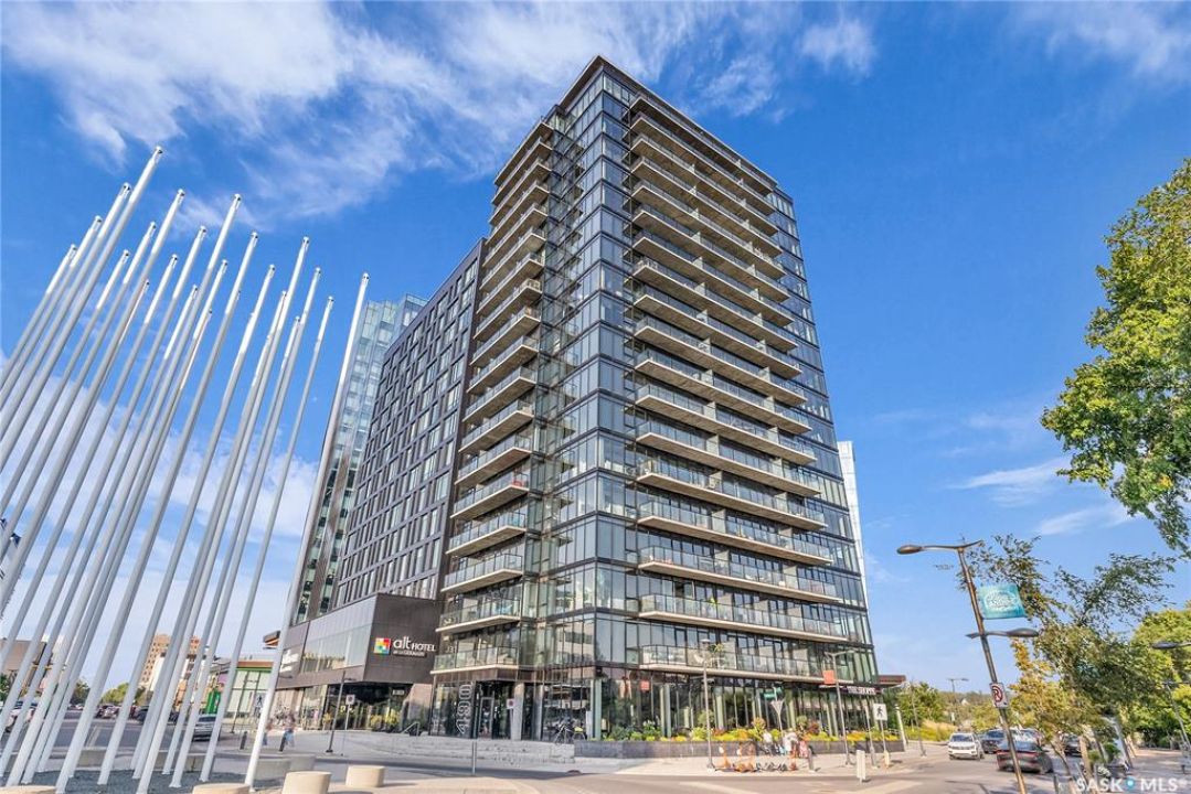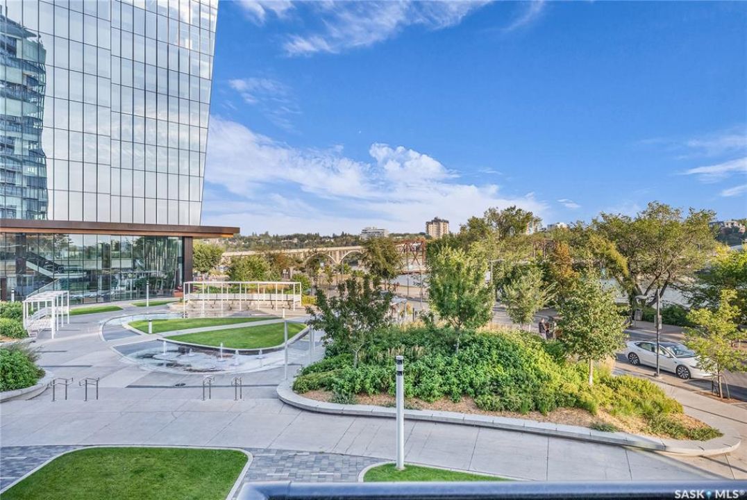 This stunning New York loft style condo at prestigious No 1 River Landing is a great investment opportunity! One of only 2 of the Unique floor plans (1 bed, 2 baths) in the building. East facing location overlooking both the fountains of Nasser Place and the river. Lots of natural light, European style kitchen with quartz counter tops and stainless steel appliances. In suite laundry, window treatments, hardwood flooring and sliding barn doors. Primary bedroom features custom closet the length of the wall. Gorgeous lobby and amenities room, and state of the art gym all overlooking the river. In the heart of downtown next to the Remai Modern Art Gallery. Walking distance to shops, dining and amenities the downtown has to offer! Current tenant would stay if buyer would like an investment opportunity considering all of the potential downtown development including a possible new arena!! This is a MUST SEE!