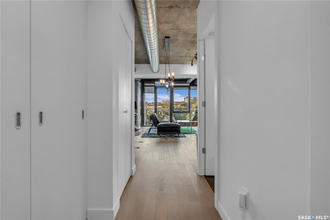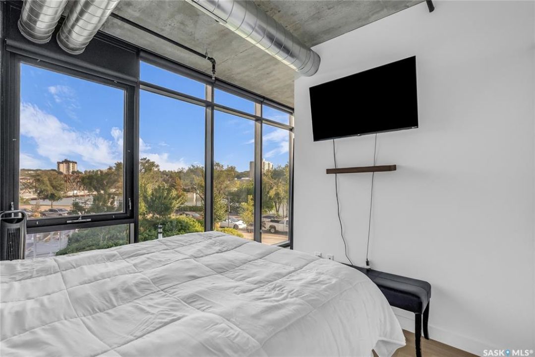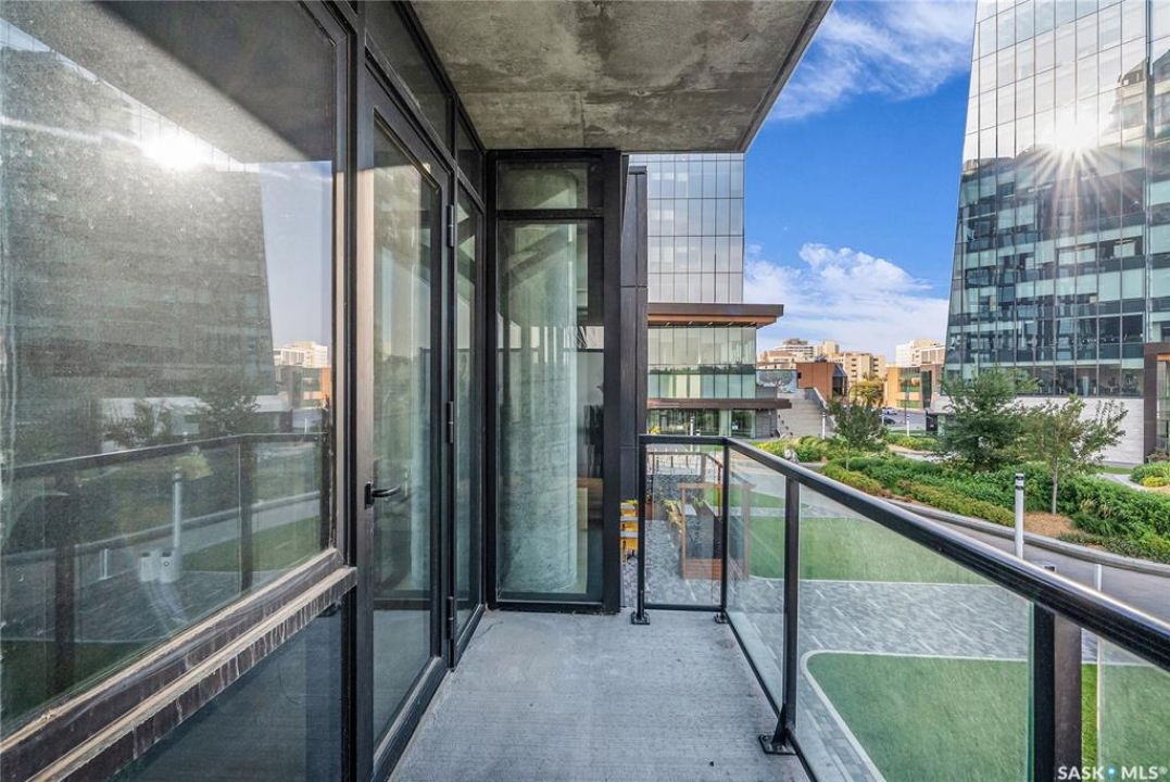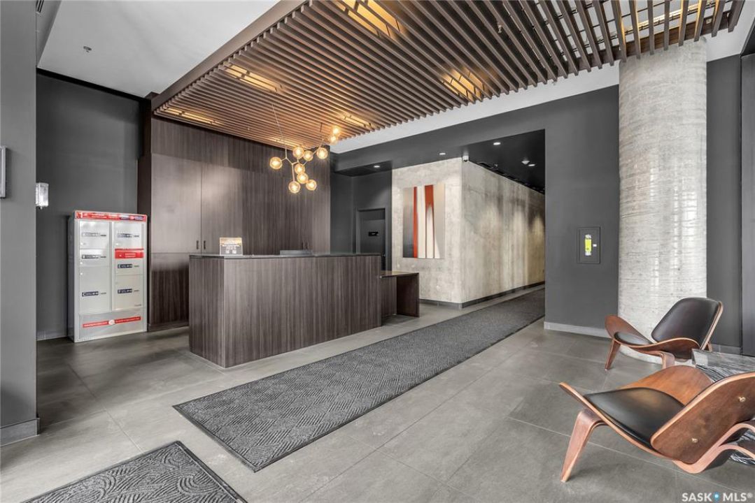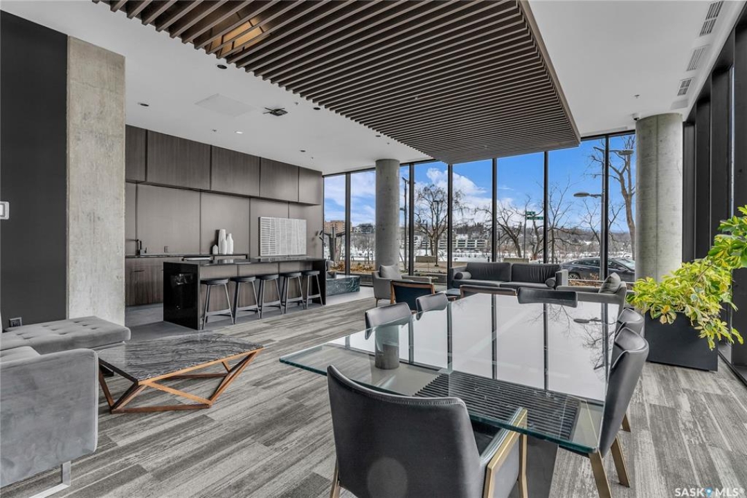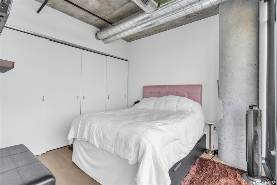 This stunning New York loft style condo at prestigious No 1 River Landing is a great investment opportunity! One of only 2 of the Unique floor plans (1 bed, 2 baths) in the building. East facing location overlooking both the fountains of Nasser Place and the river. Lots of natural light, European style kitchen with quartz counter tops and stainless steel appliances. In suite laundry, window treatments, hardwood flooring and sliding barn doors. Primary bedroom features custom closet the length of the wall. Gorgeous lobby and amenities room, and state of the art gym all overlooking the river. In the heart of downtown next to the Remai Modern Art Gallery. Walking distance to shops, dining and amenities the downtown has to offer! Current tenant would stay if buyer would like an investment opportunity considering all of the potential downtown development including a possible new arena!! This is a MUST SEE!