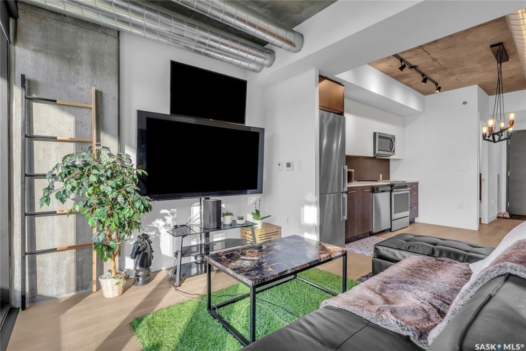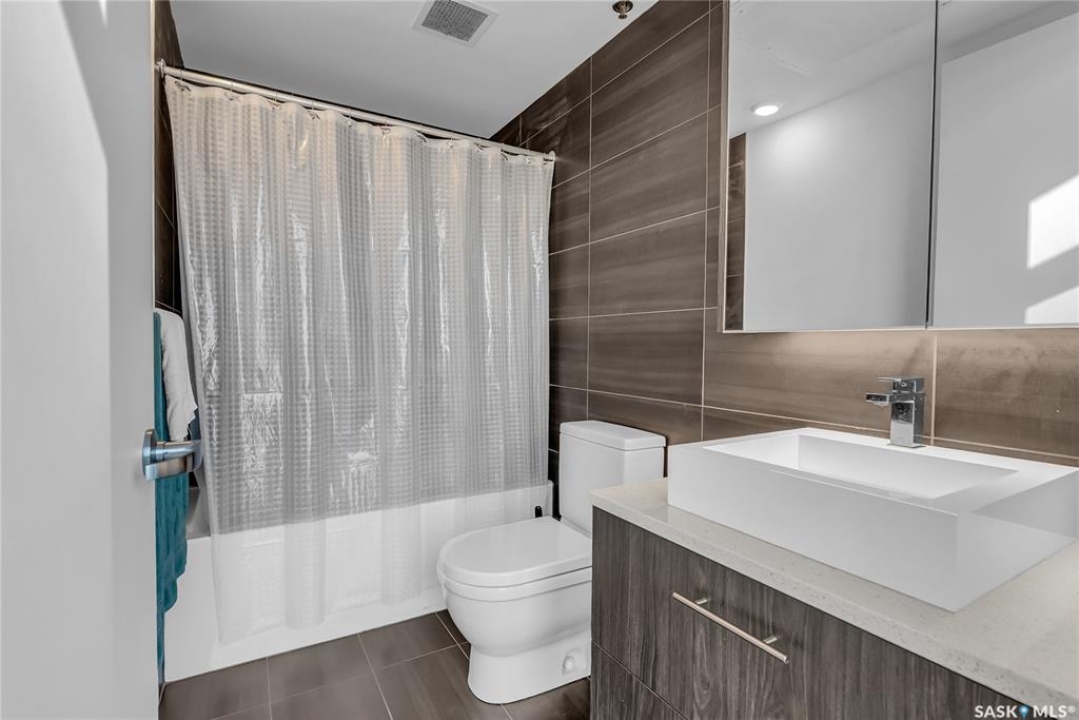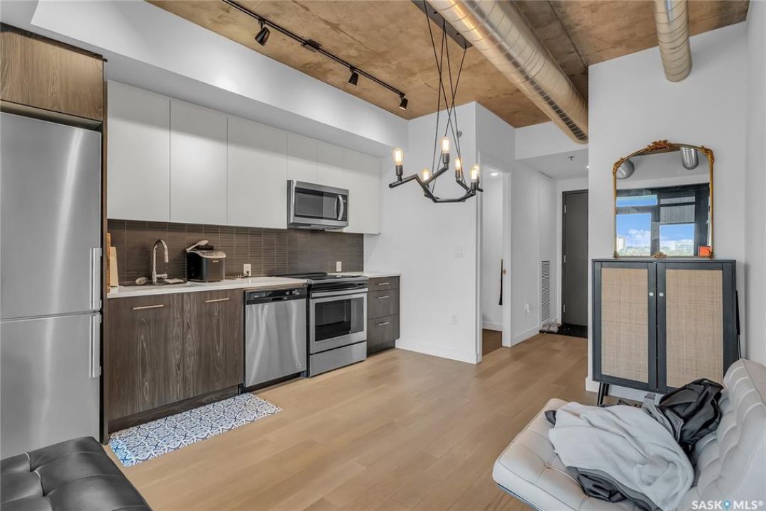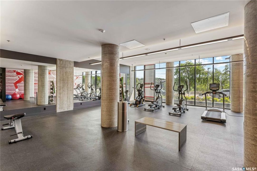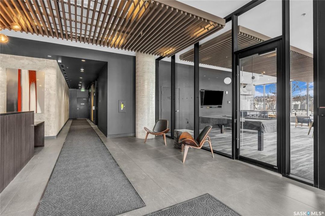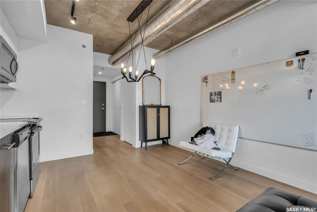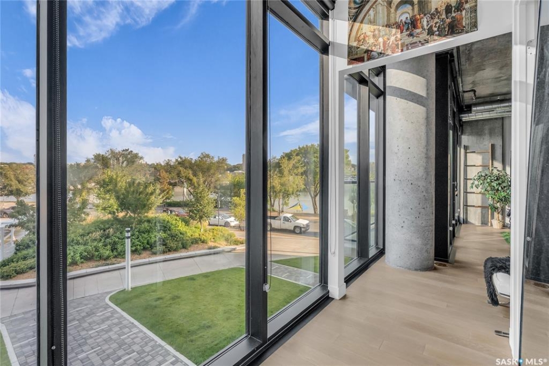 This stunning New York loft style condo at prestigious No 1 River Landing is a great investment opportunity! One of only 2 of the Unique floor plans (1 bed, 2 baths) in the building. East facing location overlooking both the fountains of Nasser Place and the river. Lots of natural light, European style kitchen with quartz counter tops and stainless steel appliances. In suite laundry, window treatments, hardwood flooring and sliding barn doors. Primary bedroom features custom closet the length of the wall. Gorgeous lobby and amenities room, and state of the art gym all overlooking the river. In the heart of downtown next to the Remai Modern Art Gallery. Walking distance to shops, dining and amenities the downtown has to offer! Current tenant would stay if buyer would like an investment opportunity considering all of the potential downtown development including a possible new arena!! This is a MUST SEE!