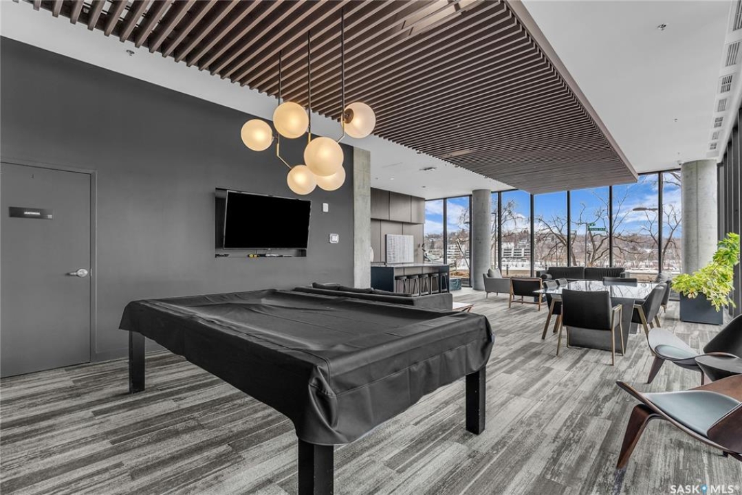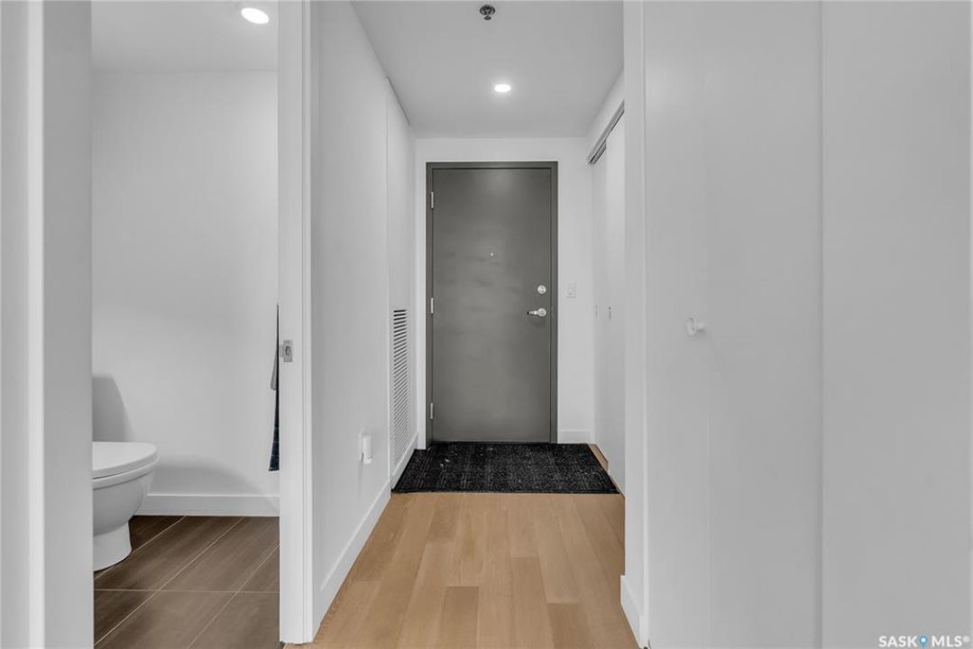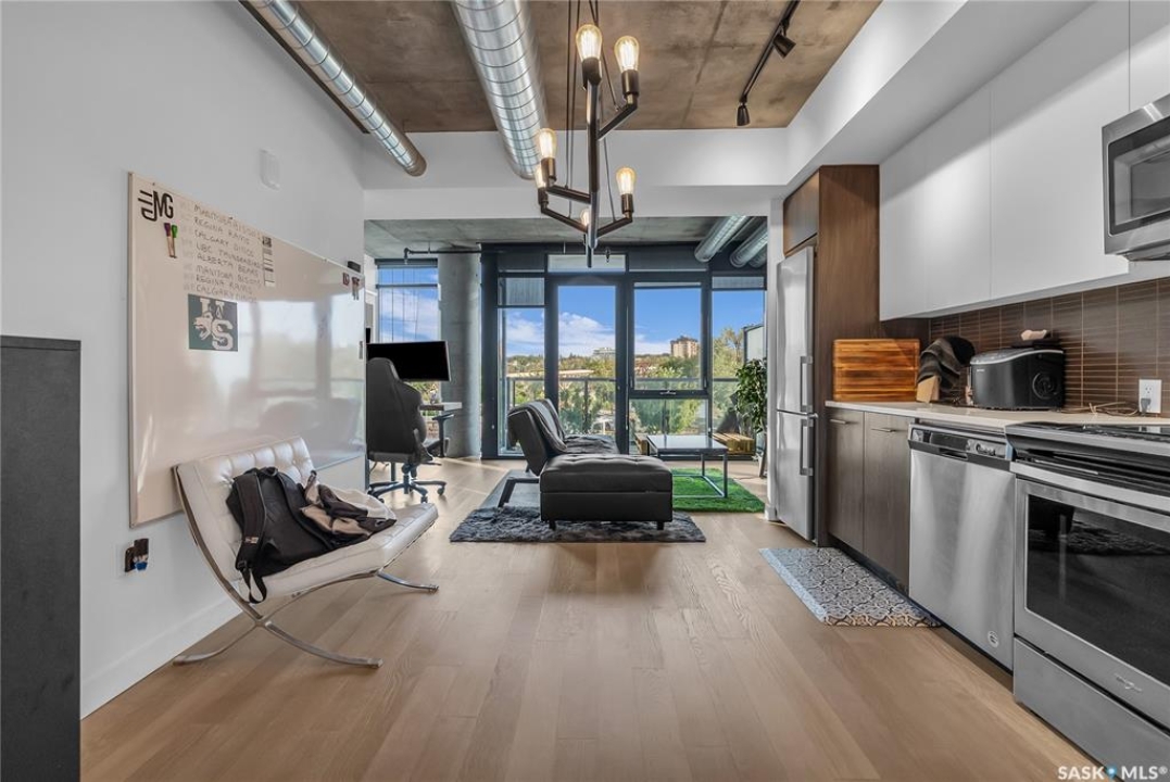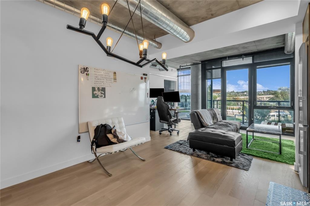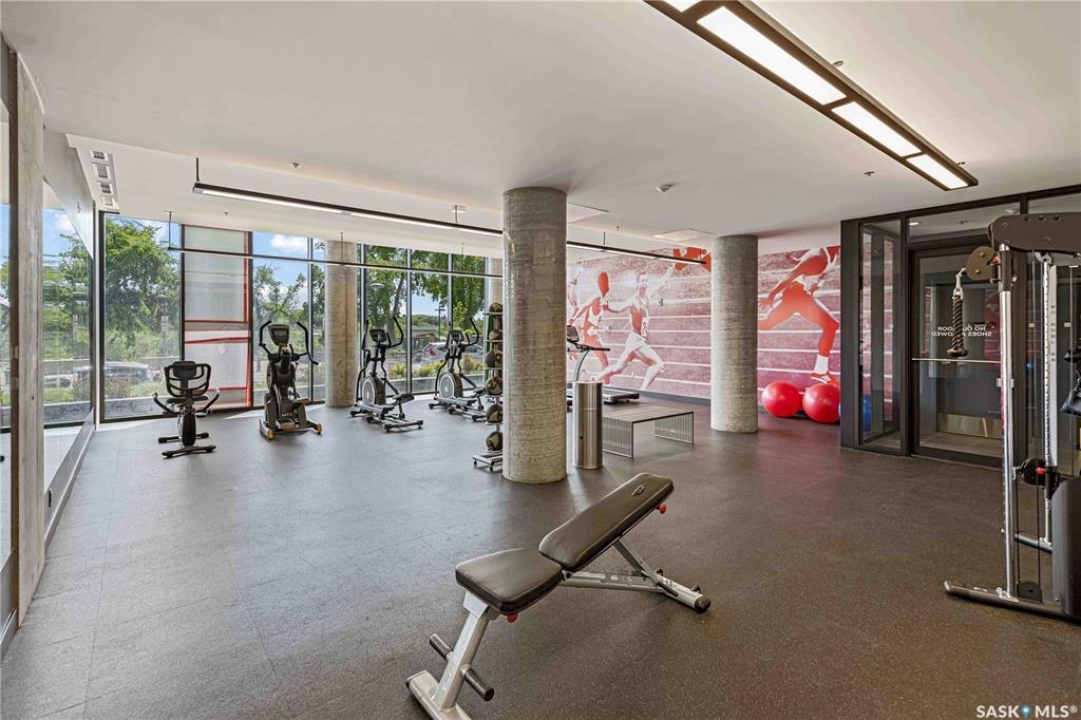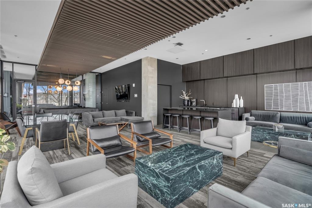 This stunning New York loft style condo at prestigious No 1 River Landing is a great investment opportunity! One of only 2 of the Unique floor plans (1 bed, 2 baths) in the building. East facing location overlooking both the fountains of Nasser Place and the river. Lots of natural light, European style kitchen with quartz counter tops and stainless steel appliances. In suite laundry, window treatments, hardwood flooring and sliding barn doors. Primary bedroom features custom closet the length of the wall. Gorgeous lobby and amenities room, and state of the art gym all overlooking the river. In the heart of downtown next to the Remai Modern Art Gallery. Walking distance to shops, dining and amenities the downtown has to offer! Current tenant would stay if buyer would like an investment opportunity considering all of the potential downtown development including a possible new arena!! This is a MUST SEE!