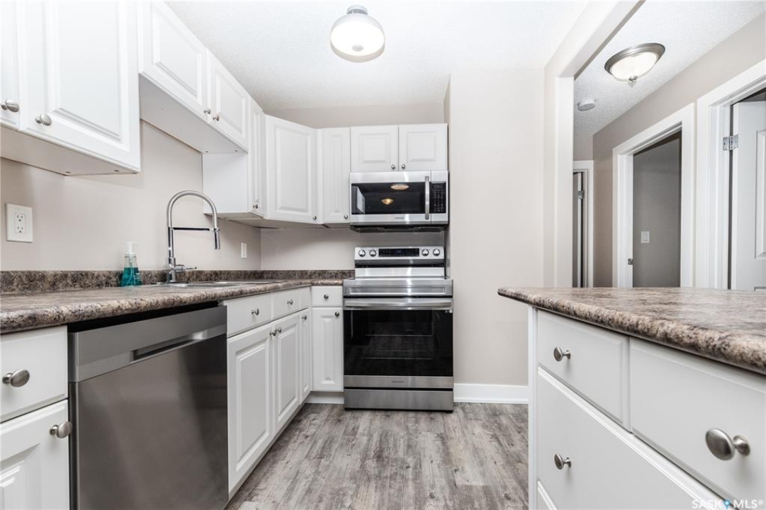 This beautifully updated top-floor 2-bedroom condo in Wildwood is perfect for homeowners or investors alike. Featuring a custom open-concept layout and some high-end finishes including luxury vinyl plank , new carpet with memory foam underlay and new tile, upgraded windows, patio door, doors, trim, and a full paint job (2021). The kitchen includes new stainless steel appliances and is roughed-in for a waterline for a different fridge if desired. Bedrooms offer built-in organizers and ample storage. Other upgrades: new A/C (2021), refinished deck, custom entryway closet. Well-managed building with strong reserve fund, new boiler, upgraded security system and cameras, repaved parking lot, and professional snow removal/lawn care. Pets allowed (with restrictions). Includes private electrified parking stall (visible from unit); extra parking and street parking available. There is an opportunity for a new buyer to possibly rent another electrified stall for $25/month. This is not included but they are often available. This building is located just off 8th Street—steps to trails, a pond, bus routes, shopping, and golf. Only extra bills: power & internet. Move-in ready!