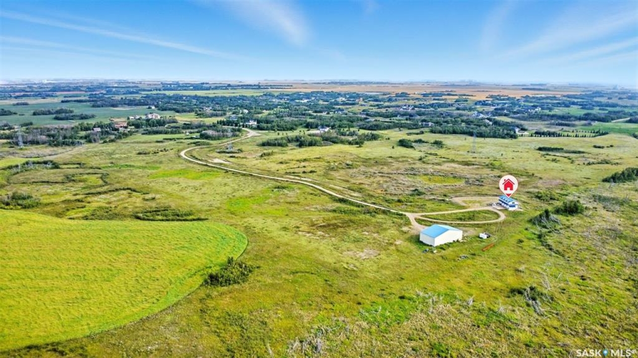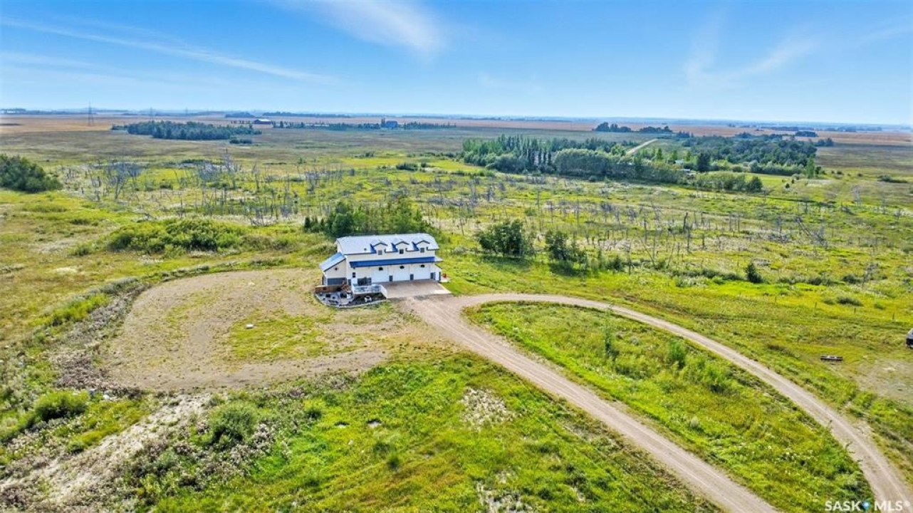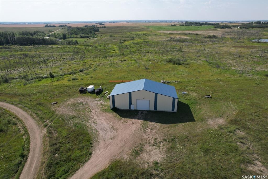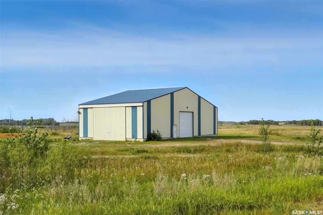 This 80-acre property, located just 5 km from Saskatoon and directly off a paved road, offers a rare combination of privacy, prime location, and future development potential. Providing the perfect balance of seclusion and convenience, it is tucked away from surrounding properties, among the desirable Hidden Ridge Estates acreages. The property features a Carriage house, 1232 sq. ft. residence with an open-concept, loft-style design. The three-car (24'x36')heated garage also serves as utility room for drip system holding tank, HWT and connects to an indoor kennel and dog run. There is a spacious mudroom, 2 pc bathroom and office/laundry on the ground floor. The second floor features an open concept kitchen/ dining room and spacious living room with great views of the property. The primary bedroom has lots of space for another work space. In the evening, the Saskatoon city lights provide a spectacular view of the western sky. Additionally, there is a 40' x 80' shop divided into 3 sections. The center section is fully equipped with in-floor heating, power and roughed in plumbing and two side storage sections are used for cold storage, providing ample space for business operations, hobbies, or equipment storage. The property also has perimeter fencing. Zoned D-Agricultural District (DAG1), this parcel benefits from low taxes and offers a variety of discretionary uses, including residential, livestock, equestrian, bed and breakfast or a home-based business. The property also has potential for subdivision and development within the P4G planning district. The zoning allows for multi-parcel residential subdivision. This makes it an excellent opportunity for developers or use as a potential investment for future resale. This acreage combines a private, peaceful setting with easy access to urban amenities. Call today