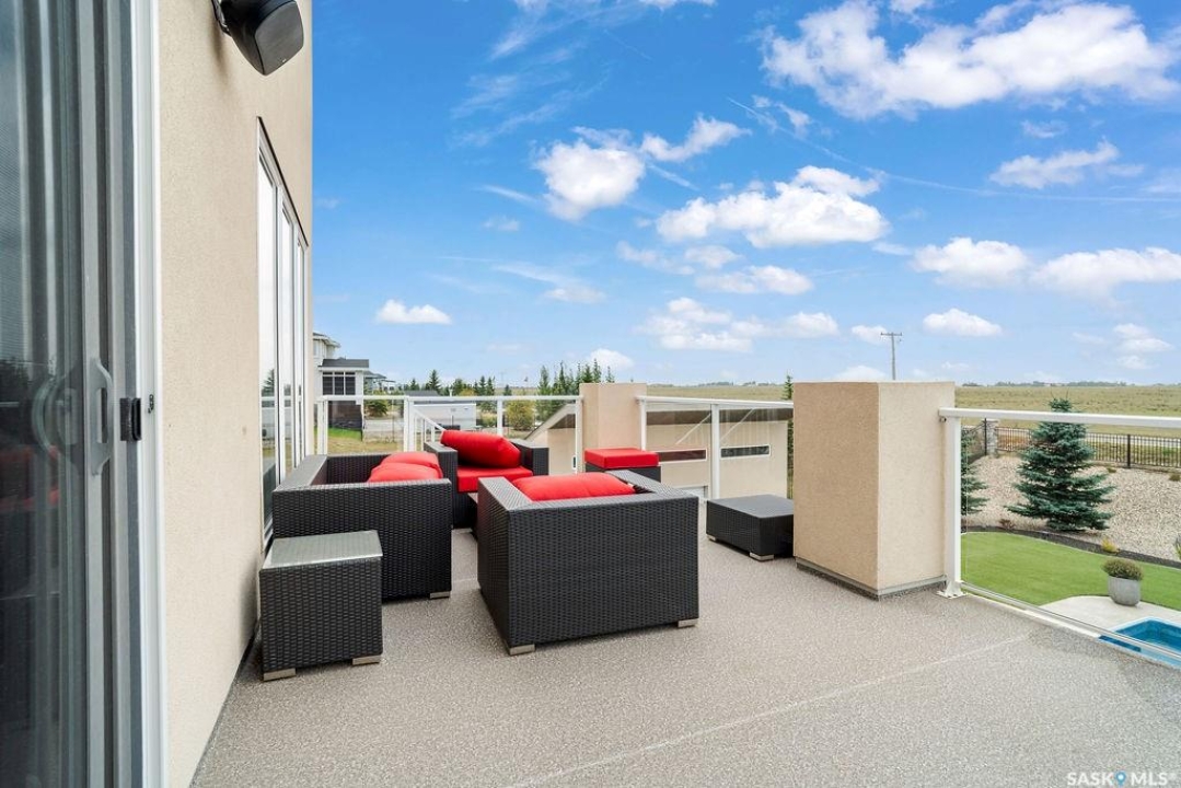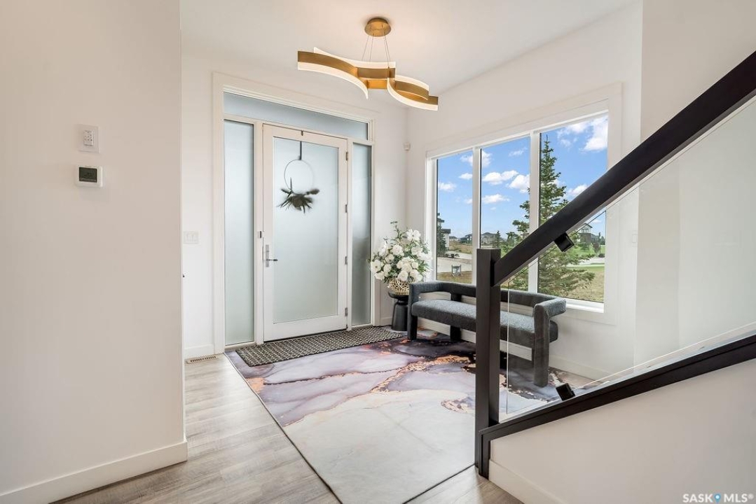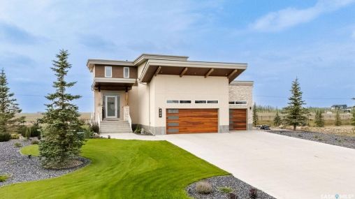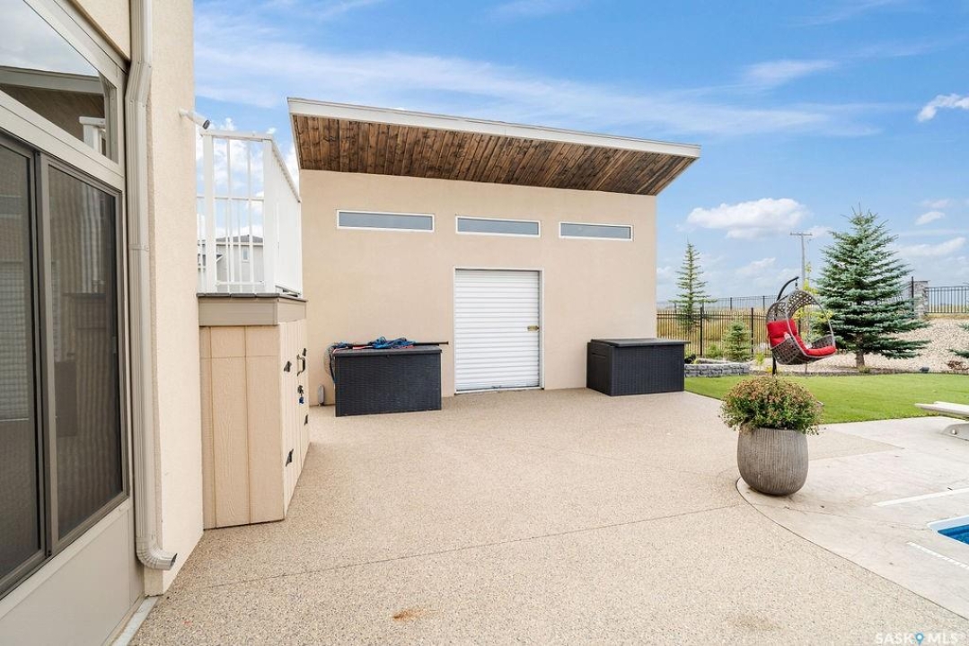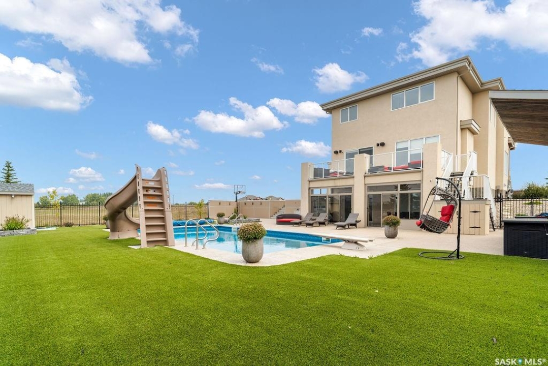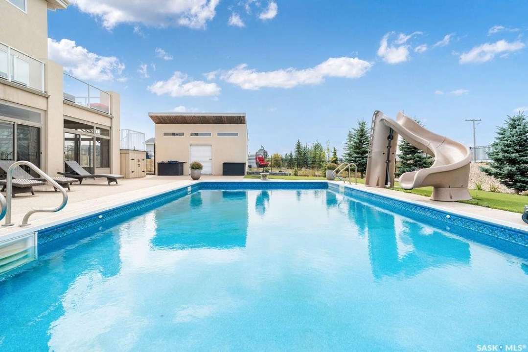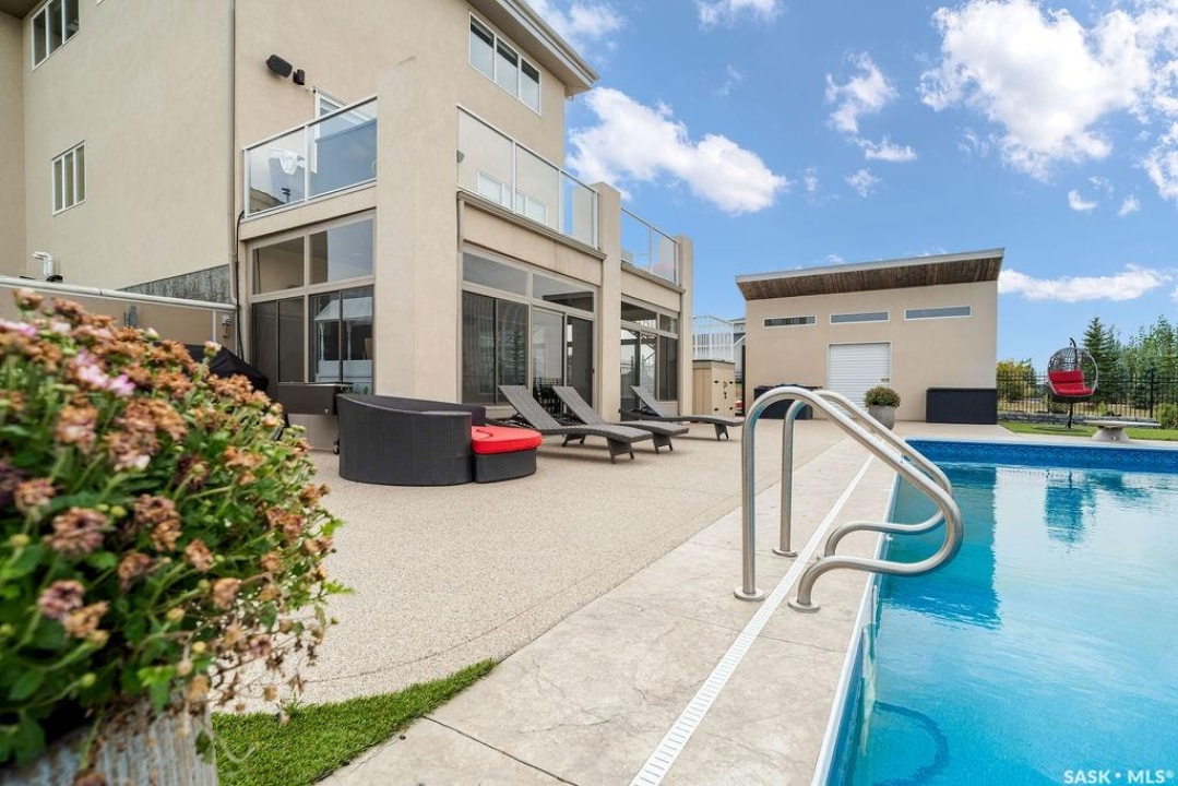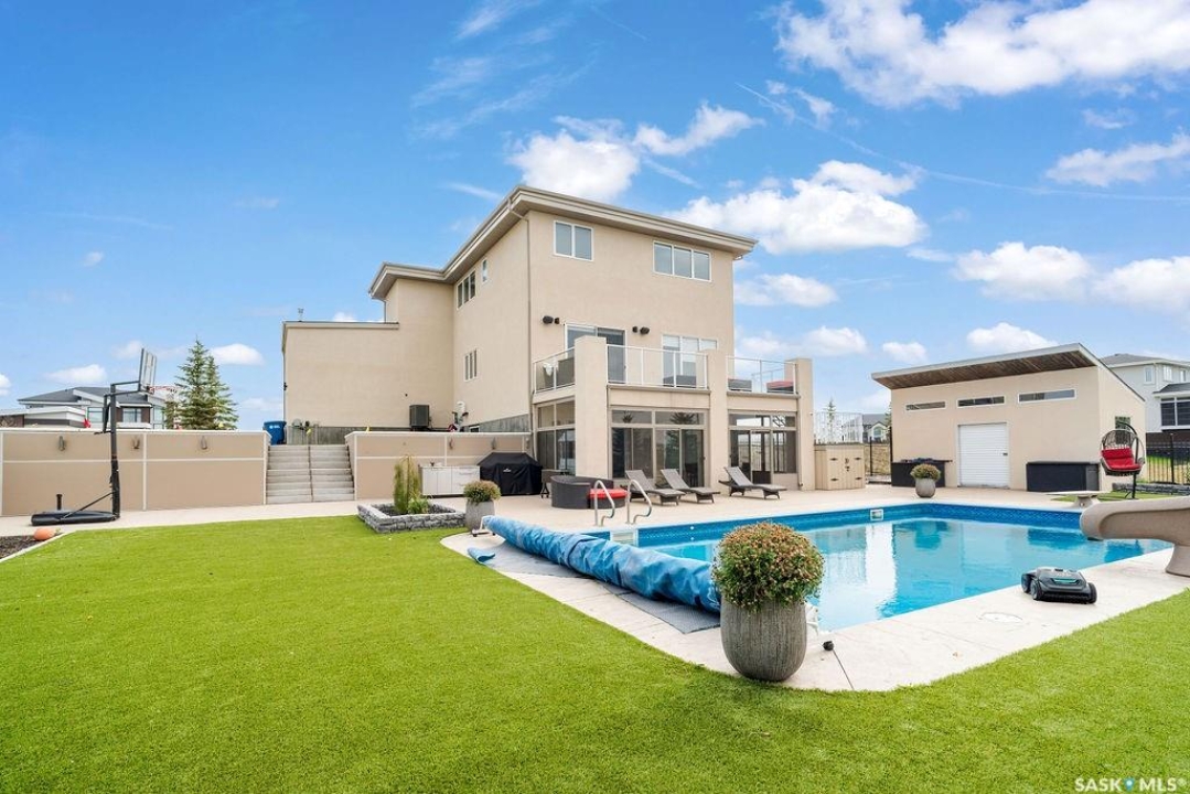 Luxury Living in Spruce Creek Estates – Pool, Walkout, Triple Garage This exquisite two-storey 2018 Stars Lottery Home, is located in the prestigious community just minutes east of Regina. From the moment you arrive, the curb appeal captivates with modern architecture, cedar and stone accents, and beautifully manicured landscaping. Inside, the open-concept design strikes the perfect balance between luxury and comfort. The chef's kitchen makes a bold statement with crisp white lower cabinets, sleek black glass uppers, quartz countertops, and a huge island, providing both function and style. The living room, anchored by a gas fireplace, flows seamlessly into the dining room, which opens onto the deck where you can enjoy breathtaking Saskatchewan sunsets. Upstairs, the home continues to impress with 3 bedrooms and a bonus room enhanced with a custom JMS mural wall. The Primary suite has been beautifully updated, it is spacious, has a walk in closet and 5 piece ensuite. With chic tiled floors, updated cabinetry, a custom-tiled shower, a stand-alone soaker tub, and double sinks, this retreat feels like a luxury spa within your own home. The 2nd floor also features a full bathroom and laundry room. The fully developed walkout basement is perfect for entertaining or family time, with a gas fireplace in the family room, wet bar, 4th bedroom, bathroom, and spacious sunroom making it an ideal extension of your living space. Stepping outside, you'll find a private backyard oasis designed for both relaxation and fun. A raised deck and patio overlook lush green space, putting green, and in-ground pool. Everything you need to enjoy hot Saskatchewan summers. The triple attached garage has 12-foot ceilings, epoxy-coated floors, and is heated. With in-floor heating in the basement, newer flooring, cabinetry, paint, & lighting throughout, as well as a home audio system and a fully fenced and landscaped 1/2 lot, this home delivers executive style with everyday comfort.