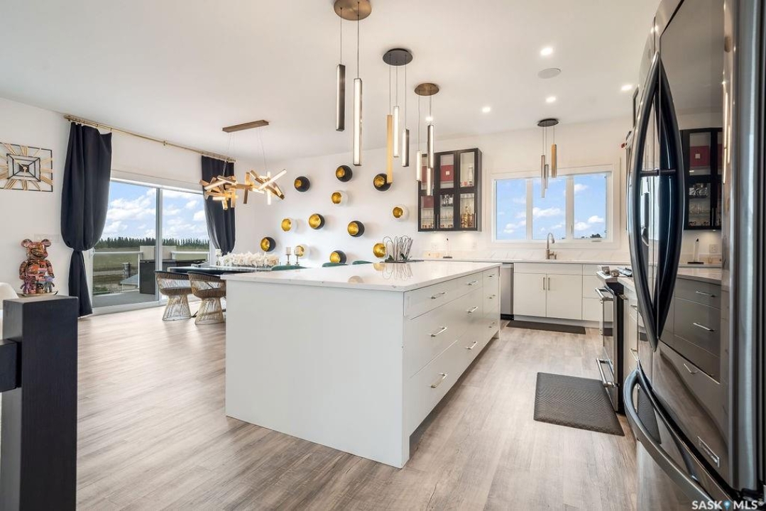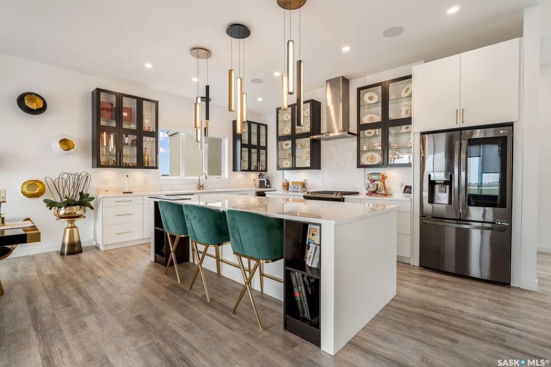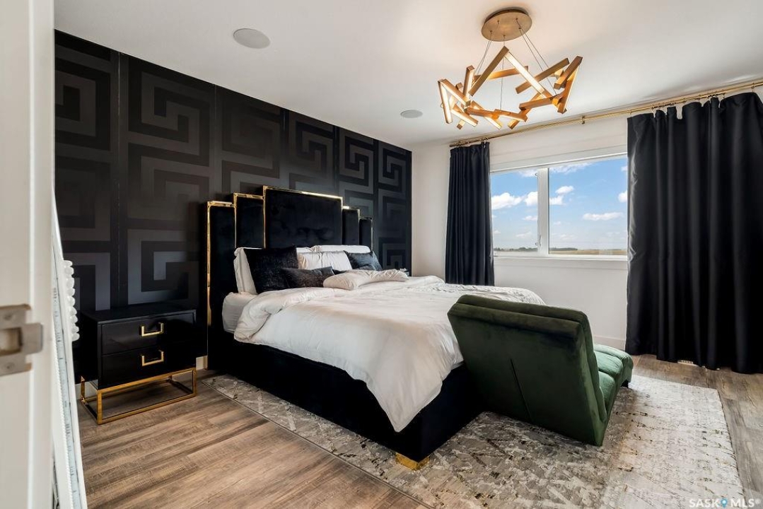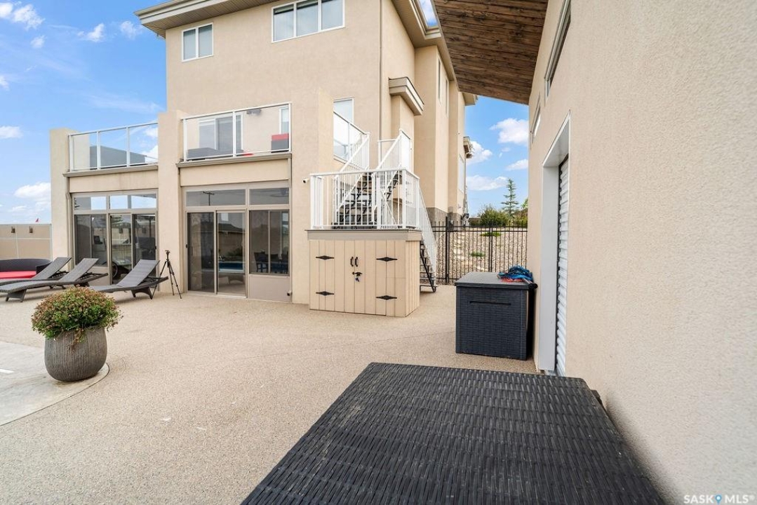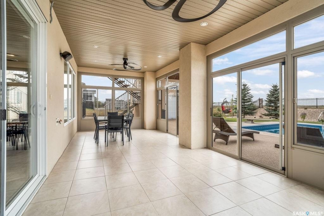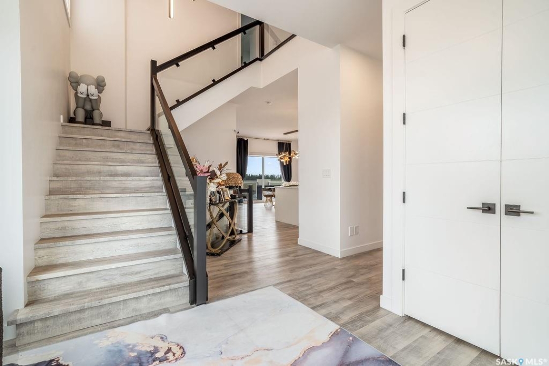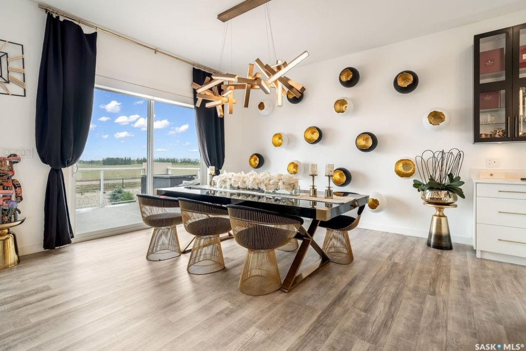 Luxury Living in Spruce Creek Estates – Pool, Walkout, Triple Garage This exquisite two-storey 2018 Stars Lottery Home, is located in the prestigious community just minutes east of Regina. From the moment you arrive, the curb appeal captivates with modern architecture, cedar and stone accents, and beautifully manicured landscaping. Inside, the open-concept design strikes the perfect balance between luxury and comfort. The chef's kitchen makes a bold statement with crisp white lower cabinets, sleek black glass uppers, quartz countertops, and a huge island, providing both function and style. The living room, anchored by a gas fireplace, flows seamlessly into the dining room, which opens onto the deck where you can enjoy breathtaking Saskatchewan sunsets. Upstairs, the home continues to impress with 3 bedrooms and a bonus room enhanced with a custom JMS mural wall. The Primary suite has been beautifully updated, it is spacious, has a walk in closet and 5 piece ensuite. With chic tiled floors, updated cabinetry, a custom-tiled shower, a stand-alone soaker tub, and double sinks, this retreat feels like a luxury spa within your own home. The 2nd floor also features a full bathroom and laundry room. The fully developed walkout basement is perfect for entertaining or family time, with a gas fireplace in the family room, wet bar, 4th bedroom, bathroom, and spacious sunroom making it an ideal extension of your living space. Stepping outside, you'll find a private backyard oasis designed for both relaxation and fun. A raised deck and patio overlook lush green space, putting green, and in-ground pool. Everything you need to enjoy hot Saskatchewan summers. The triple attached garage has 12-foot ceilings, epoxy-coated floors, and is heated. With in-floor heating in the basement, newer flooring, cabinetry, paint, & lighting throughout, as well as a home audio system and a fully fenced and landscaped 1/2 lot, this home delivers executive style with everyday comfort.