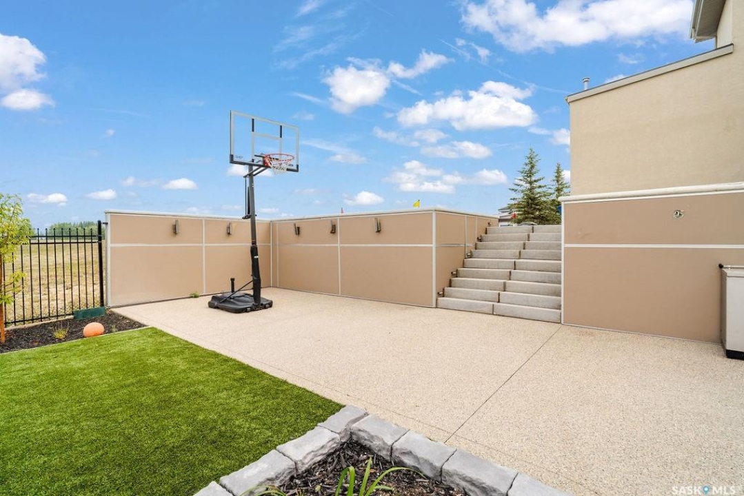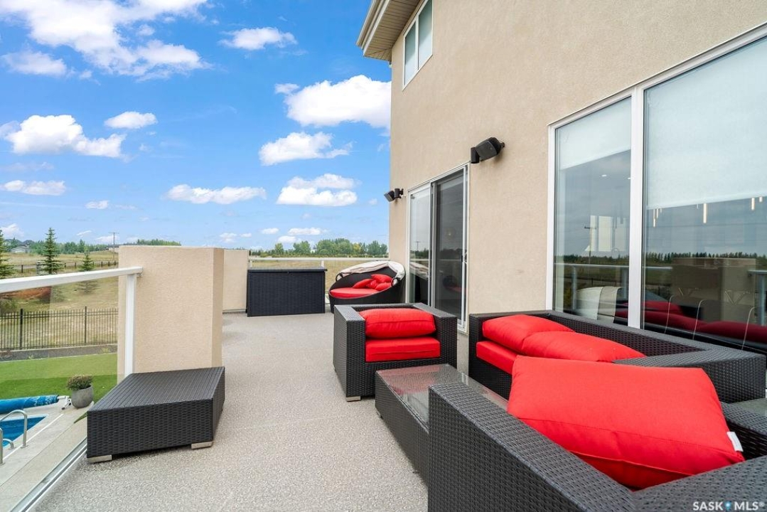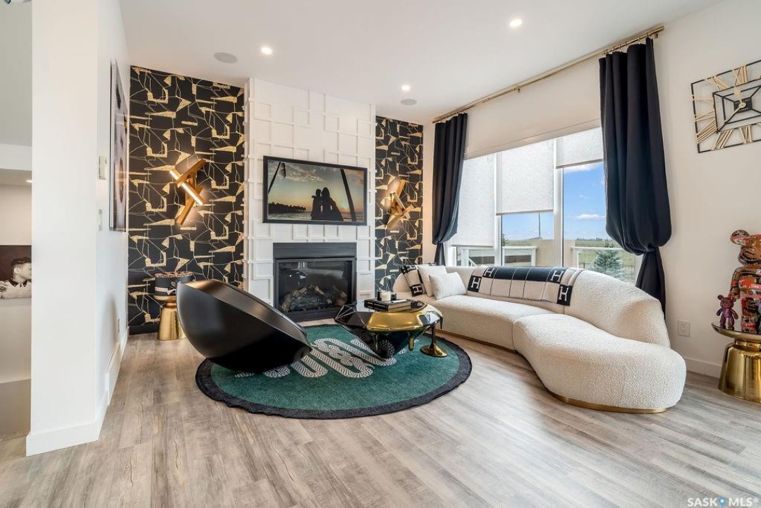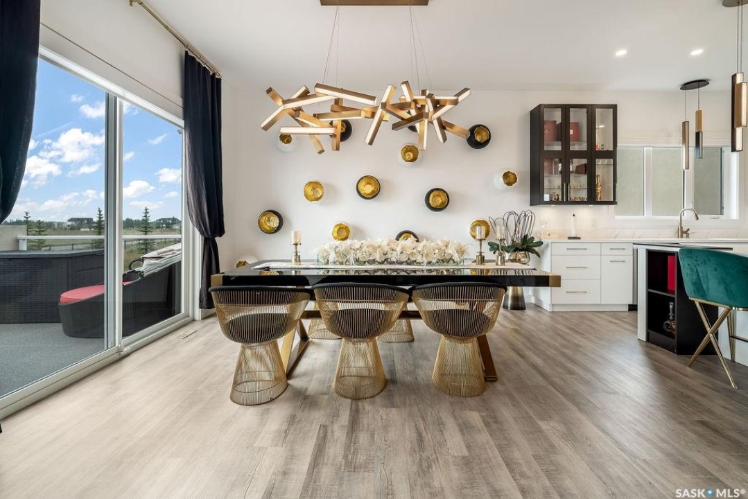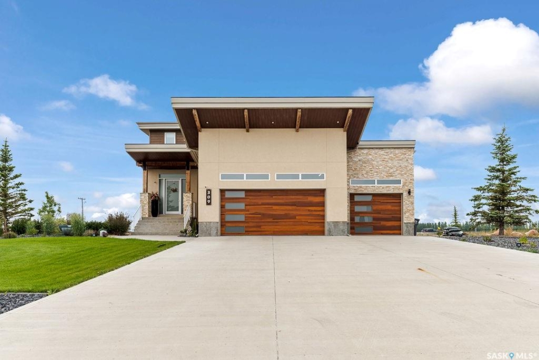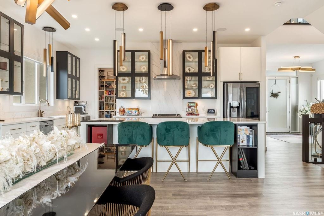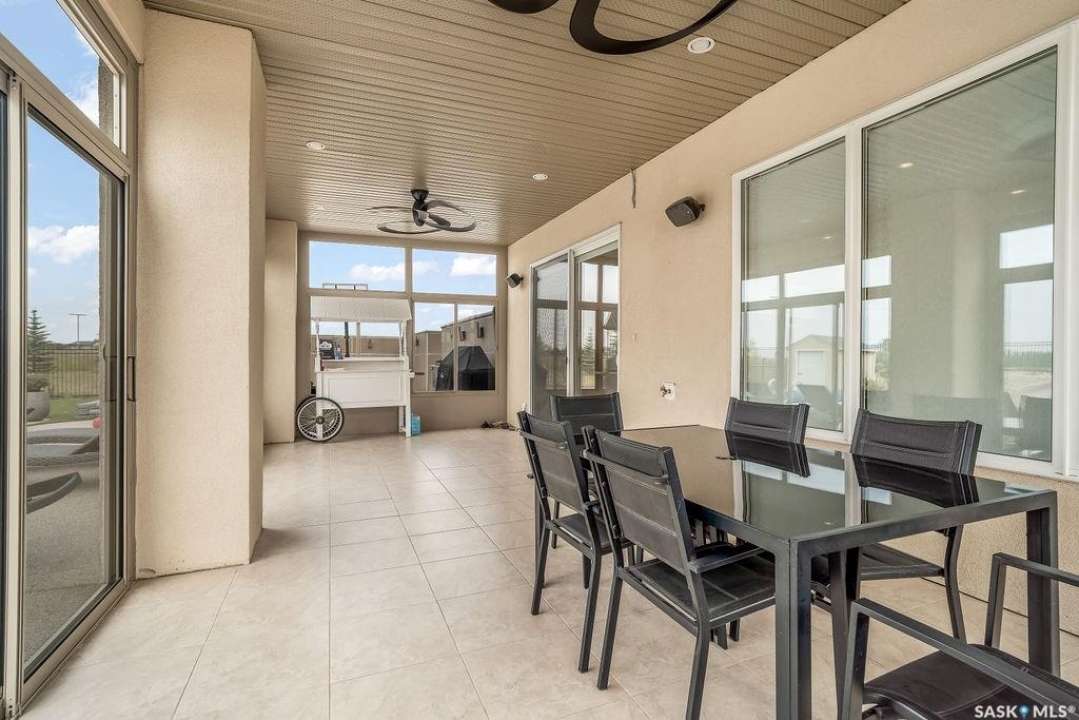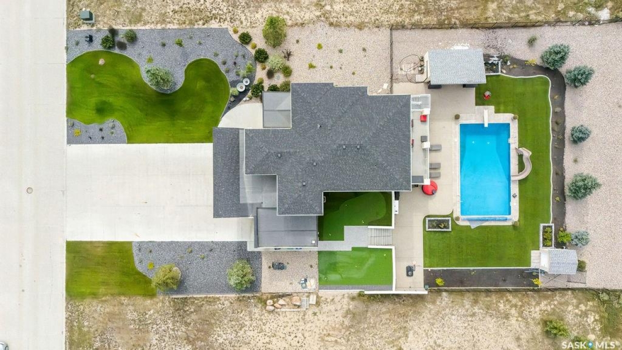 Luxury Living in Spruce Creek Estates – Pool, Walkout, Triple Garage This exquisite two-storey 2018 Stars Lottery Home, is located in the prestigious community just minutes east of Regina. From the moment you arrive, the curb appeal captivates with modern architecture, cedar and stone accents, and beautifully manicured landscaping. Inside, the open-concept design strikes the perfect balance between luxury and comfort. The chef's kitchen makes a bold statement with crisp white lower cabinets, sleek black glass uppers, quartz countertops, and a huge island, providing both function and style. The living room, anchored by a gas fireplace, flows seamlessly into the dining room, which opens onto the deck where you can enjoy breathtaking Saskatchewan sunsets. Upstairs, the home continues to impress with 3 bedrooms and a bonus room enhanced with a custom JMS mural wall. The Primary suite has been beautifully updated, it is spacious, has a walk in closet and 5 piece ensuite. With chic tiled floors, updated cabinetry, a custom-tiled shower, a stand-alone soaker tub, and double sinks, this retreat feels like a luxury spa within your own home. The 2nd floor also features a full bathroom and laundry room. The fully developed walkout basement is perfect for entertaining or family time, with a gas fireplace in the family room, wet bar, 4th bedroom, bathroom, and spacious sunroom making it an ideal extension of your living space. Stepping outside, you'll find a private backyard oasis designed for both relaxation and fun. A raised deck and patio overlook lush green space, putting green, and in-ground pool. Everything you need to enjoy hot Saskatchewan summers. The triple attached garage has 12-foot ceilings, epoxy-coated floors, and is heated. With in-floor heating in the basement, newer flooring, cabinetry, paint, & lighting throughout, as well as a home audio system and a fully fenced and landscaped 1/2 lot, this home delivers executive style with everyday comfort.