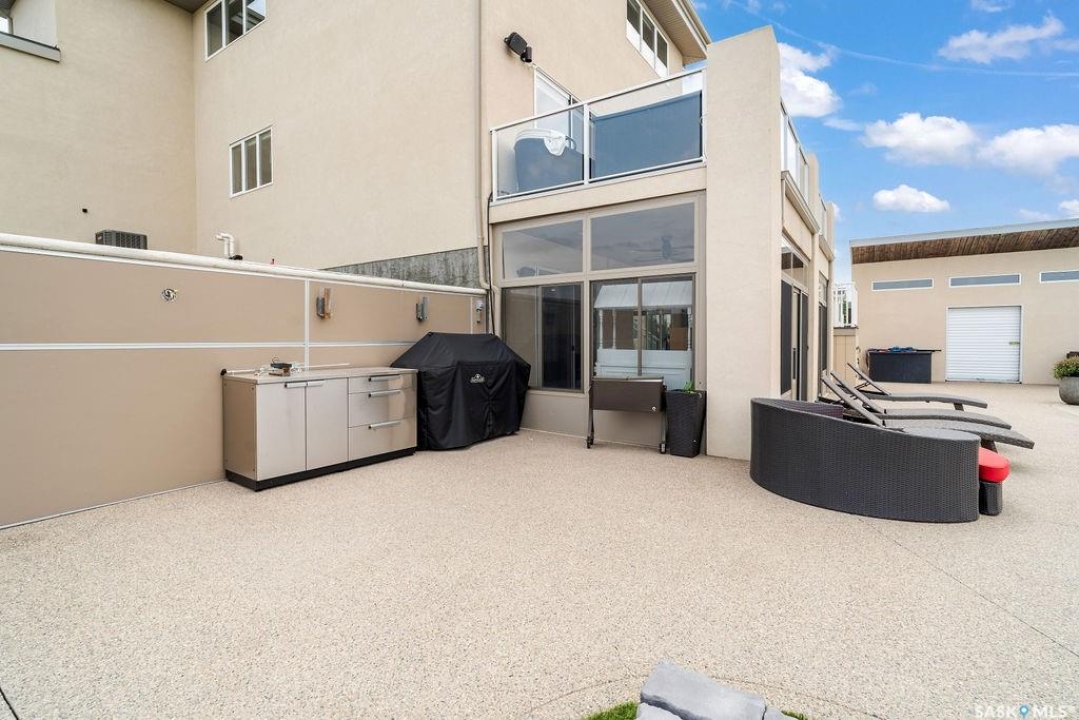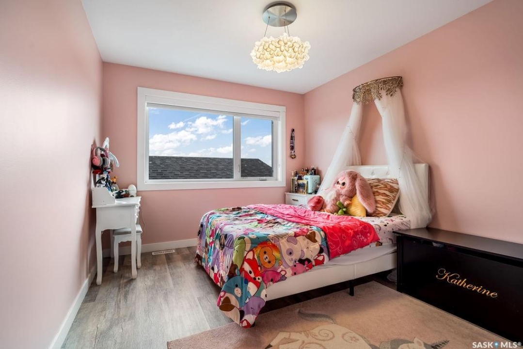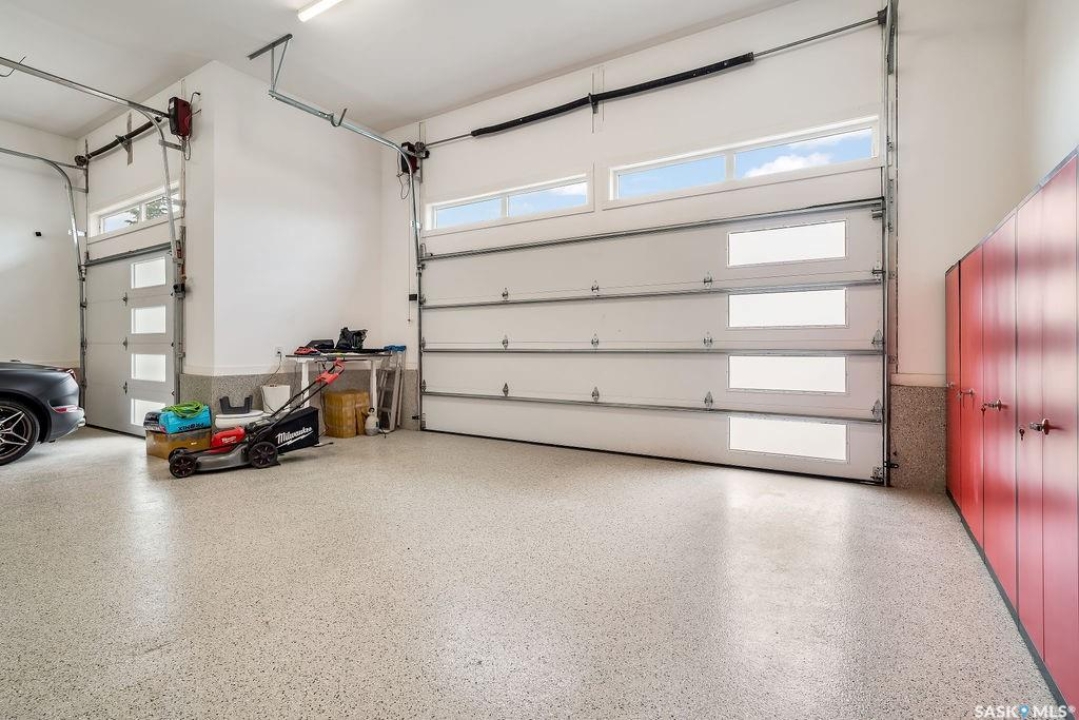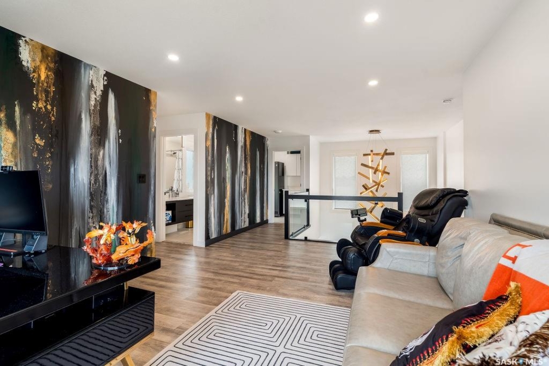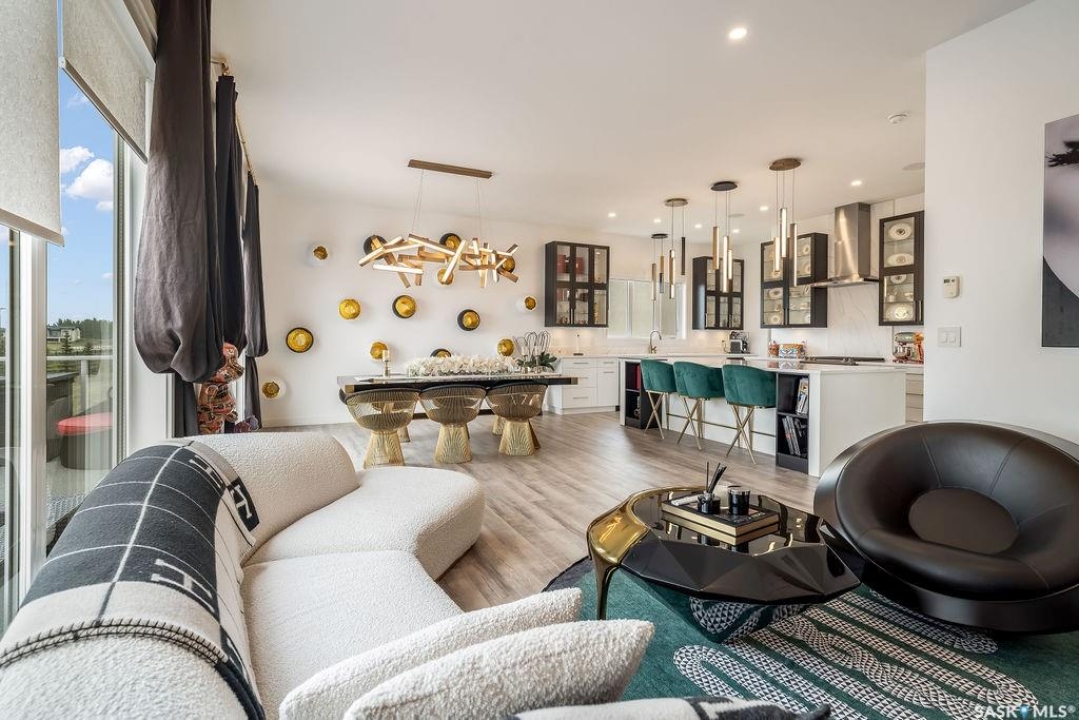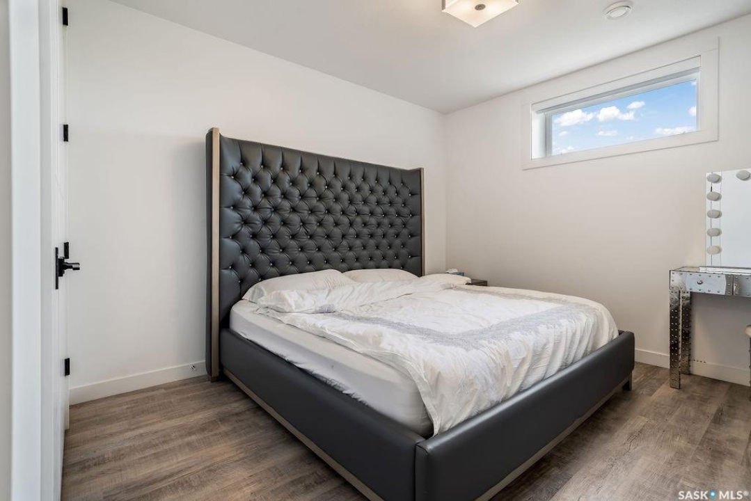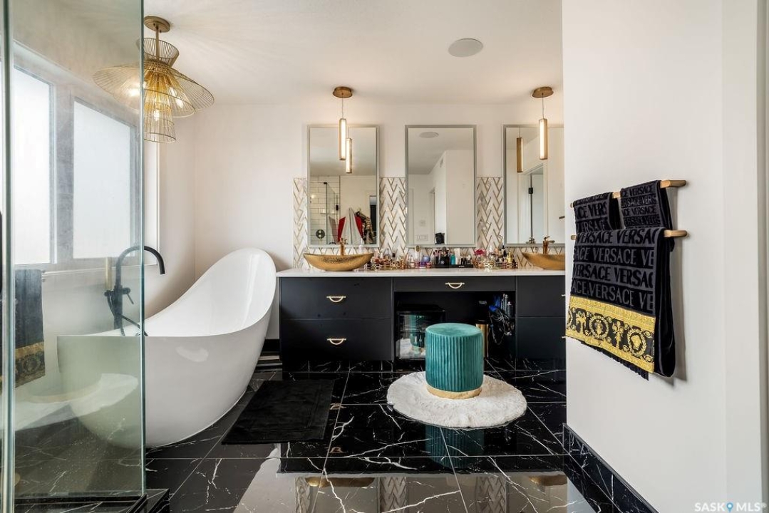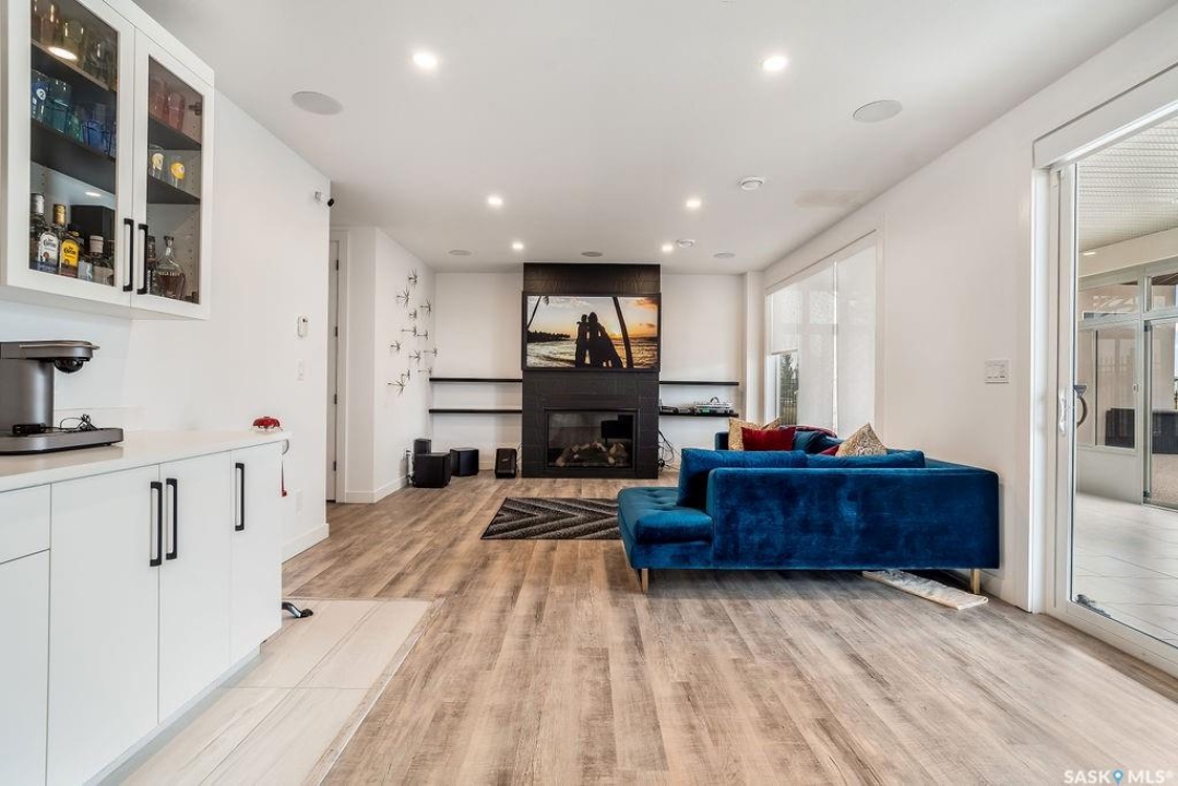 Luxury Living in Spruce Creek Estates – Pool, Walkout, Triple Garage This exquisite two-storey 2018 Stars Lottery Home, is located in the prestigious community just minutes east of Regina. From the moment you arrive, the curb appeal captivates with modern architecture, cedar and stone accents, and beautifully manicured landscaping. Inside, the open-concept design strikes the perfect balance between luxury and comfort. The chef's kitchen makes a bold statement with crisp white lower cabinets, sleek black glass uppers, quartz countertops, and a huge island, providing both function and style. The living room, anchored by a gas fireplace, flows seamlessly into the dining room, which opens onto the deck where you can enjoy breathtaking Saskatchewan sunsets. Upstairs, the home continues to impress with 3 bedrooms and a bonus room enhanced with a custom JMS mural wall. The Primary suite has been beautifully updated, it is spacious, has a walk in closet and 5 piece ensuite. With chic tiled floors, updated cabinetry, a custom-tiled shower, a stand-alone soaker tub, and double sinks, this retreat feels like a luxury spa within your own home. The 2nd floor also features a full bathroom and laundry room. The fully developed walkout basement is perfect for entertaining or family time, with a gas fireplace in the family room, wet bar, 4th bedroom, bathroom, and spacious sunroom making it an ideal extension of your living space. Stepping outside, you'll find a private backyard oasis designed for both relaxation and fun. A raised deck and patio overlook lush green space, putting green, and in-ground pool. Everything you need to enjoy hot Saskatchewan summers. The triple attached garage has 12-foot ceilings, epoxy-coated floors, and is heated. With in-floor heating in the basement, newer flooring, cabinetry, paint, & lighting throughout, as well as a home audio system and a fully fenced and landscaped 1/2 lot, this home delivers executive style with everyday comfort.