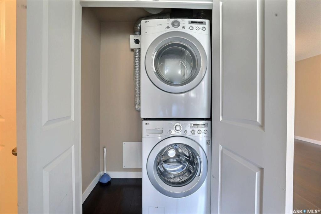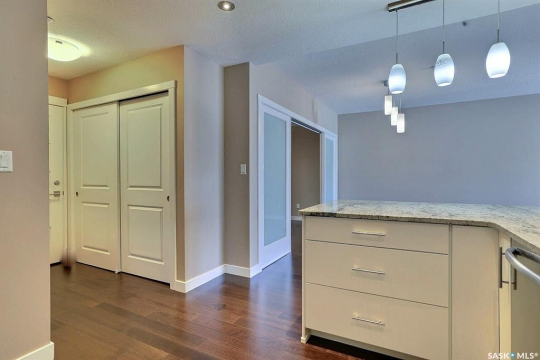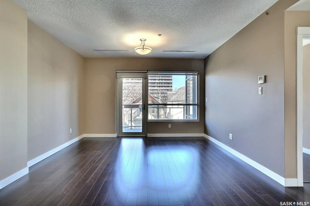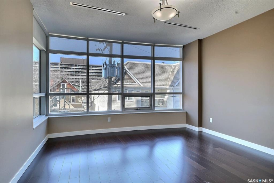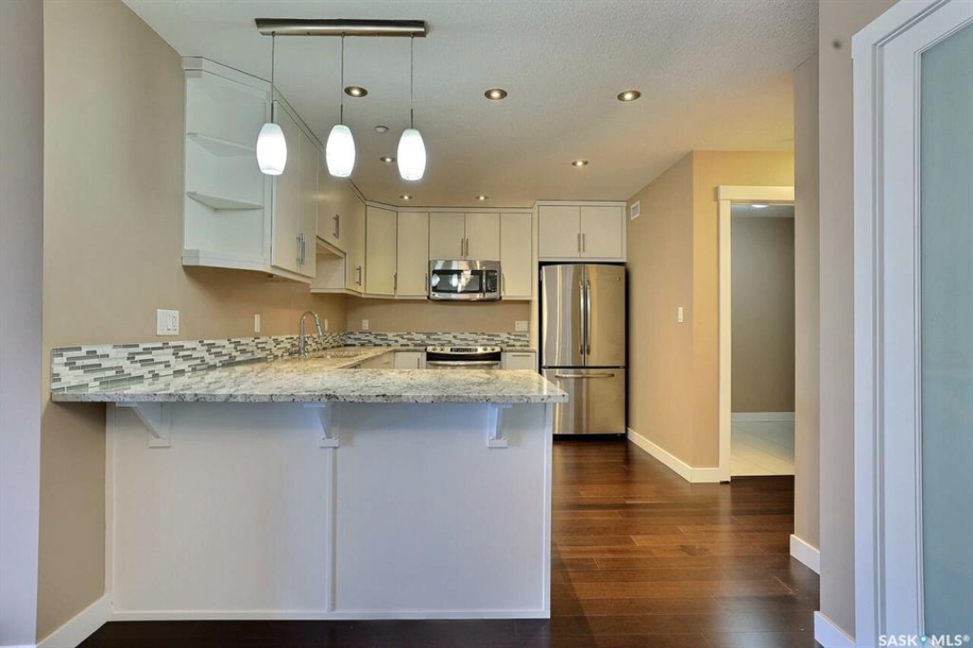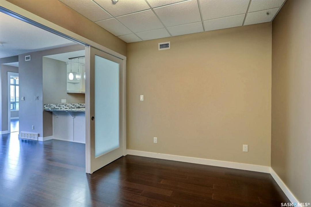 Fantastic downtown condo in desirable location close to the park and all downtown amenities. Very well maintained with engineered hardwood and tile flooring throughout. Open floor plan offers spacious living/dining room, huge kitchen with plenty of white cabinetry and stone counters. Very large den could double as an office or guest room. Huge master bedroom and main bath with tiled floor. Underground heated parking stall. Centre Square offers luxury, maintenance free condo living with beautiful amenities, roof top lounge, gym facilities and easy walkability access to Wascana Park and all downtown shopping and activities.