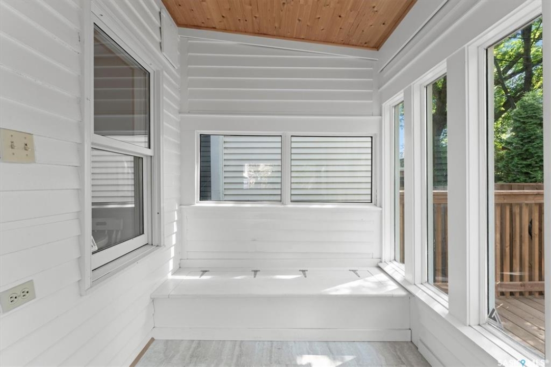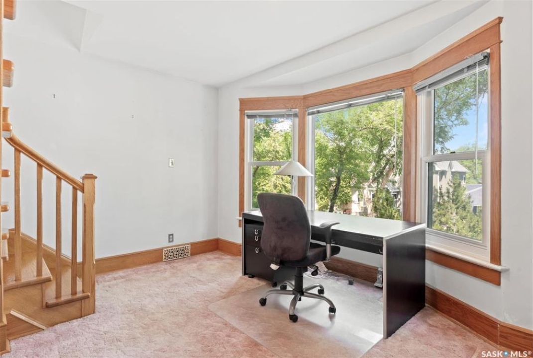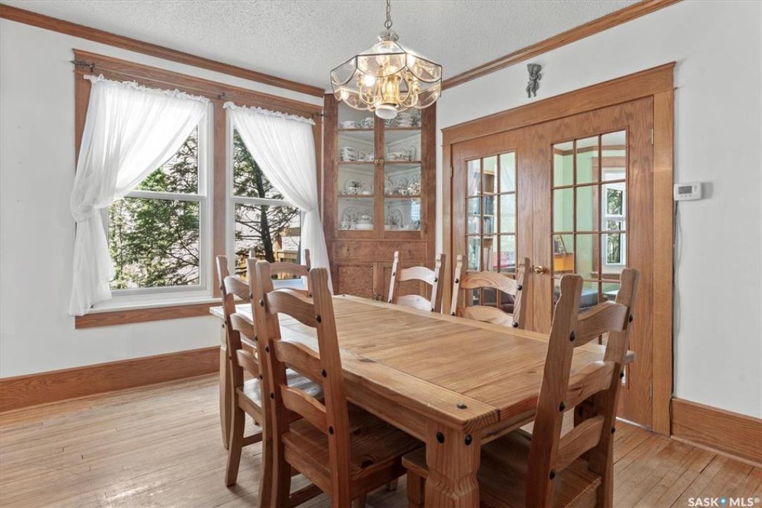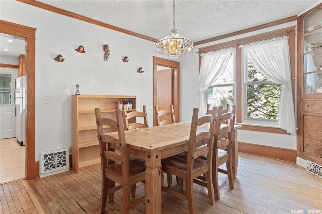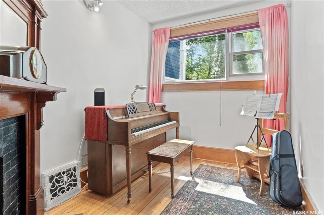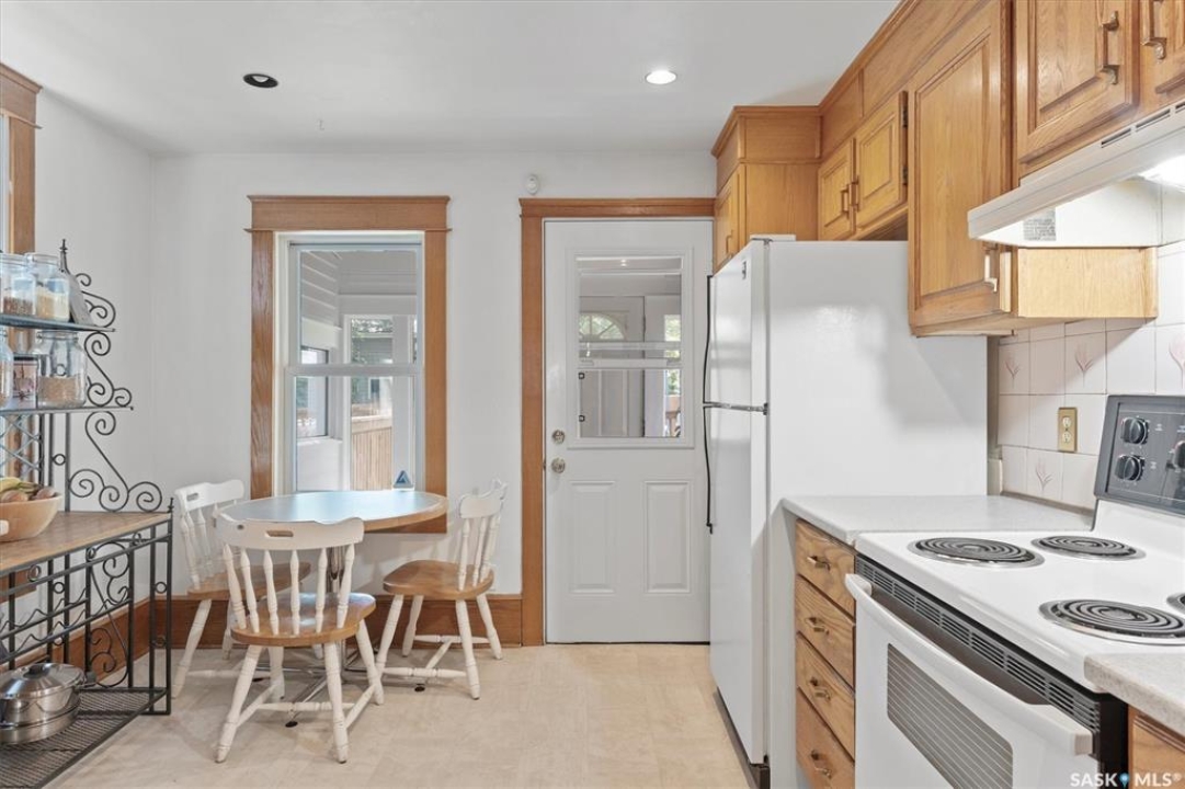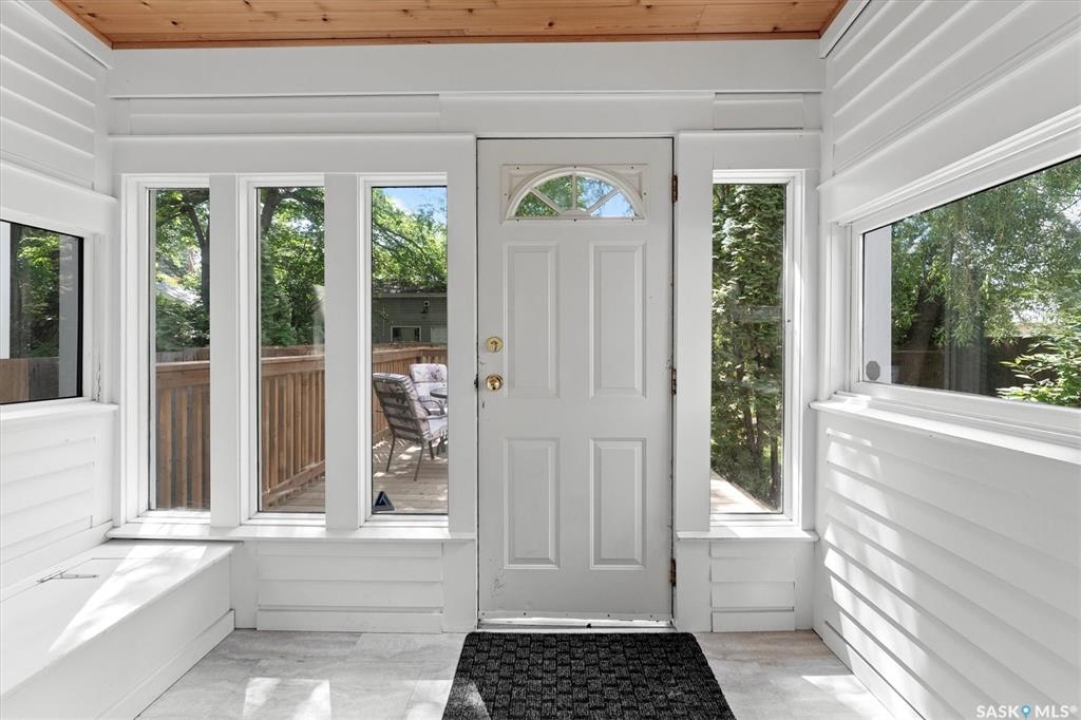 1018 Aird Street – 1912 Character Three-Story in a Storybook Setting! A character located in one of Saskatoon's coveted and walkable neighborhoods. Offering 1,850 sq ft over 3 levels, 4 bedrooms, 3 full baths, a large 37' lot, and a newer tandem detached garage. A picture-perfect front porch leads into a main floor rich in original details: hardwoods, French glass doors, woodwork, two elegant bay windows and a large dining room with a built-in glass china cabinet, plus an office / music room with an original cast fireplace. Main floor also features an oak kitchen, a full 3-piece bath, and a renovated rear porch/mudroom connecting to the backyard. Outdoor living is a highlight: unusually large, fully enclosed fenced yard (bigger than typical for the area), ideal for pets, kids, and leisure, and a sprawling double-tiered deck is perfectly suited for sunny entertaining. The front driveway adds rare, convenient parking to this property. The second level of this home offers three generously sized bedrooms, and a full bath with claw foot tub, with bay window views and a large private treetop balcony off one of the bedrooms! The entire third floor is a master retreat with a sitting area, large bedroom area, and a four-piece ensuite (shower door adjustment required). The basement is undeveloped. Notable updates include: windows, furnace, hot water heater, shingles, plumbing, asbestos removal, newer fencing, updated rear porch, piles under the front porch, shingles, and siding/shingles on the drywalled and insulated garage. This is a special home for people who love character, community, and the magic of an inner city neighbourhood - offering the historic charm you dream of, with practical upgrades for modern living.