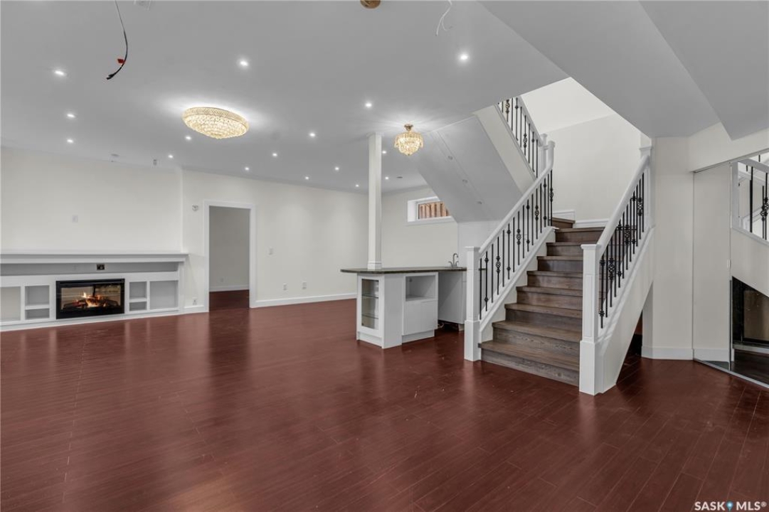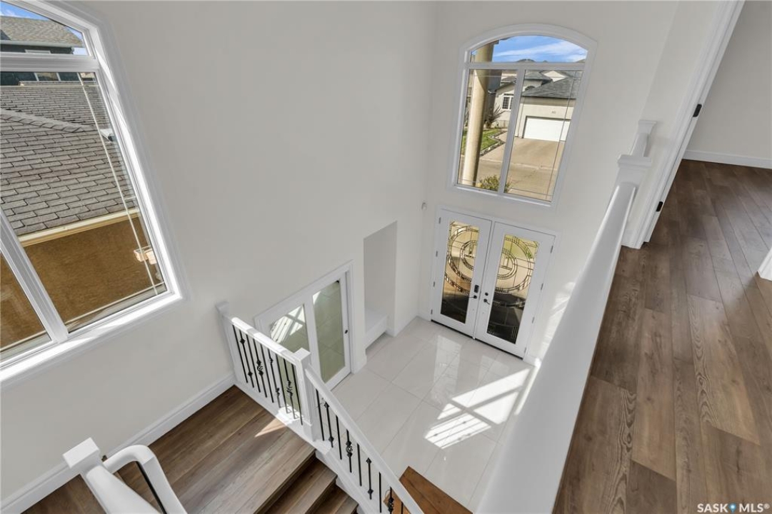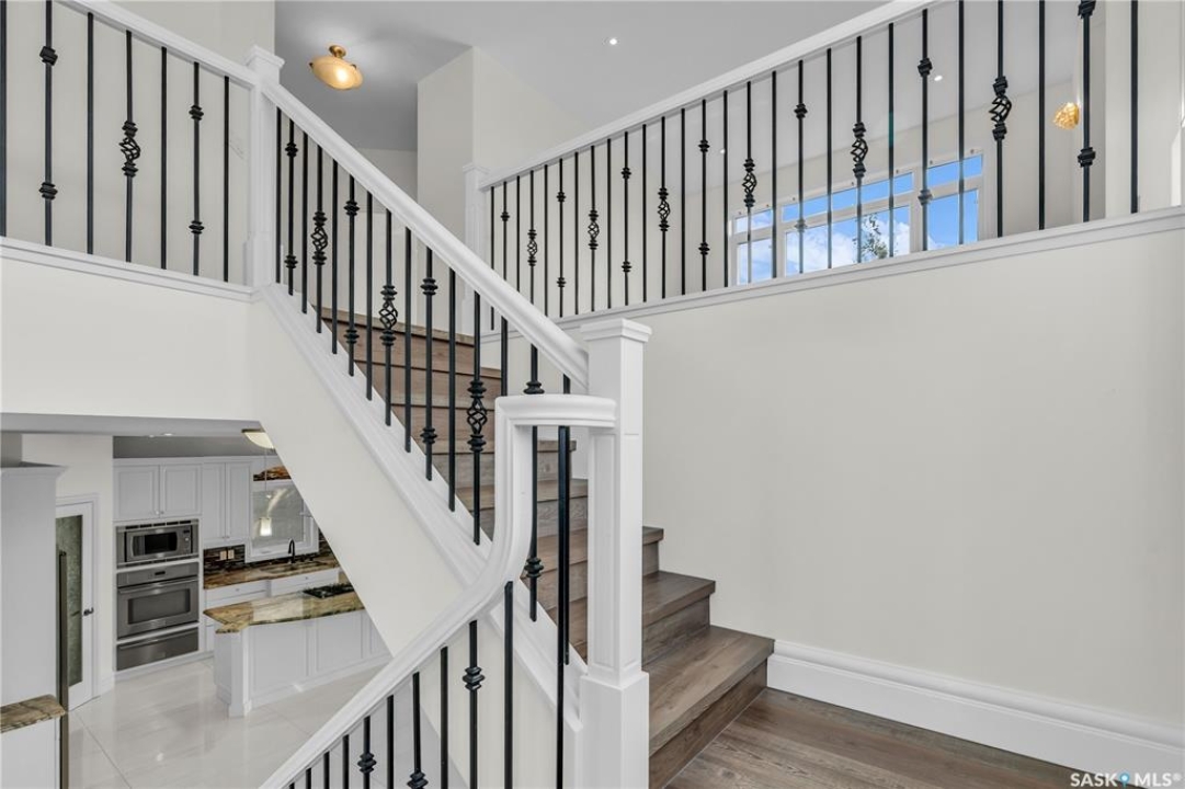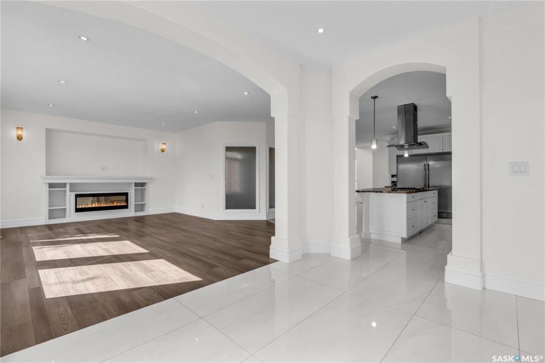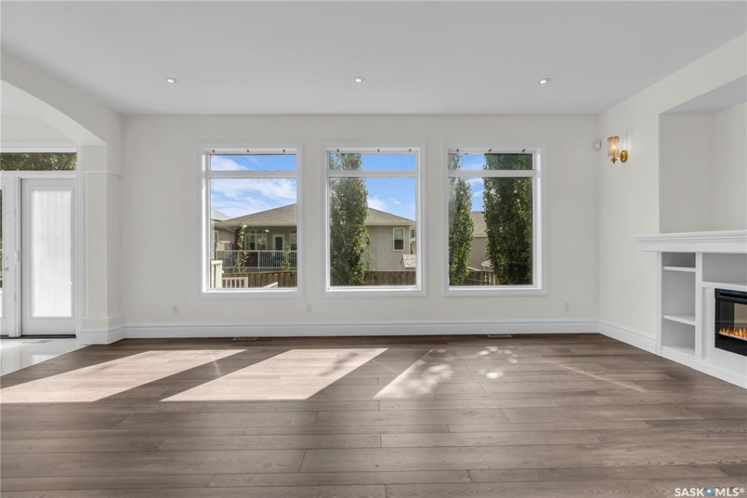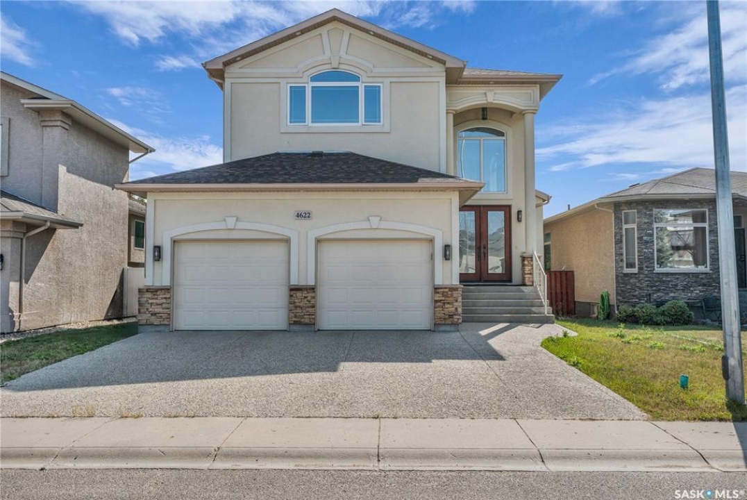 Welcome to this one-of-a-kind Varsity-built family home, offering over 2,500 sq ft of living space with 5 bedrooms, 4 bathrooms, and soaring ceilings that impress from the moment you walk in. The grand foyer leads into a chef's kitchen with an oversized fridge/freezer, gas range, built-in oven, corner pantry, and a large island perfect for entertaining. Just off the kitchen, the dining area is filled with natural light from oversized windows, while the spacious living room features an electric fireplace with a built-in TV wall. Fresh paint and new luxury vinyl plank flooring flow throughout, giving the home a modern, move-in-ready feel. A main floor office provides the ideal work-from-home space, while a full bathroom with tiled shower and a functional mudroom with garage access add everyday convenience. Upstairs, a large bonus room offers extra space for a media lounge, play area, or future bedroom if enclosed. Two secondary bedrooms each feature walk-in closets and share a full 4-piece bath. The primary retreat boasts vaulted ceilings, large windows, an oversized walk-in closet, and a spa-inspired ensuite with a jet tub, tiled shower, and dual sinks. The fully finished basement extends the living space with 9-ft ceilings, a massive recreation area with wet bar, built-in speakers, and a second fireplace. Two additional bedrooms, another full bathroom, and ample storage complete this level. Outside, enjoy a low-maintenance backyard with a deck, turf, and mature trees bordering the property. The double attached garage and wide side yards provide even more utility. Situated near schools, parks, shopping, and all Harbour Landing amenities, this home blends elegance, comfort, and functionality for the modern family.
