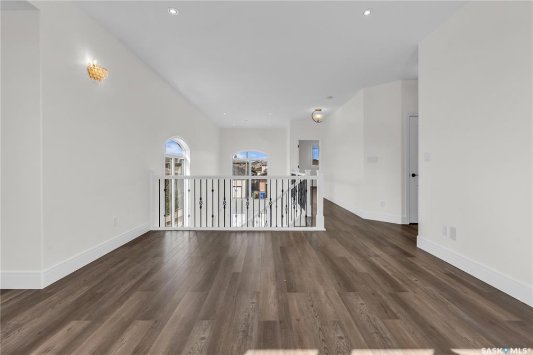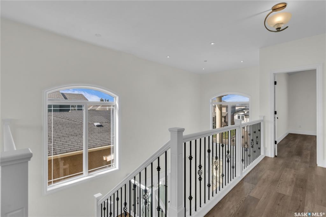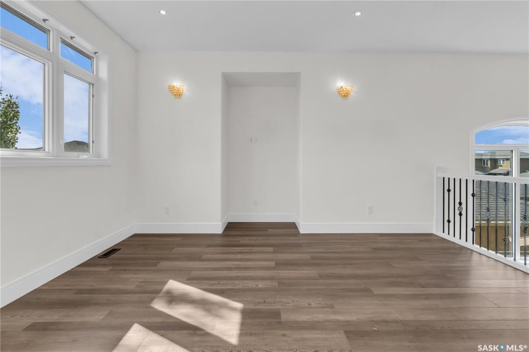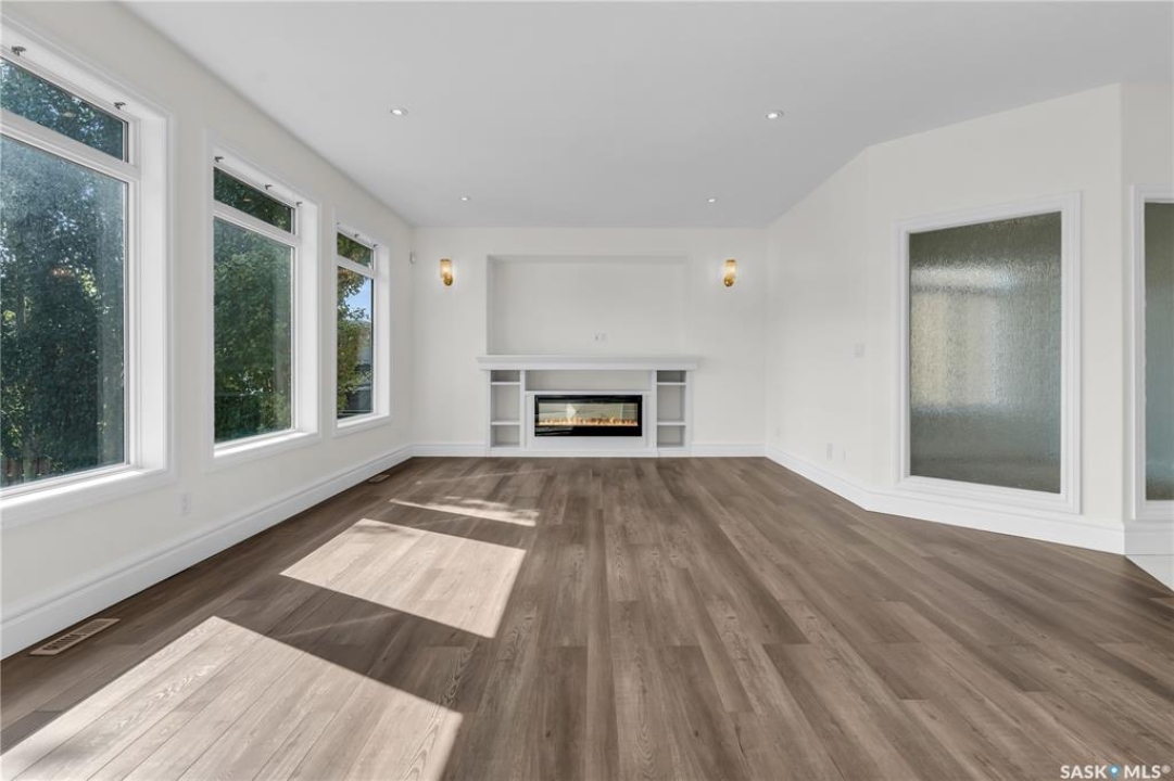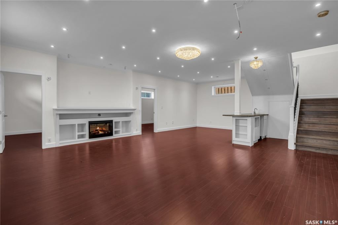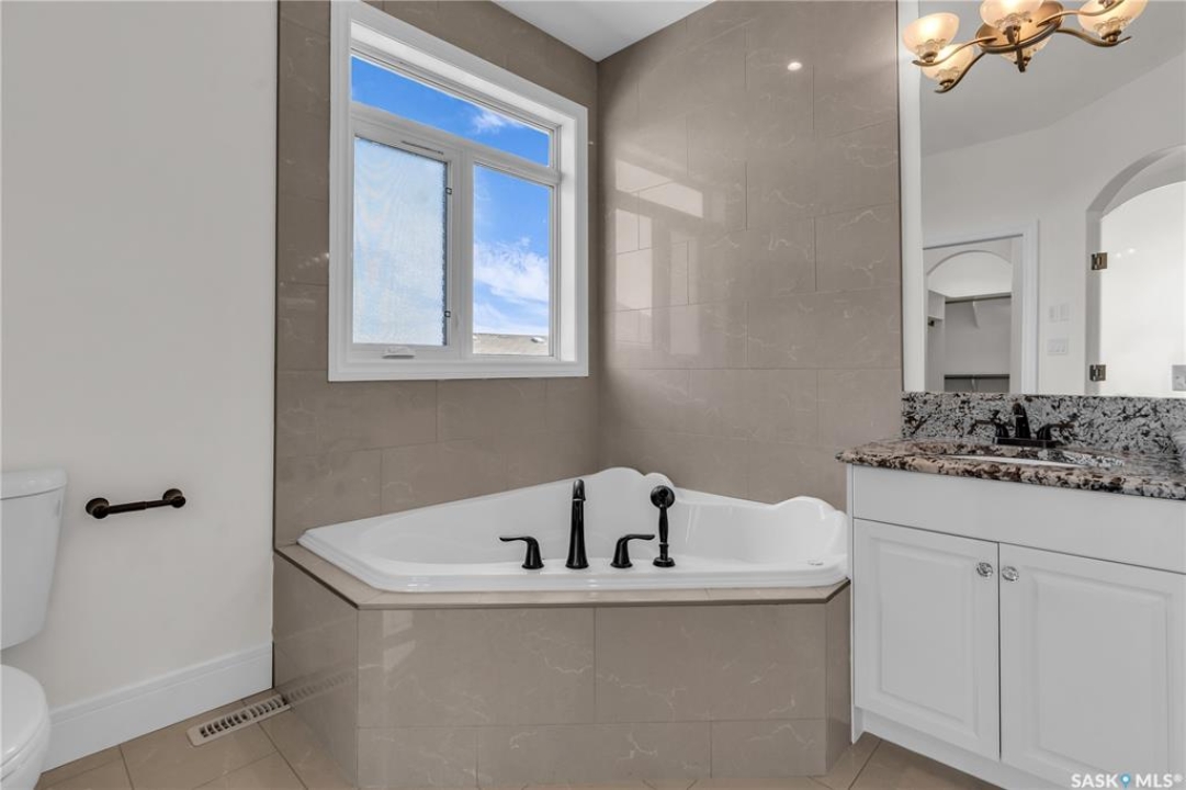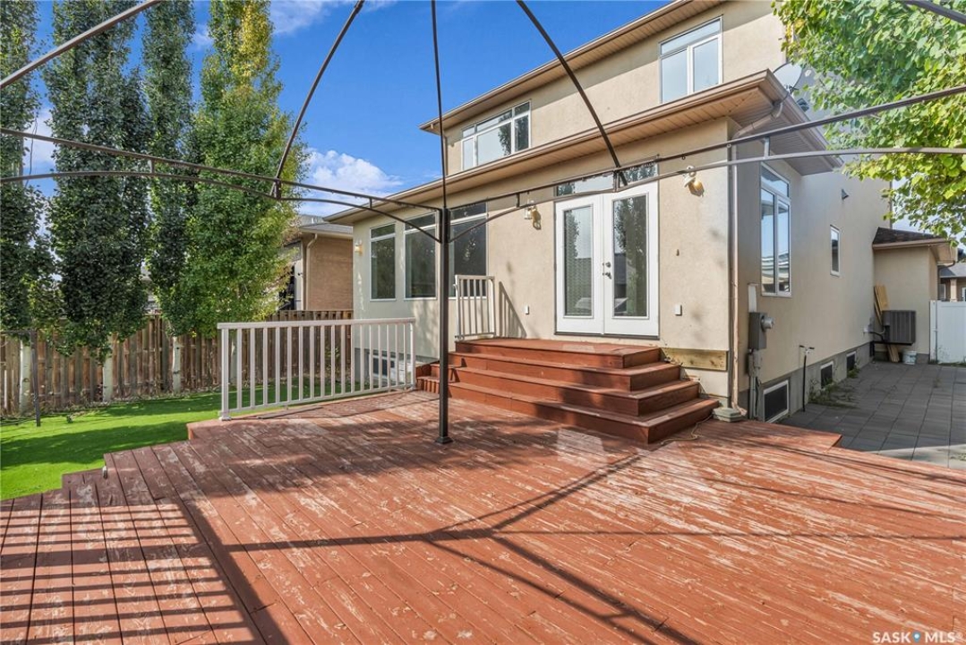 Welcome to this one-of-a-kind Varsity-built family home, offering over 2,500 sq ft of living space with 5 bedrooms, 4 bathrooms, and soaring ceilings that impress from the moment you walk in. The grand foyer leads into a chef's kitchen with an oversized fridge/freezer, gas range, built-in oven, corner pantry, and a large island perfect for entertaining. Just off the kitchen, the dining area is filled with natural light from oversized windows, while the spacious living room features an electric fireplace with a built-in TV wall. Fresh paint and new luxury vinyl plank flooring flow throughout, giving the home a modern, move-in-ready feel. A main floor office provides the ideal work-from-home space, while a full bathroom with tiled shower and a functional mudroom with garage access add everyday convenience. Upstairs, a large bonus room offers extra space for a media lounge, play area, or future bedroom if enclosed. Two secondary bedrooms each feature walk-in closets and share a full 4-piece bath. The primary retreat boasts vaulted ceilings, large windows, an oversized walk-in closet, and a spa-inspired ensuite with a jet tub, tiled shower, and dual sinks. The fully finished basement extends the living space with 9-ft ceilings, a massive recreation area with wet bar, built-in speakers, and a second fireplace. Two additional bedrooms, another full bathroom, and ample storage complete this level. Outside, enjoy a low-maintenance backyard with a deck, turf, and mature trees bordering the property. The double attached garage and wide side yards provide even more utility. Situated near schools, parks, shopping, and all Harbour Landing amenities, this home blends elegance, comfort, and functionality for the modern family.
