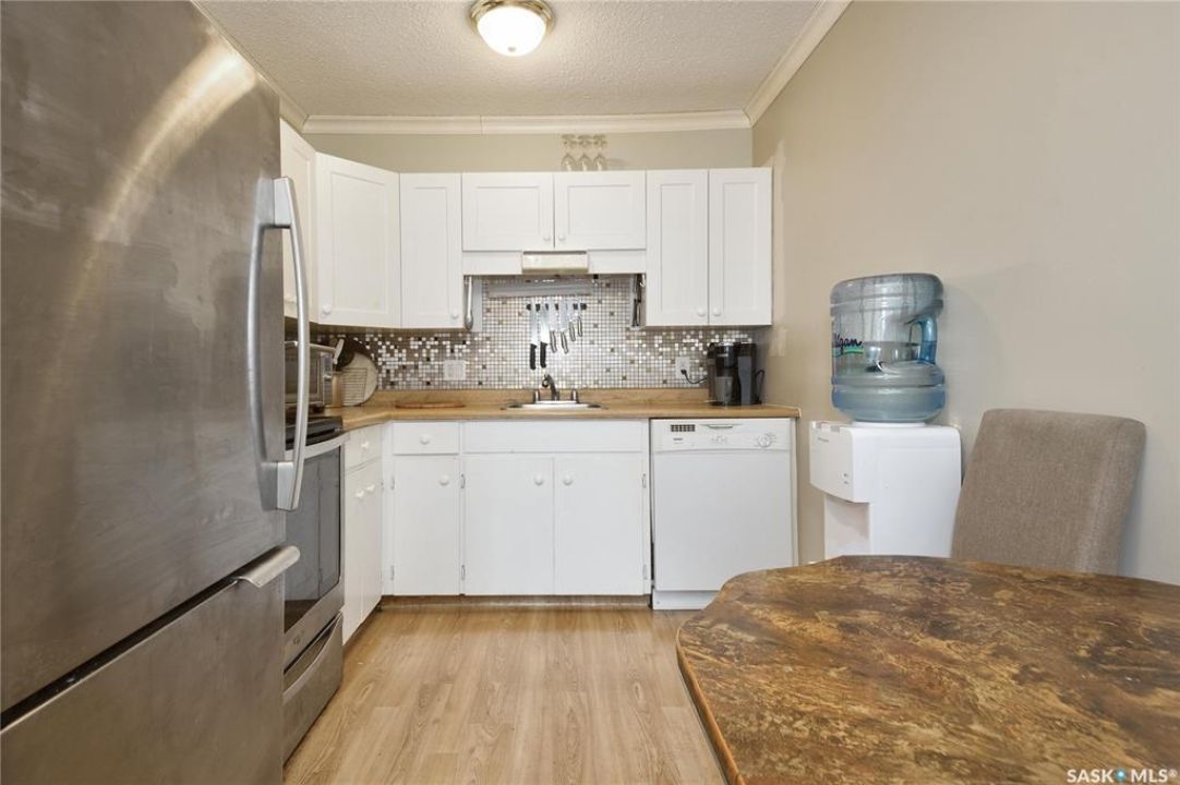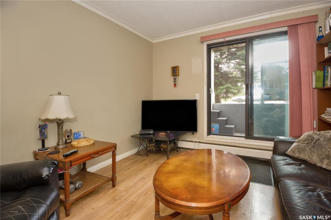 Cute and affordable 1 bedroom, 1 bath condo in Midtown. This attractive unit offers an open kitchen, dining and living room design and ground level walkout to a spacious concrete patio which is great for hauling in groceries or using as a separate entrance. Some notable upgrades include new crown moulding and upper cupboards. Large closets, lots of room for storage and in suite laundry. Newer stainless steel fridge and stove plus an extra fridge. Conveniently located close to cornerstone shopping centre amenities and the new University.