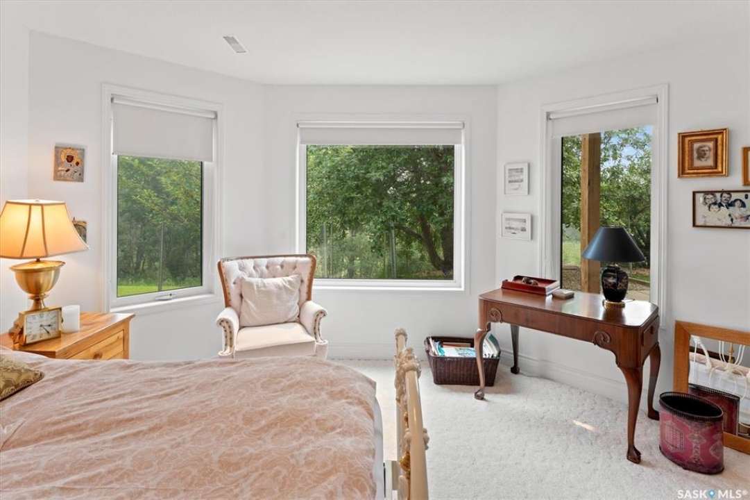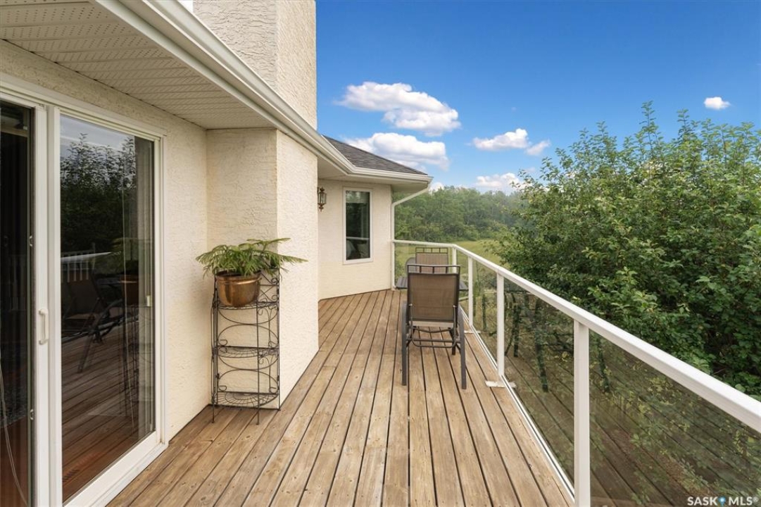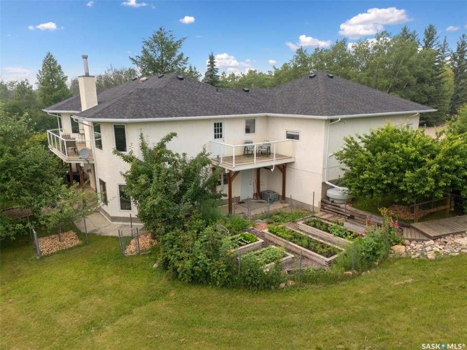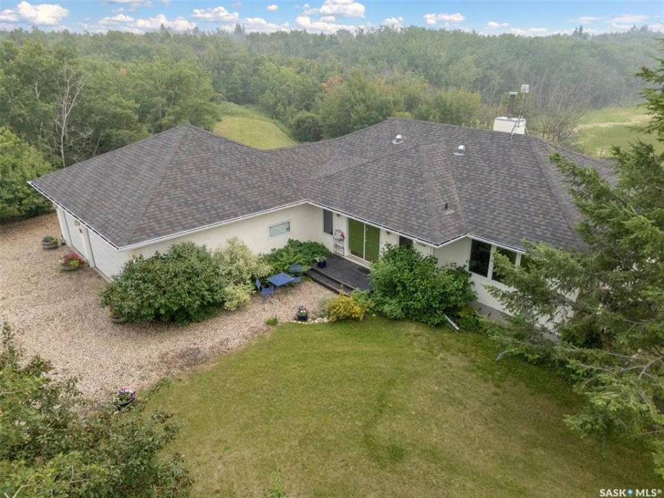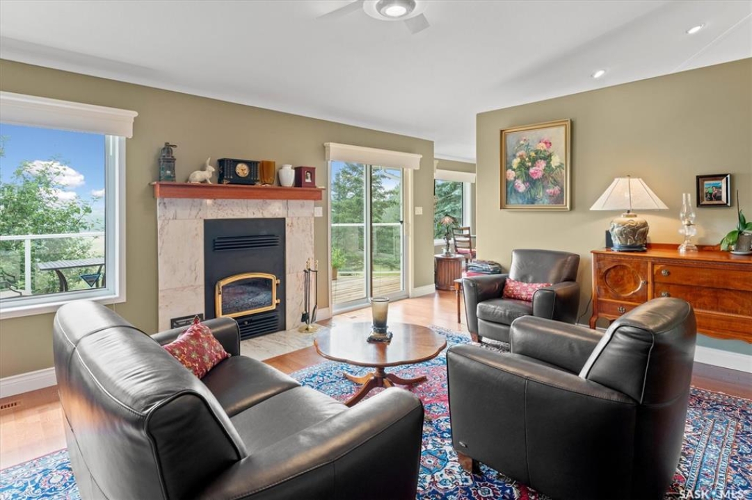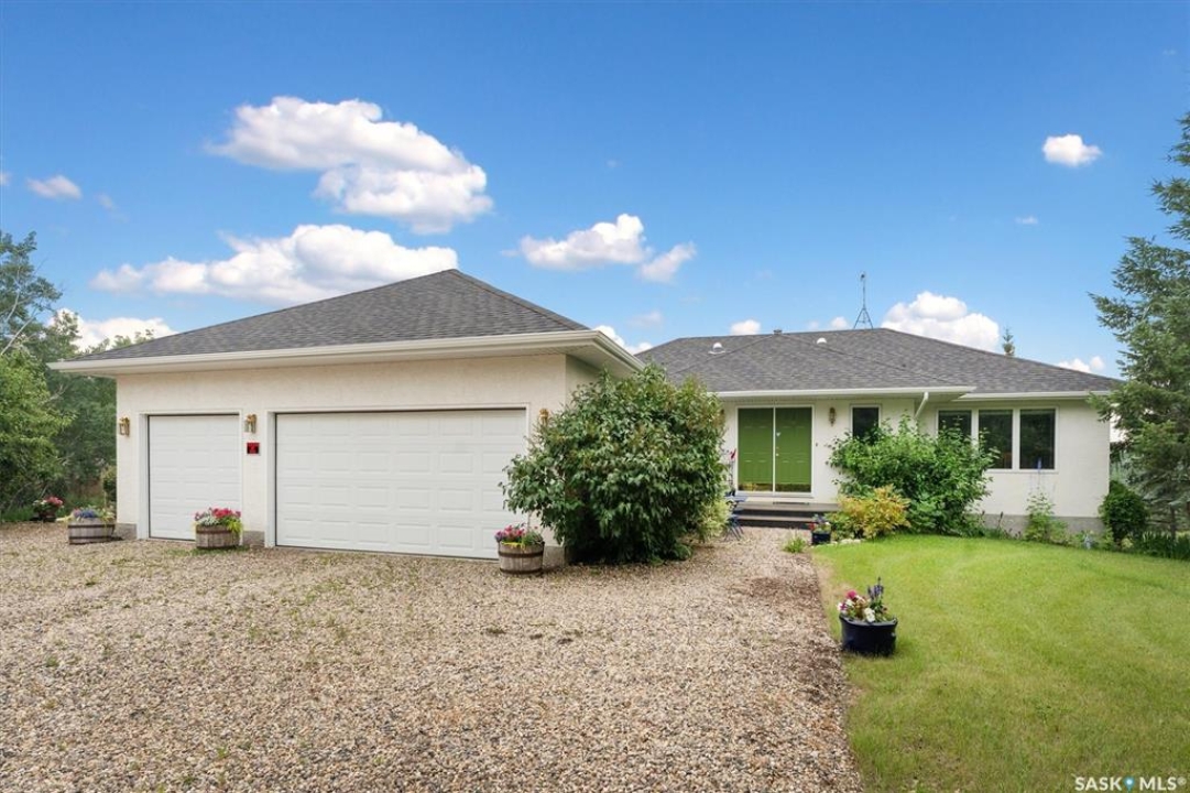 Thoughtfully designed home situated on 10 acres of gently rolling hills. Everything was considered in the design of this sophisticated home, from the southern exposure which takes advantage of the view to the well thought out floor plan. Located only 5 minutes from Saskatoon with pavement almost all the way, this captivating property offers everything you could desire. City water, natural gas, walk out from lower lever and large spacious rooms. Every detail in this home has been considered. Oak hardwood flooring on main level, chef's kitchen with center island and built in appliances. Formal dining room, large master bedroom with en-suite and walk in closet. The lower level is completely developed with family room, 2 large bedrooms, den, utility room plus ample storage. An addition, this home offers both a wood burning fireplace in the living room and a gas fireplace in the lower level family room.