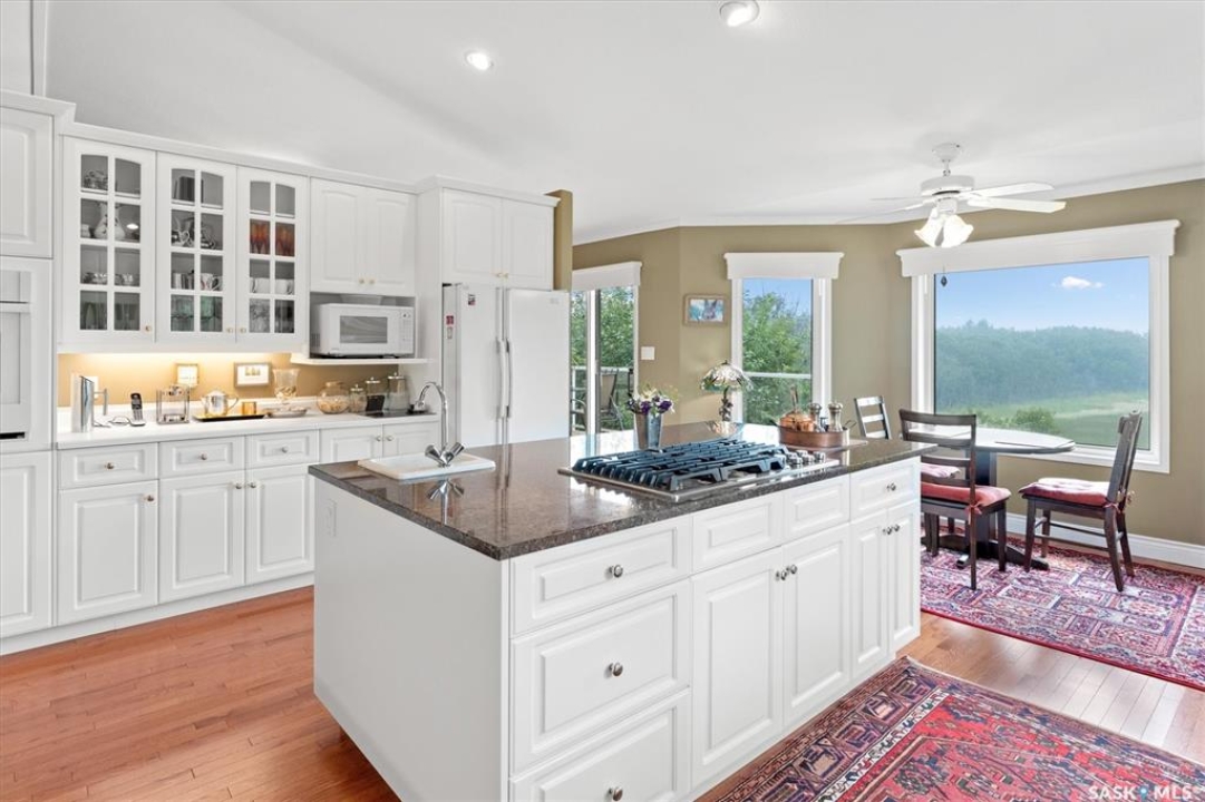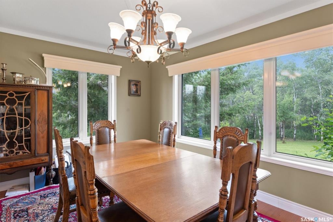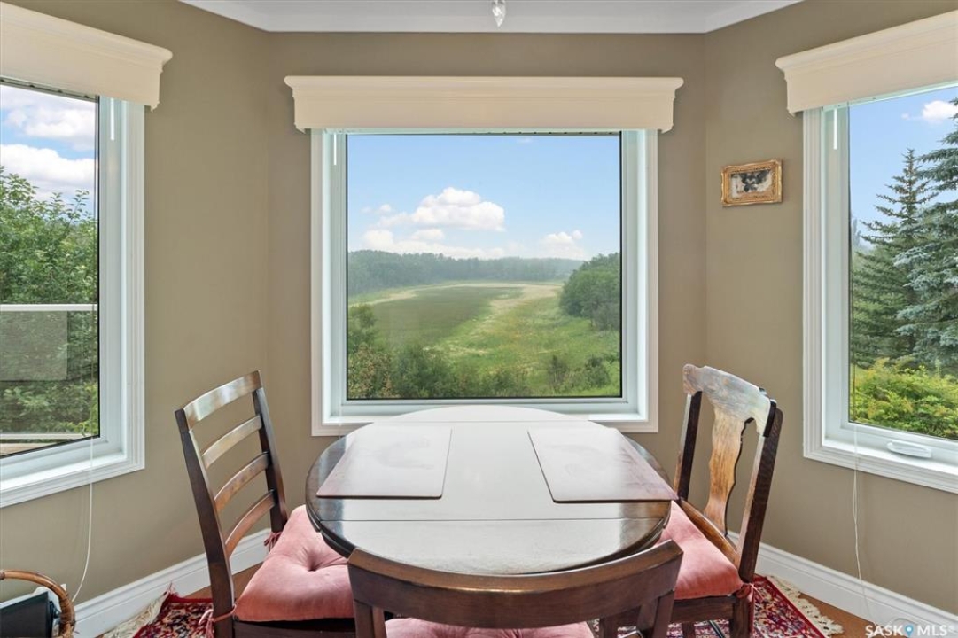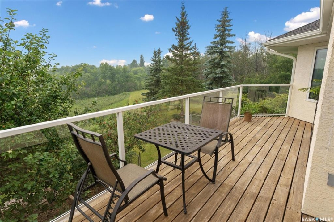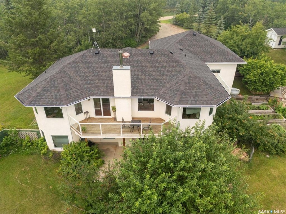 Thoughtfully designed home situated on 10 acres of gently rolling hills. Everything was considered in the design of this sophisticated home, from the southern exposure which takes advantage of the view to the well thought out floor plan. Located only 5 minutes from Saskatoon with pavement almost all the way, this captivating property offers everything you could desire. City water, natural gas, walk out from lower lever and large spacious rooms. Every detail in this home has been considered. Oak hardwood flooring on main level, chef's kitchen with center island and built in appliances. Formal dining room, large master bedroom with en-suite and walk in closet. The lower level is completely developed with family room, 2 large bedrooms, den, utility room plus ample storage. An addition, this home offers both a wood burning fireplace in the living room and a gas fireplace in the lower level family room.