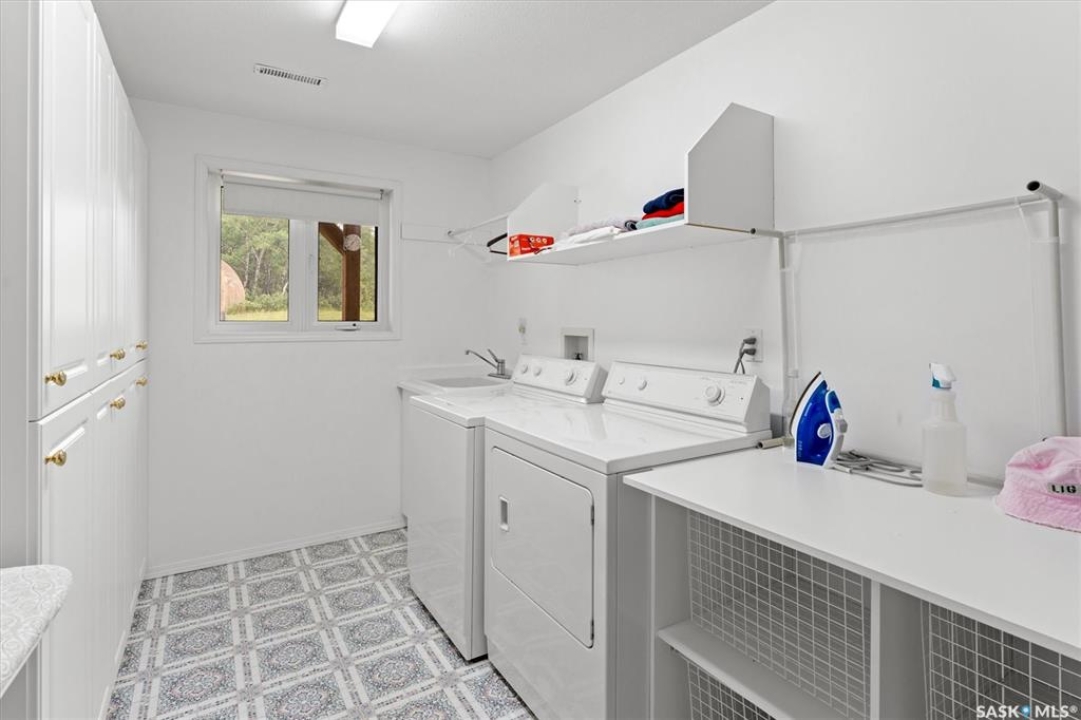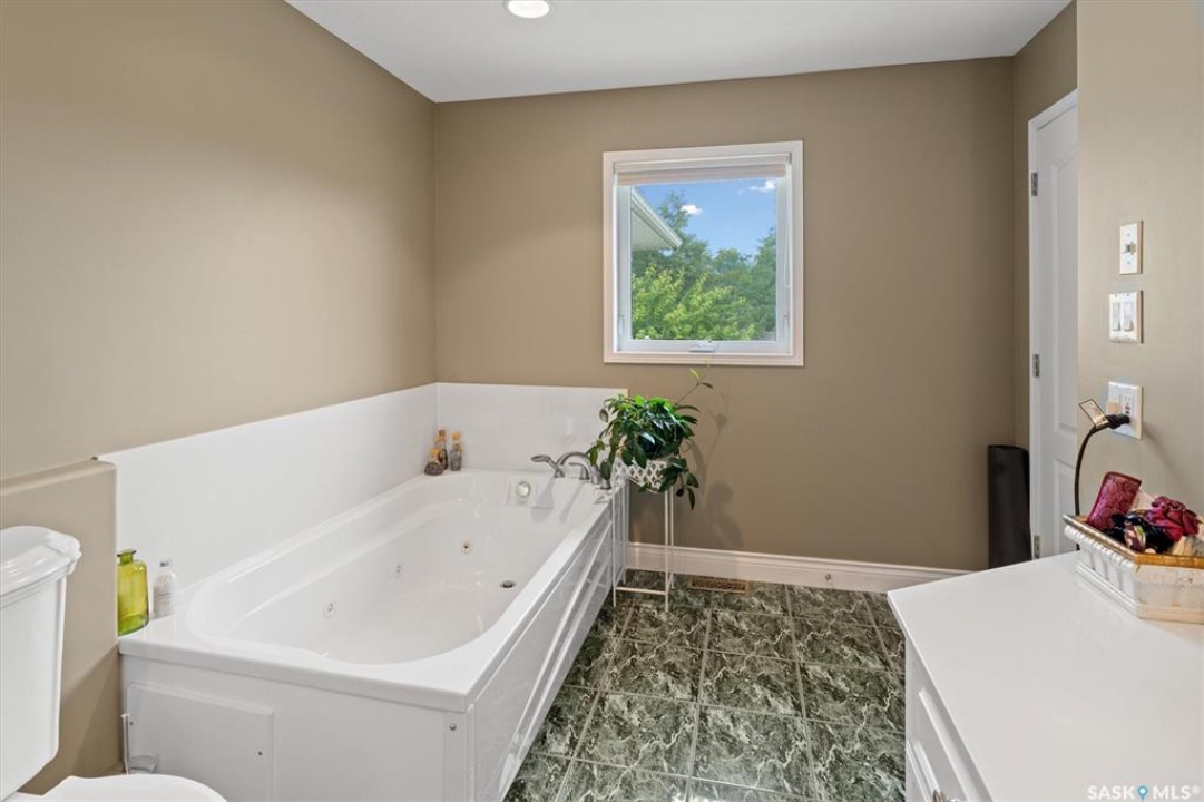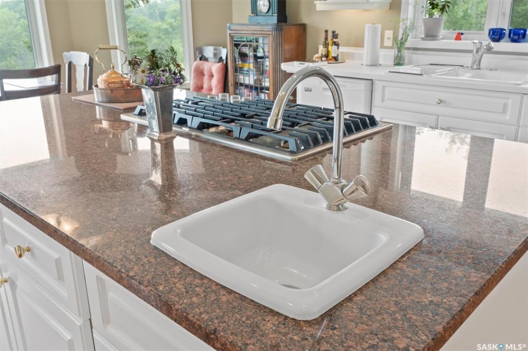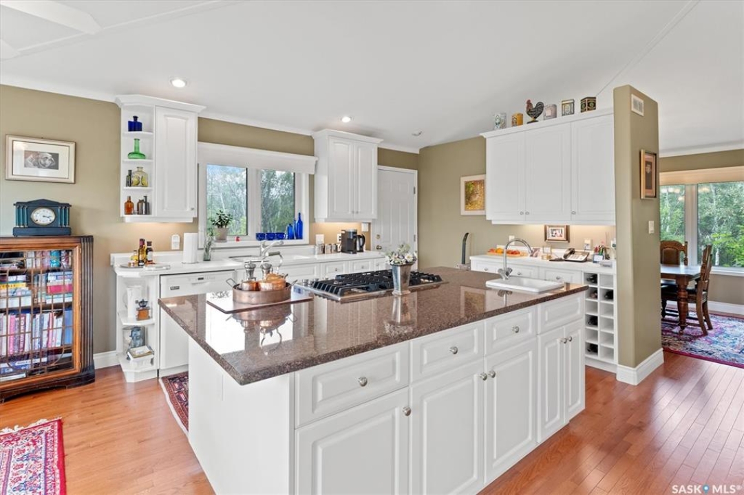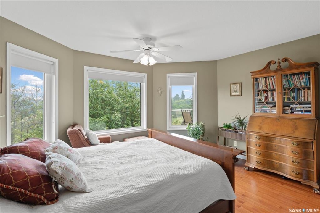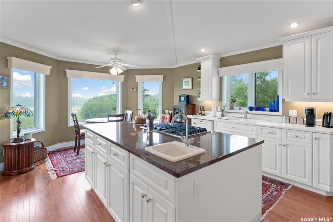 Thoughtfully designed home situated on 10 acres of gently rolling hills. Everything was considered in the design of this sophisticated home, from the southern exposure which takes advantage of the view to the well thought out floor plan. Located only 5 minutes from Saskatoon with pavement almost all the way, this captivating property offers everything you could desire. City water, natural gas, walk out from lower lever and large spacious rooms. Every detail in this home has been considered. Oak hardwood flooring on main level, chef's kitchen with center island and built in appliances. Formal dining room, large master bedroom with en-suite and walk in closet. The lower level is completely developed with family room, 2 large bedrooms, den, utility room plus ample storage. An addition, this home offers both a wood burning fireplace in the living room and a gas fireplace in the lower level family room.