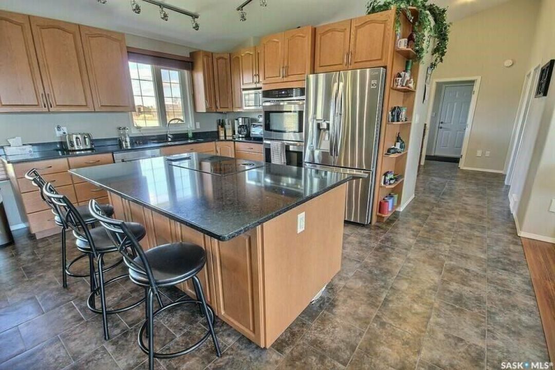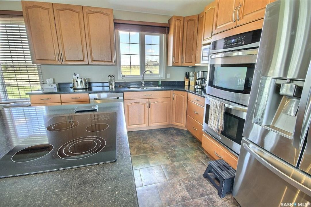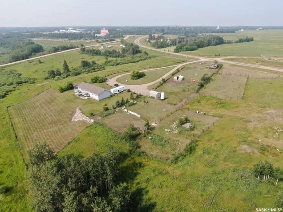 Visit REALTOR ® website for additional information. Located just 1 km from St. Walburg, this 50-acre acreage offers a 1,400 sq. ft. home with a fully finished walkout basement. The main floor includes an open-concept living area with deck access, a kitchen with quartz countertops, stainless steel appliances, double wall ovens, and a large island, along with a primary bedroom featuring a 4-piece ensuite and deck access, a second bedroom, 4-piece bathroom, mudroom, and laundry. The basement includes a family room with wet bar, media room, two bedrooms, a 4-piece bathroom, storage, and in-floor heating. Additional features include water treatment systems, a double attached heated garage, upper deck, lower patio with hot tub, landscaped yard, and garden area. Equestrian and hobby farm facilities include an outdoor riding arena, tack shed, round pen, horse shelter, corrals, and water bowl.