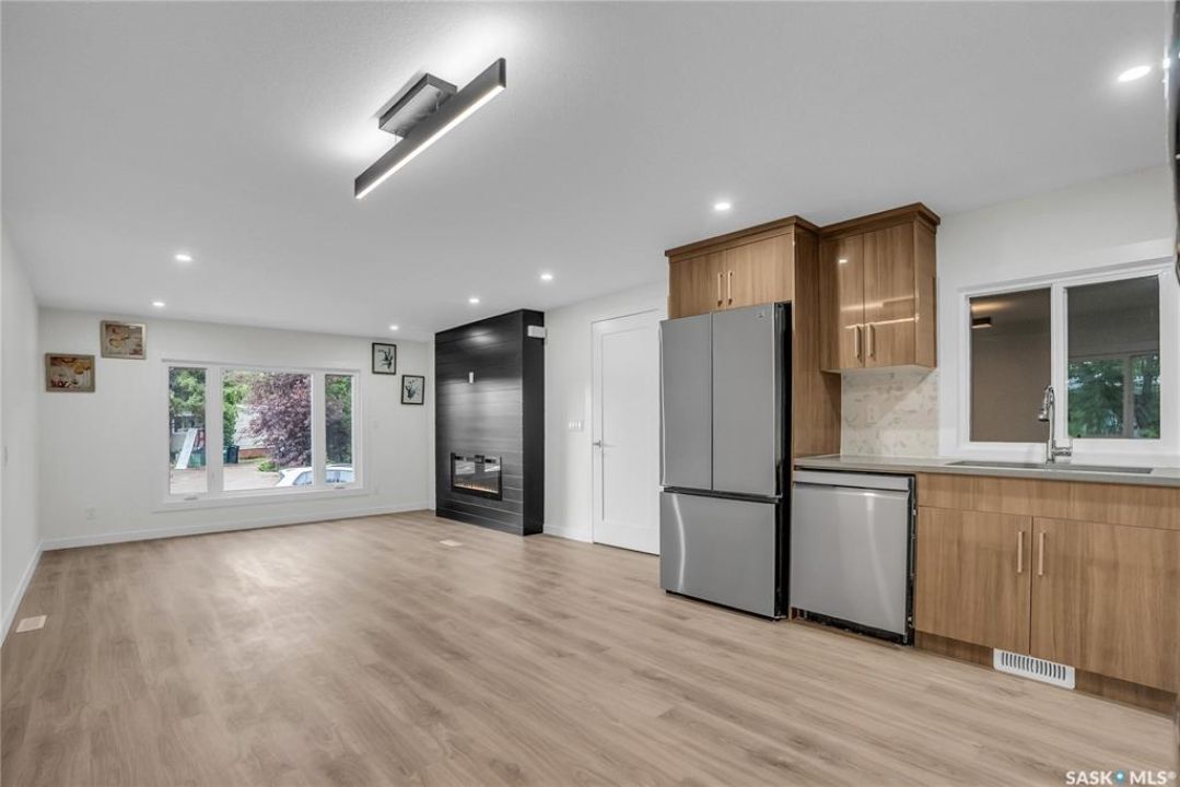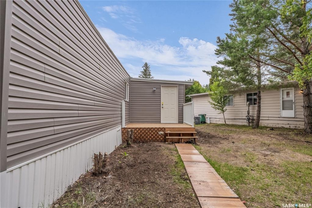 Completely renovated and move-in ready, this stunning mobile home offers over 1,200 square feet of beautifully updated living space on an absolutely massive lot backing green space—an incredible find on the east side of Saskatoon for under $200,000! Located in a quiet, well-kept park, this home features a brand-new furnace, air conditioning, and windows for year-round comfort and efficiency. Step inside to a bright, modern interior showcasing quartz countertops, tile backsplash, soft-close cabinets, stainless steel appliances and pot lights throughout. The open-concept layout is finished with luxury vinyl plank flooring and features an electric fireplace for added charm. Bonus room for extra space for kids or an office. You'll love the dual sinks in the bathroom, the feature wall in the primary bedroom, and the thoughtful touches throughout. Enjoy two new outdoor decks—one in the front and one in the back—perfect for morning coffee or evening entertaining. Lot fees include: water, sewer, snow removal, garbage pick-up, park maintenance and that expansive yard. Whether you're downsizing, buying your first home, or simply looking for turn-key living in a peaceful east-end location, this home delivers exceptional value and style.