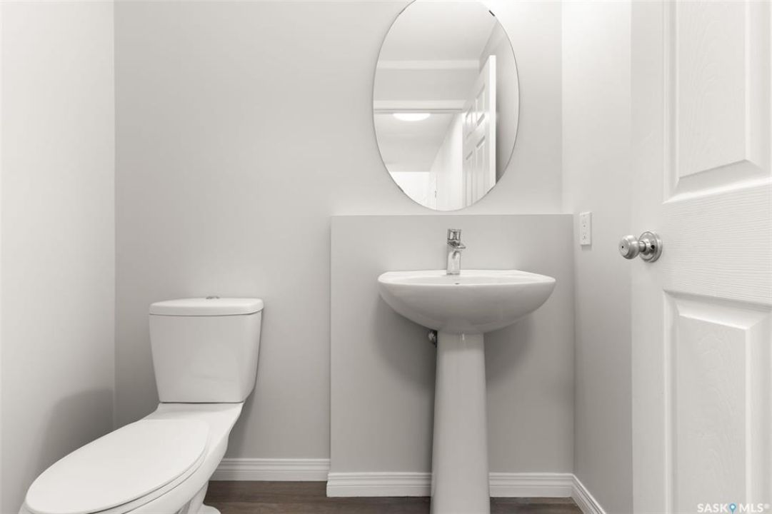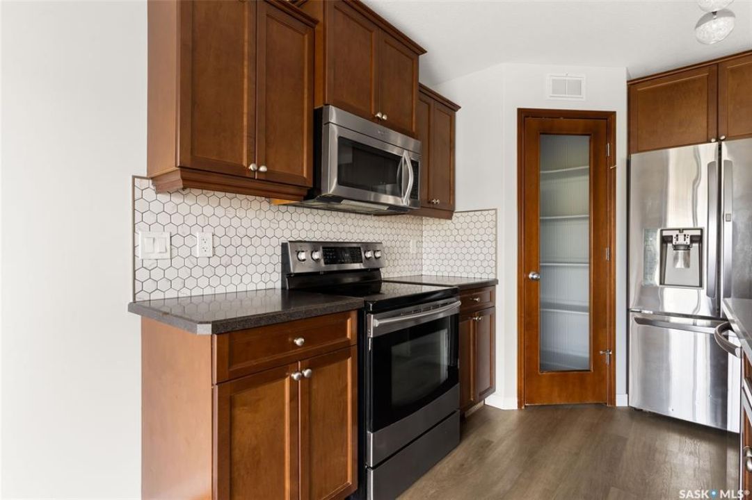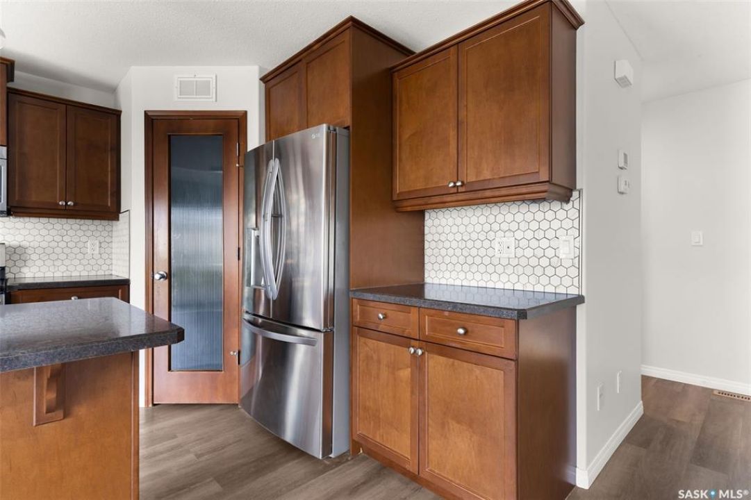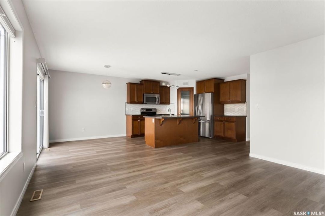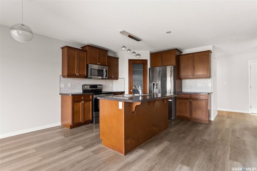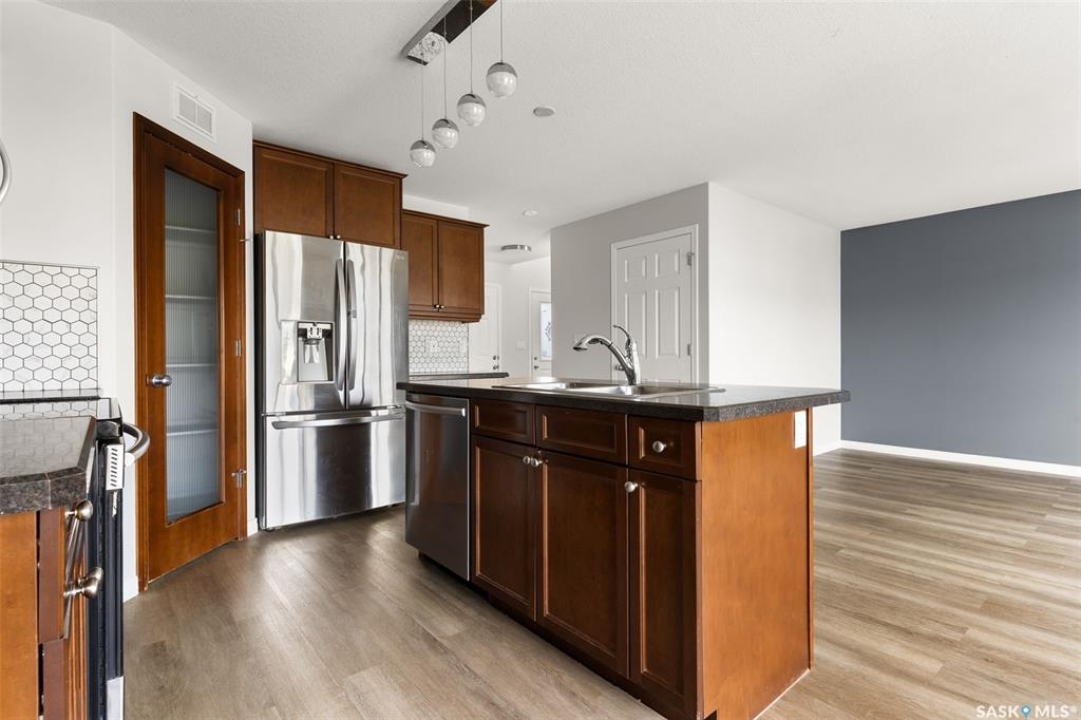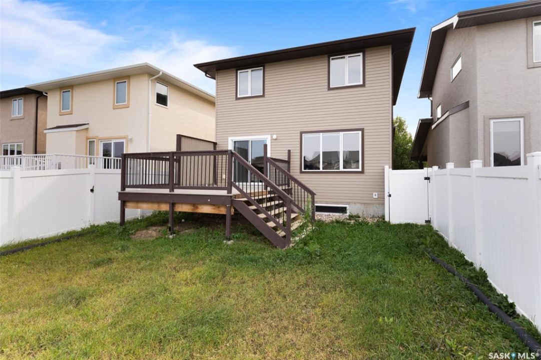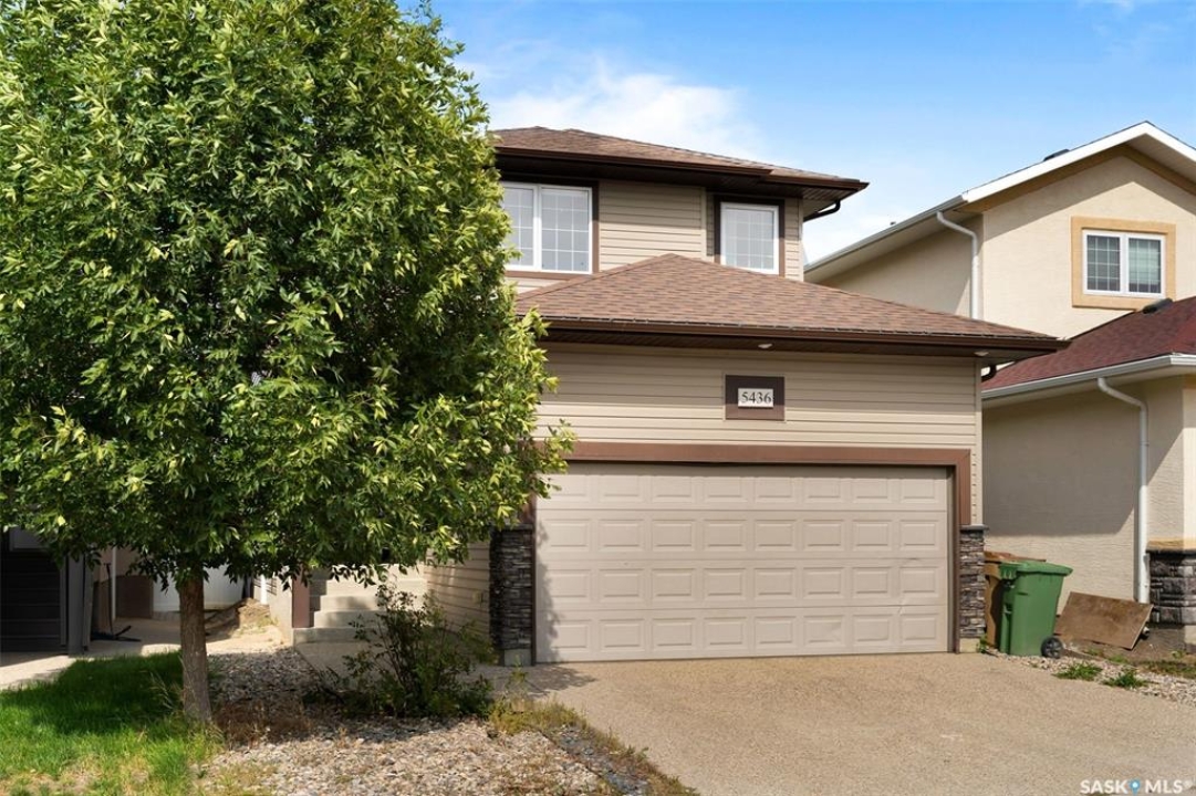 Welcome to 5436 Aerial Crescent, a modern two-storey in the heart of Harbour Landing—one of Regina's most vibrant and family-friendly neighbourhoods. Built in 2012, this 1,439 sq. ft. home impresses with its smart design, 4 bedrooms, 4 bathrooms, and a fully finished basement with separate entry. The main floor is bright and inviting, featuring a spacious living room with large picture windows, an open dining area with garden doors to the deck, and a stylish kitchen showcasing rich wood cabinetry, stainless steel appliances, tiled backsplash, and a walk-in pantry. A convenient powder room and main floor laundry complete this level with everyday functionality. Upstairs, the private primary suite boasts a walk-in closet and 4-piece ensuite, accompanied by two additional bedrooms and a full bath. The lower level expands your living space with a versatile rec room, a wet bar, a fourth bedroom, and a full bath—ideal for guests, teens, or potential suite options. Step outside to a fully fenced yard that backs onto expansive green space—perfect for kids, pets, and backyard gatherings. A spacious deck makes summer entertaining a breeze, while the double attached garage and exposed aggregate driveway add both curb appeal and extra parking. With central air, updated vinyl plank flooring, included appliances, and a location close to schools, parks, shopping, and all Harbour Landing amenities, this home checks all the boxes. Move-in ready and waiting for you to enjoy!