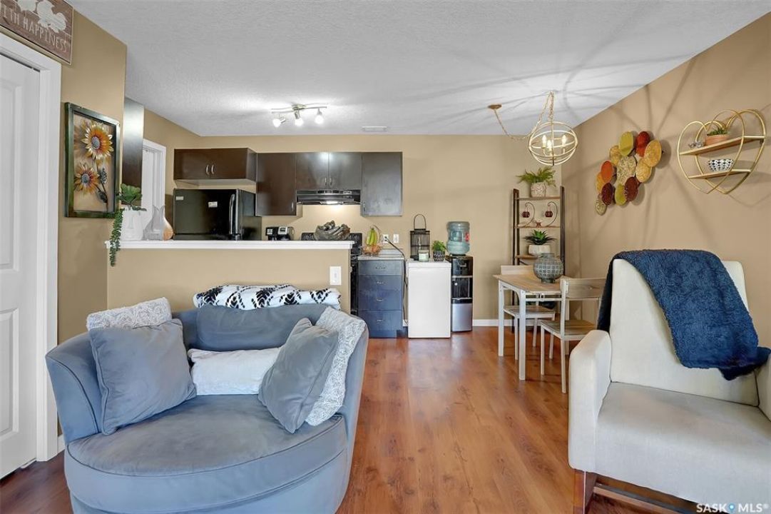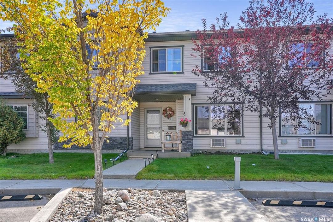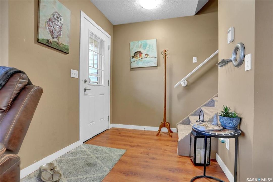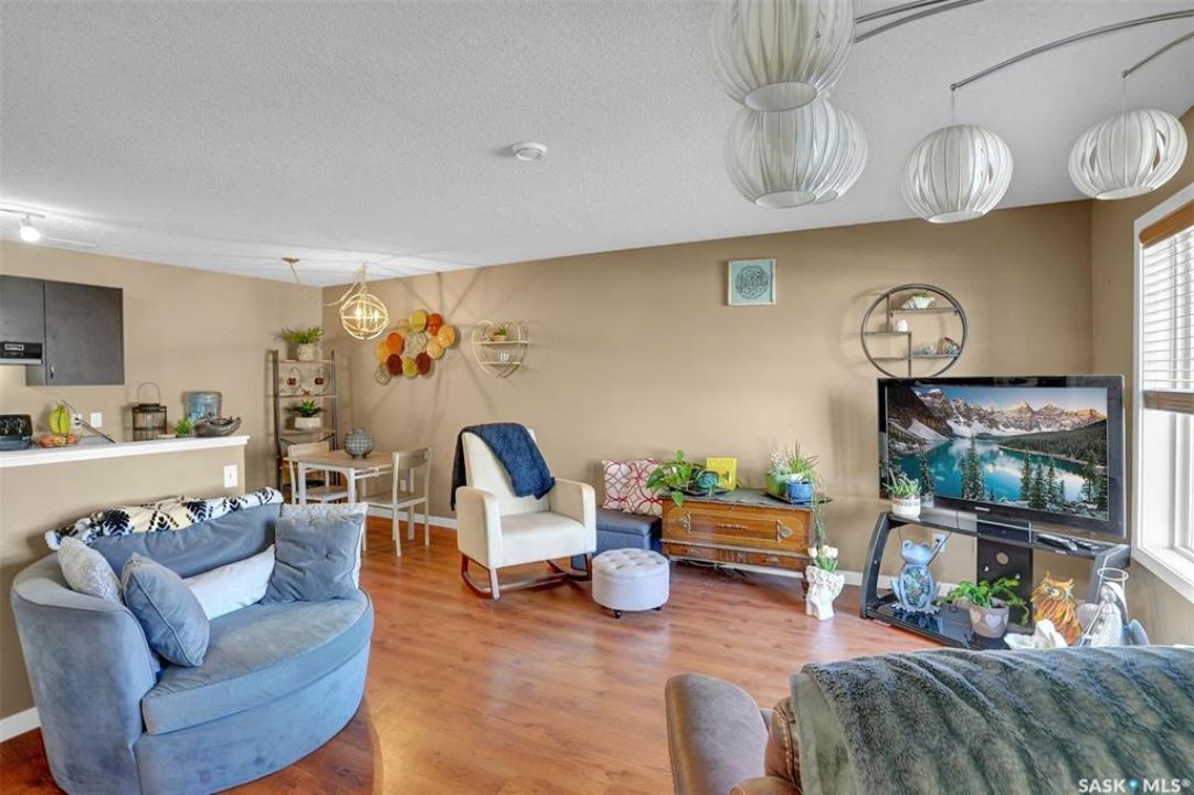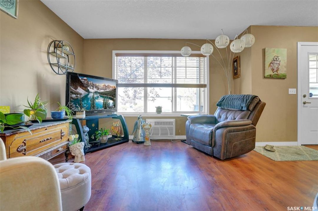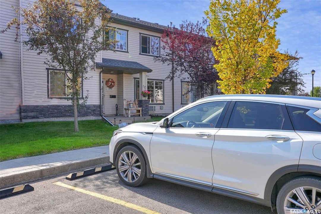 Welcome to this 904 sq ft two-storey condo located in Regina's sought-after Harbour Landing neighbourhood. This home offers both convenience and functionality with one electrified parking stall right in front of the unit, plus a single detached garage directly across for additional parking or storage. The main level features an open-concept layout with a bright living room highlighted by a large window for natural light, a dining area, and a well-appointed kitchen with a spacious pantry/storage area. Upstairs you'll find two generously sized bedrooms, a 4-piece bathroom, and convenient laundry tucked just off the bathroom. The primary bedroom includes a walk-in closet, while the bathroom is finished with built-in shelving for linens. This condo is a fantastic option for first-time buyers, young professionals, those looking to downsize or anyone seeking a low-maintenance lifestyle in a great location, close to all amenities.