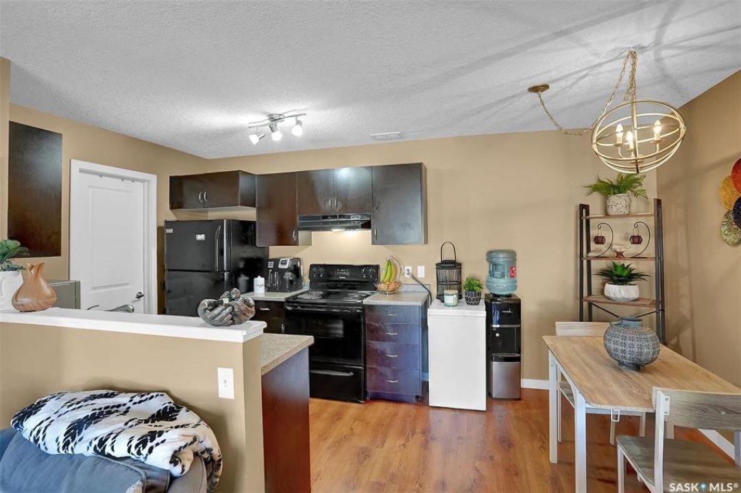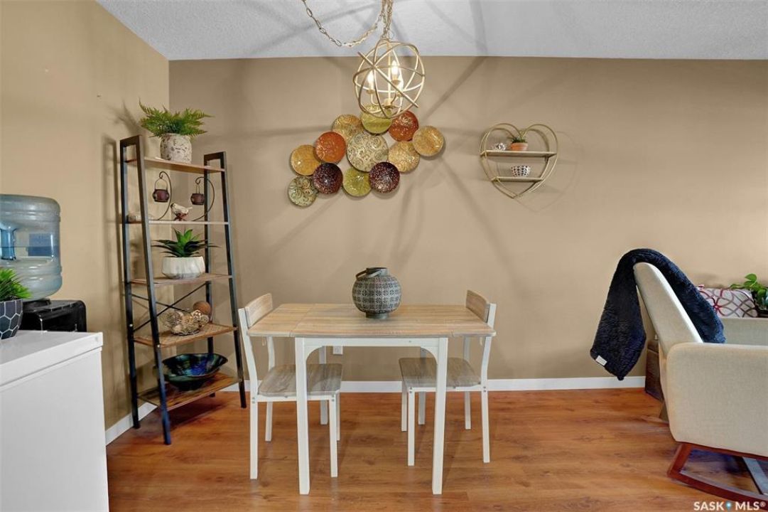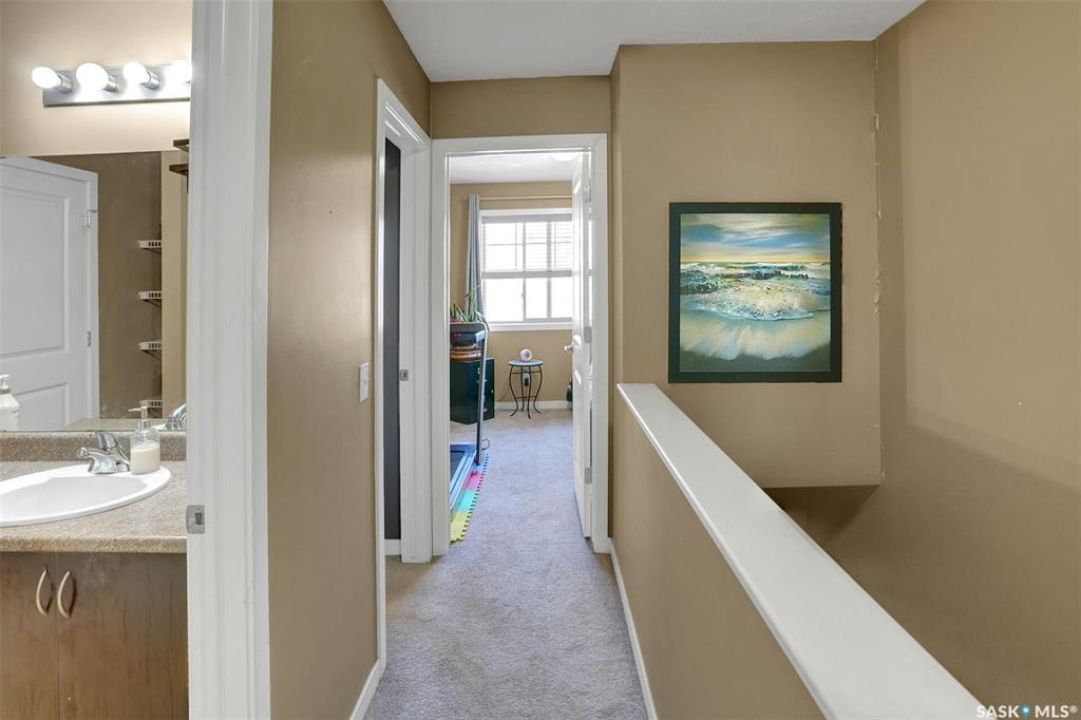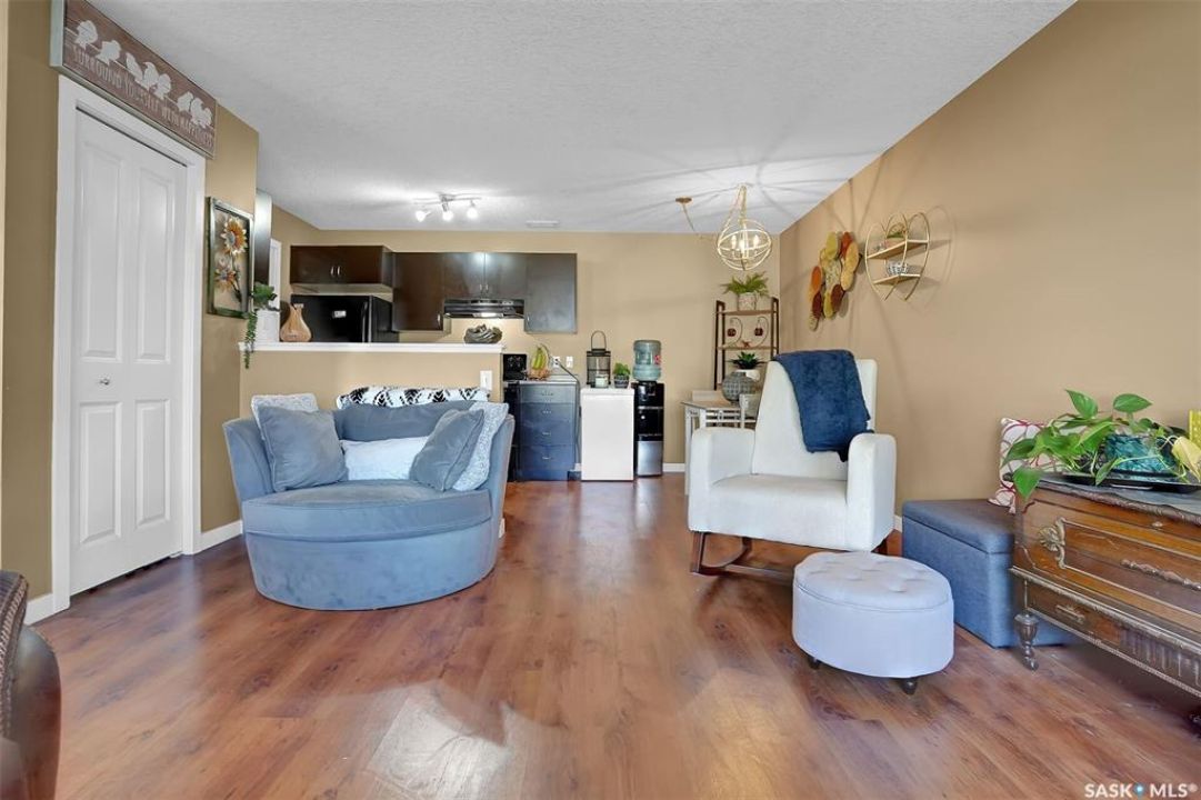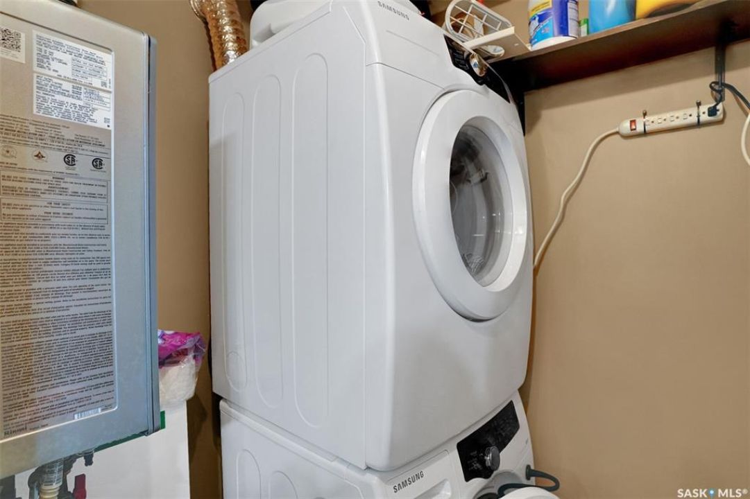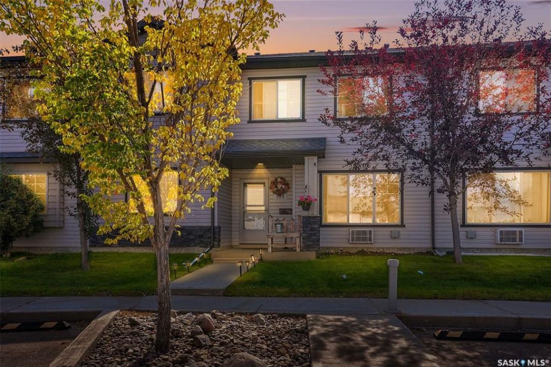 Welcome to this 904 sq ft two-storey condo located in Regina's sought-after Harbour Landing neighbourhood. This home offers both convenience and functionality with one electrified parking stall right in front of the unit, plus a single detached garage directly across for additional parking or storage. The main level features an open-concept layout with a bright living room highlighted by a large window for natural light, a dining area, and a well-appointed kitchen with a spacious pantry/storage area. Upstairs you'll find two generously sized bedrooms, a 4-piece bathroom, and convenient laundry tucked just off the bathroom. The primary bedroom includes a walk-in closet, while the bathroom is finished with built-in shelving for linens. This condo is a fantastic option for first-time buyers, young professionals, those looking to downsize or anyone seeking a low-maintenance lifestyle in a great location, close to all amenities.