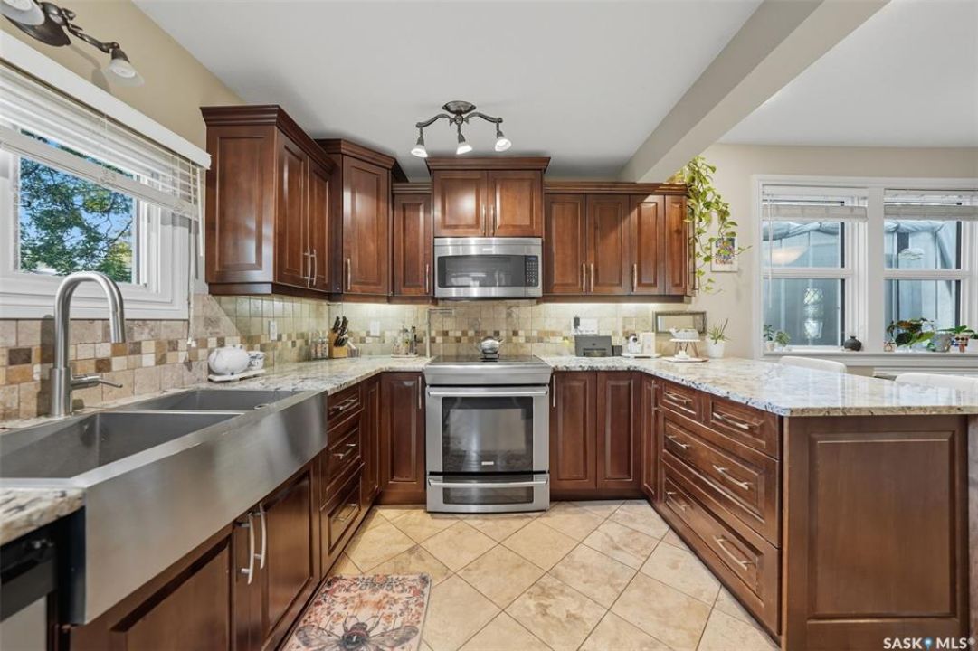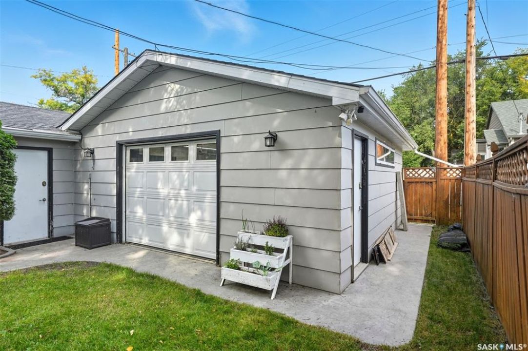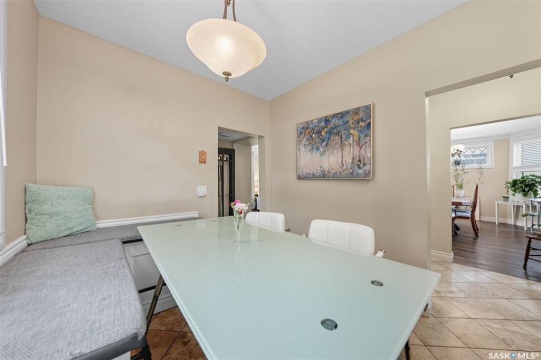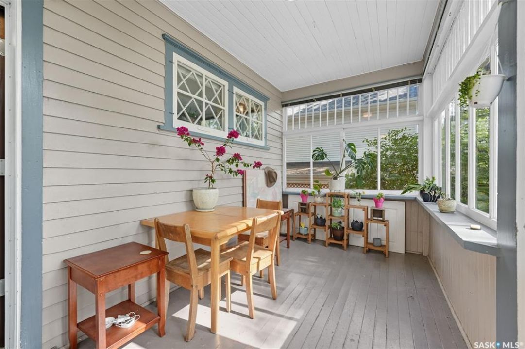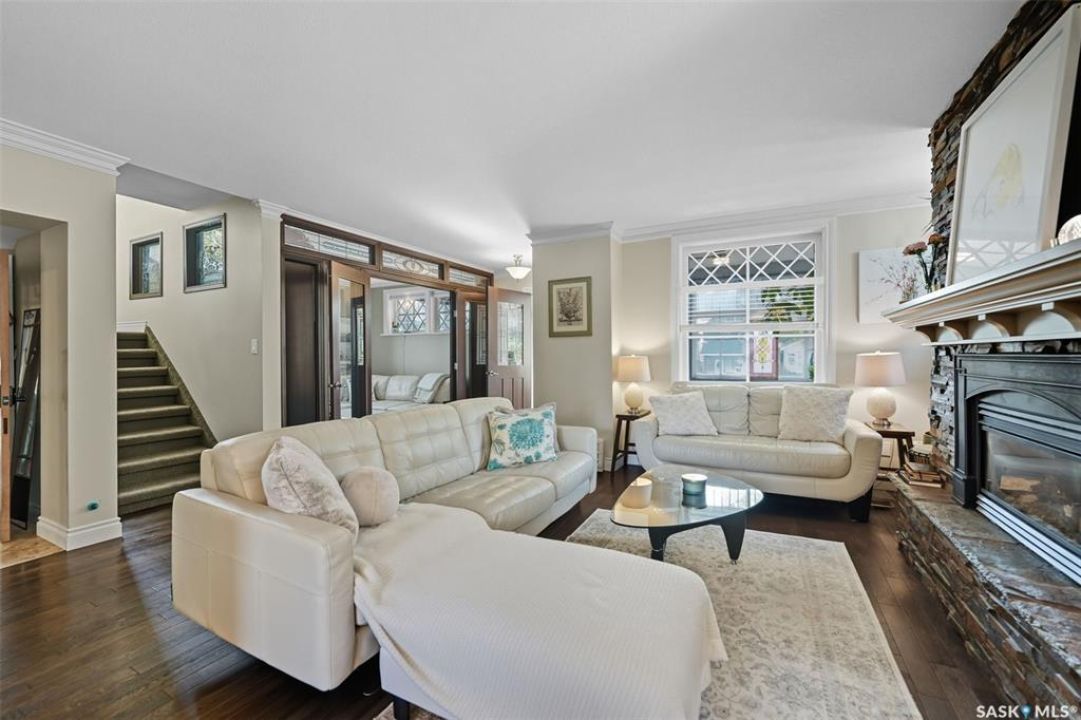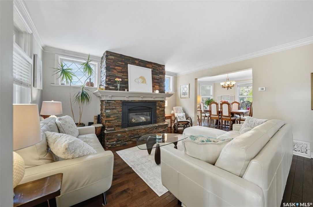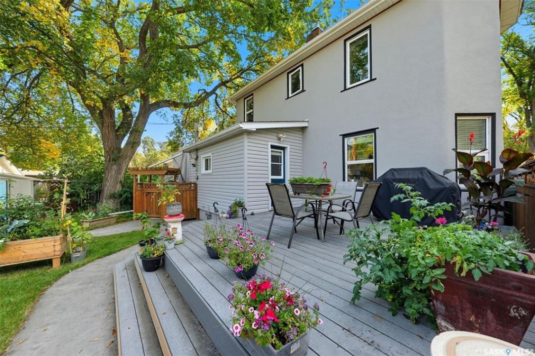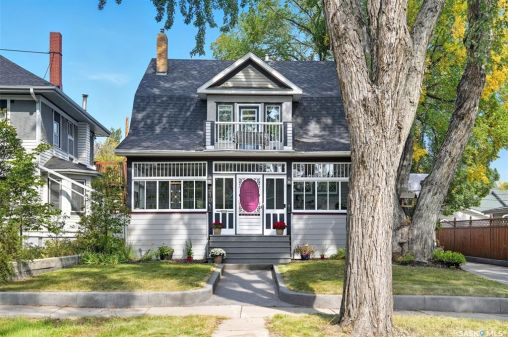 This beautifully maintained 2 storey character home offers 2,310 sq. ft. on three levels, blending timeless charm with modern upgrades in the heart of Caswell Hill. A welcoming front veranda (27' x 9') sets the stage before entering a den with glass French doors, stained-glass accents, and built-in shelving — perfect as a home office or TV space. The main floor features hardwood floors, a living room with gas fireplace and stone mantle, and a spacious formal dining room with a wet bar and custom desk area. The updated kitchen includes maple cabinetry, granite countertops, stainless steel farmhouse sink, pot filler, stone backsplash, in-floor heat, and appliances, with a built-in seating nook that provides a cozy spot for casual meals. Upstairs offers 3 bedrooms in total: two on the second level including a master with private veranda, plus a flexible third-level bedroom or studio. The second-floor bath features a jet tub and freestanding shower. The fully developed basement adds versatility with a bedroom, refreshed bath, and a new wet bar with cabinetry, sink, fridge, dishwasher, and heated porcelain tile flooring — ideal for entertaining or guest use, with a separate side entrance enhancing convenience. Outdoor spaces include a three-season sunroom, backyard deck (15'11” x 15'10”) with gas BBQ hookup, stamped concrete, perennial landscaping, and RV parking. A highlight of the property is the 42' x 30' heated detached garage, offering abundant space for vehicles, hobbies, or a year-round workshop. High-efficiency furnace, air conditioner, and water heater (2011). Complete with central vac, shed, and appliances included, this Caswell Hill gem is listed at $539,900 (MLS ).