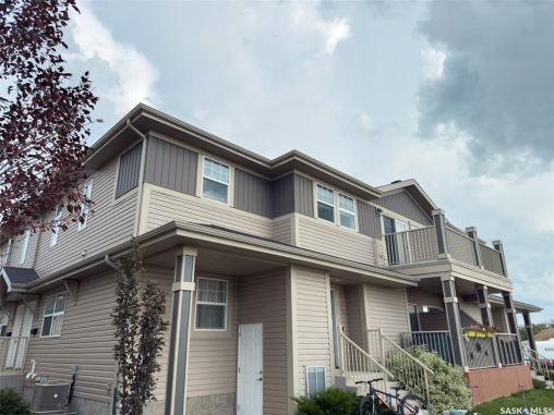 Welcome to the Chaparral Ridge in south Martensville! This upper level townhouse offers over 1,000 sqft of living space, vaulted ceilings and a bright and open layout! The kitchen is well-equipped with dark cabinets, corner pantry, peninsula seating and all appliances included! The dining and living room are spacious with room for entertaining, with a covered deck for your BBQ. Both bedrooms are a good size, the primary with a walk-in closet. A 4 pc bath and a laundry room complete the space. Additional storage in a storage space on the main level, 2 parking spaces and tons of visitor parking across from the unit, make this place extra convenient. Enjoy low condo fees in this family friendly complex, with pets permitted with restrictions. Steps from shops and restaurants and quick access to Costco and Saskatoon! Don't miss out on this home!