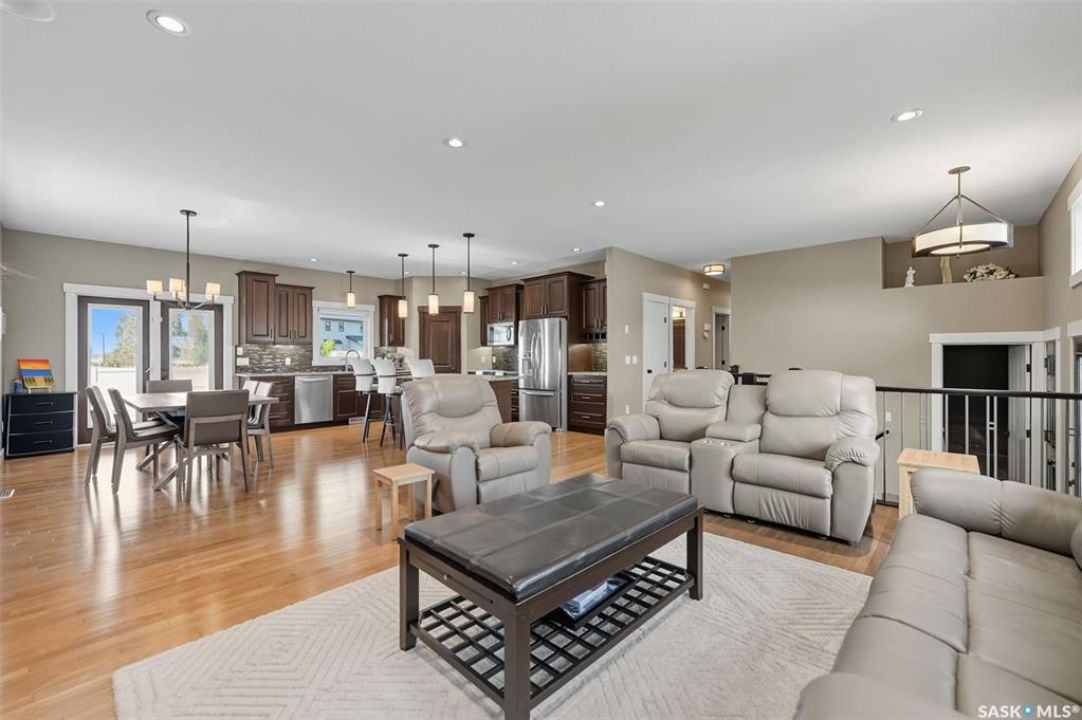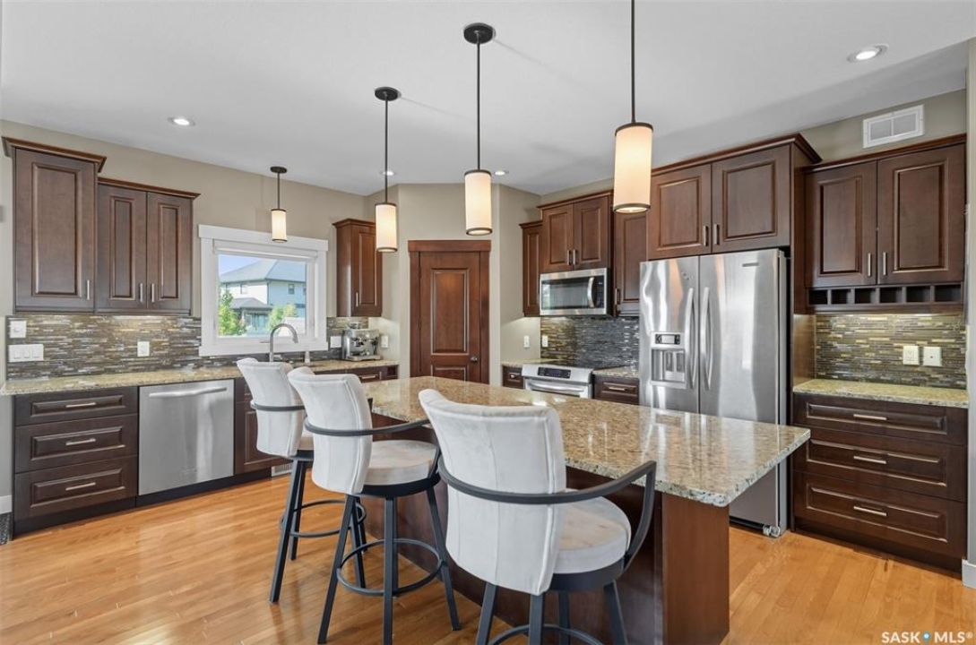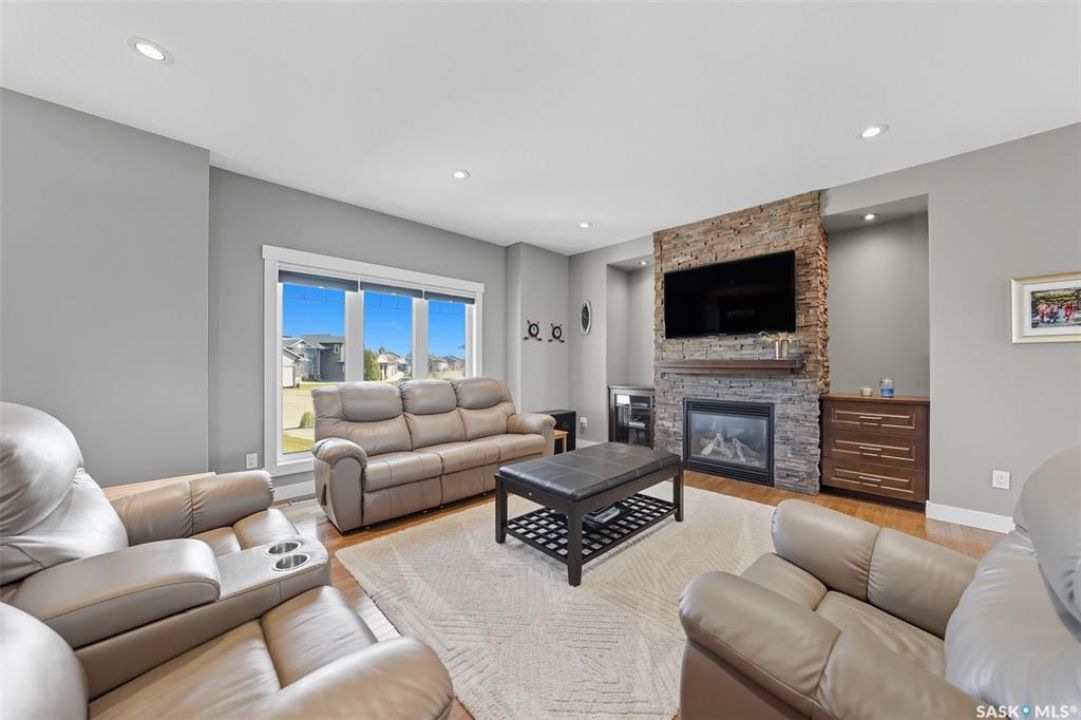 Nestled in the heart of Rosewood, this executive bungalow offers a perfect balance of comfort, functionality, and upscale finishes, backing southwest onto walking trails and greenspace. With an expansive open layout, five spacious bedrooms (3 up, 2 down) and three bathrooms, the home is ideal for family living and entertaining. The main floor showcases hardwood and tile flooring with carpet in the bedrooms, a living room with feature gas fireplace and built-in speakers, and a gourmet kitchen with granite countertops, tile backsplash, under-cabinet lighting, soft-close cabinetry with full-extension drawers, and stainless steel appliances. A walk-in closet off the foyer adds everyday convenience. The primary suite is a true retreat, complete with blackout blinds, a large walk-in closet, and a spa-inspired five-piece ensuite with in-floor heat, jetted tub, dual sinks, tiled shower with glass door, and built-in speakers. Two additional bedrooms, a full bathroom, and a laundry room with built-in cabinetry and sink complete the main level. The fully finished basement offers two more large bedrooms (one currently a gym), a full bathroom with quartz vanity and steam shower, plus an inviting family and games area with feature wall and gas fireplace. The mechanical room provides excellent storage and houses an on-demand water heater, humidifier, and central A/C. Every closet features custom MDF built-ins for exceptional organization. Outdoor living is just as appealing with a covered deck and built-in speakers, large storage shed, and easy access to trails. The attached heated garage measures 26' x 24'/26'. Thoughtfully designed and meticulously maintained, this home is perfectly located with easy access to parks and all area amenities.