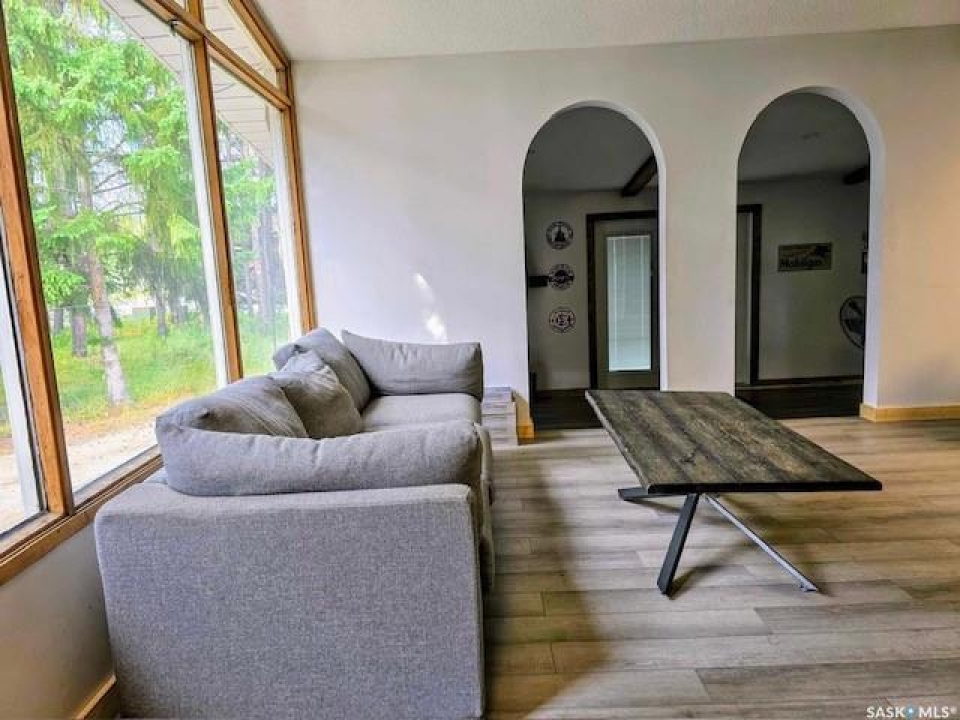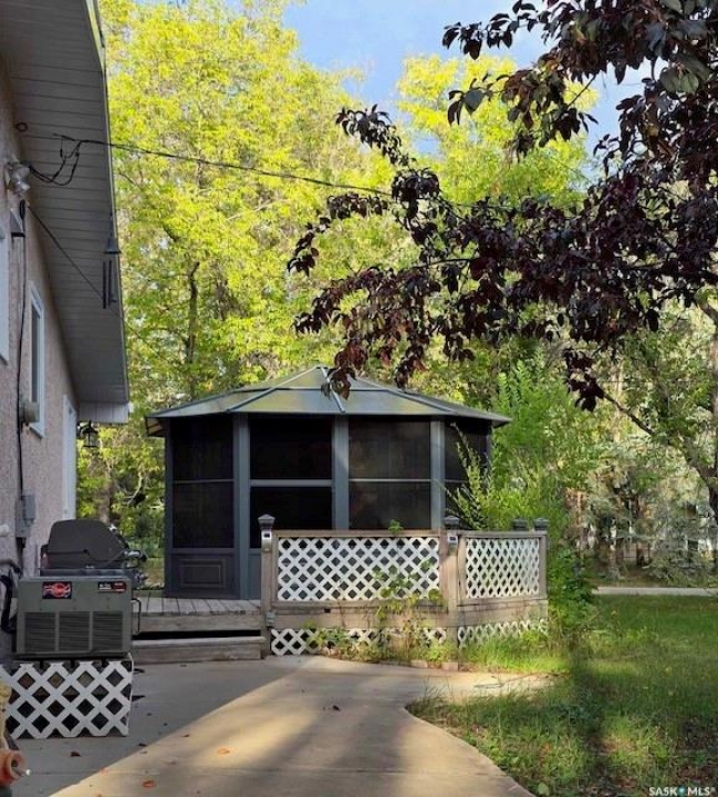 Quaint acreage home just minutes from the city—a peaceful retreat that is move-in ready and available for quick possession! Enjoy delightful evenings on the back deck, sheltered within a screened gazebo. The double heated garage and secluded yard offer plenty of room for leisure, hobbies, and family fun. This 4-bedroom, 2-bathroom bungalow has undergone recent, stylish renovations including new floors and baseboards, enhanced by an eye-catching barn board feature wall and newly redone kitchen cabinets. A few steps down to the den/games room, complete with a natural gas fireplace, provides extra space for entertainment or a peaceful area for relaxation. The basement design includes a cozy living room, 2 rooms, both used as bedrooms as there is a unique, connected walk through closet. There is also a large, modernized bathroom with walk-in shower accessible from the bedroom and hallway and you will have peace of mind with the newly upgraded septic system. Most of the windows have been replaced (2021&2022), walk-in spa tub (2021) in main bathroom and new gazebo (2022).