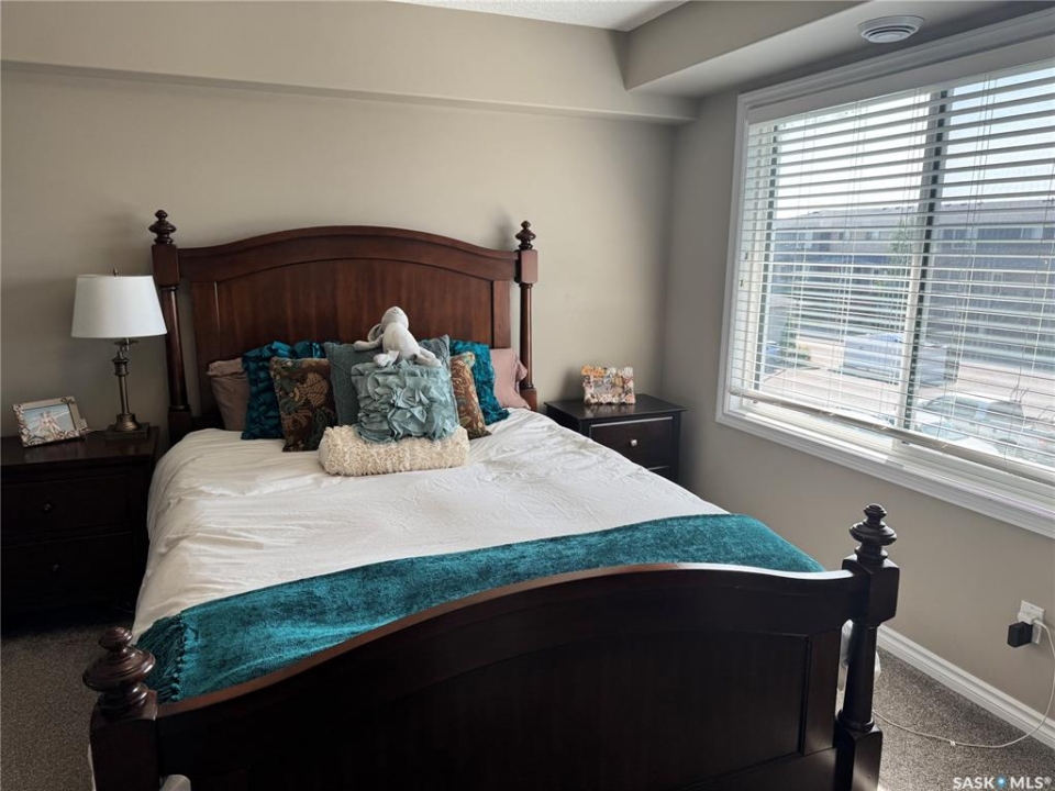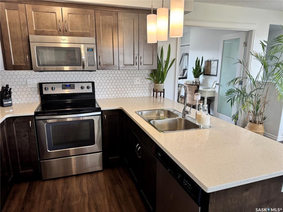 Park Views, Sunlight, and Style—This Corner Condo Has It All! Welcome to your top-floor retreat, a spacious 1,260 sq ft corner unit that blends modern finishes with unbeatable convenience. Overlooking the park and just steps from schools, shops, and everyday amenities, this home offers the perfect mix of comfort and lifestyle. Step inside through a private entry with a roomy coat closet and head up to the bright, open-concept living and dining area. Thanks to its corner location, this home is drenched in natural light from extra windows, creating a warm and inviting atmosphere. The kitchen is a true standout—complete with maple cabinetry, quartz countertops, stainless steel appliances, a stylish custom backsplash, pantry, and a huge eat-up peninsula that's perfect for family gatherings or entertaining friends. With three generous bedrooms, you'll have all the space you need. One bedroom features elegant French doors, making it an ideal home office, while the primary suite boasts a luxurious four-piece ensuite. An additional four-piece bathroom ensures comfort and convenience for guests or family members. This move-in-ready condo also comes equipped with air conditioning and a large balcony where you can relax and enjoy the park views. Parking is a breeze with a single detached garage, an electrified surface stall, and ample street parking right outside your door. Stylish, spacious, and perfectly located—this home is a complete package at an incredible price.