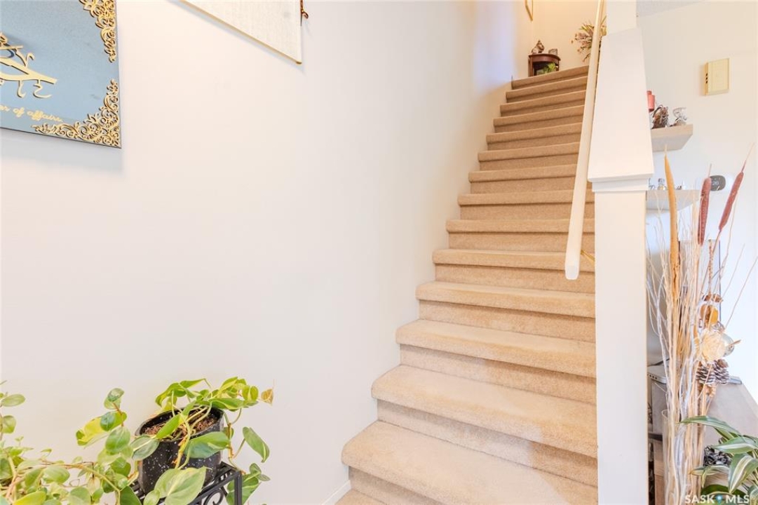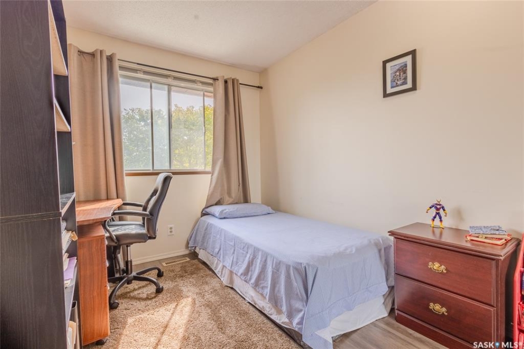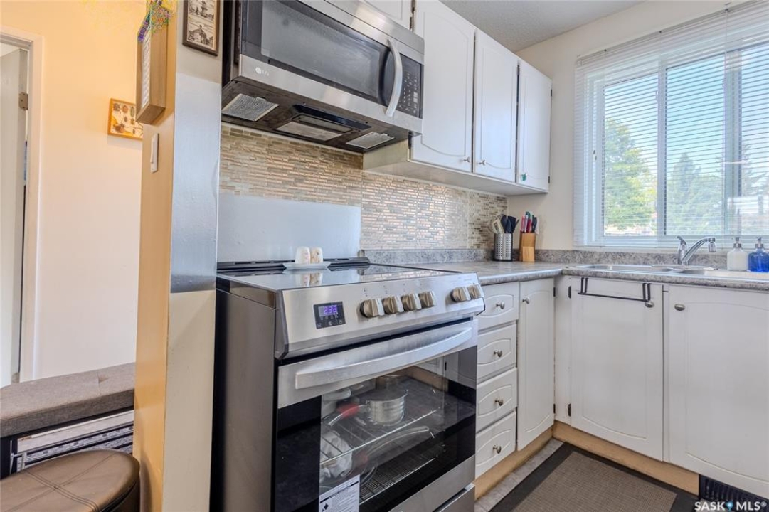 Situated in a great location within Wildwood Village, directly across from a playground and close to bus routes and all 8th Street amenities, this townhouse offers comfort and convenience at an affordable price. The main floor features a bright living room with a large south-facing window that fills the space with natural light, opening to the dining area. The functional kitchen includes a built-in dishwasher, backsplash, new microwave with hood fan, double sink, and a new kitchen window with a view of the playground. A conveniently located half bath just off the front entry completes the main level. Upstairs, you'll find laminate flooring throughout, a spacious primary bedroom with a new window, two additional bedrooms, and a full bathroom. The basement offers additional living space with a rec area and a laundry/storage room. Outside, enjoy a private, fully fenced south-facing backyard with a patio that is deeper than most units. Recent updates include new windows in the kitchen and primary bedroom, laminate flooring upstairs, a new stove, and a new microwave hood fan. The parking lot was freshly redone in 2024. This move-in ready home is ideal for first-time buyers, young families, investors, or anyone looking for a low-maintenance property in a convenient east-side location. Call your Realtor today to book your private showing!