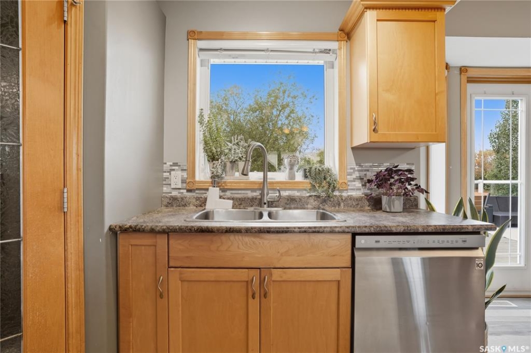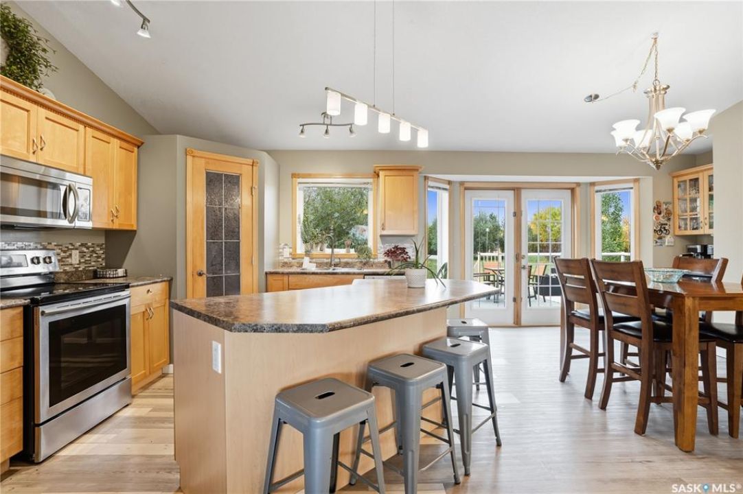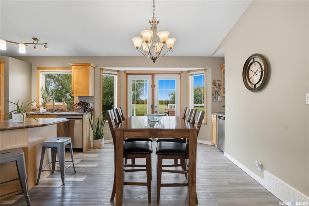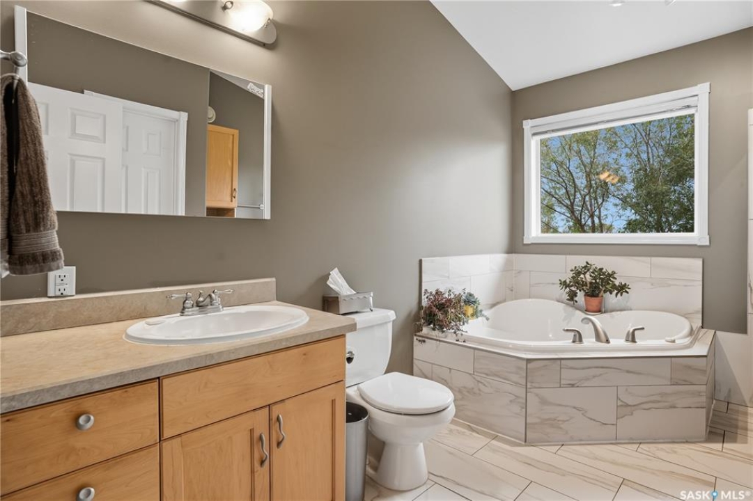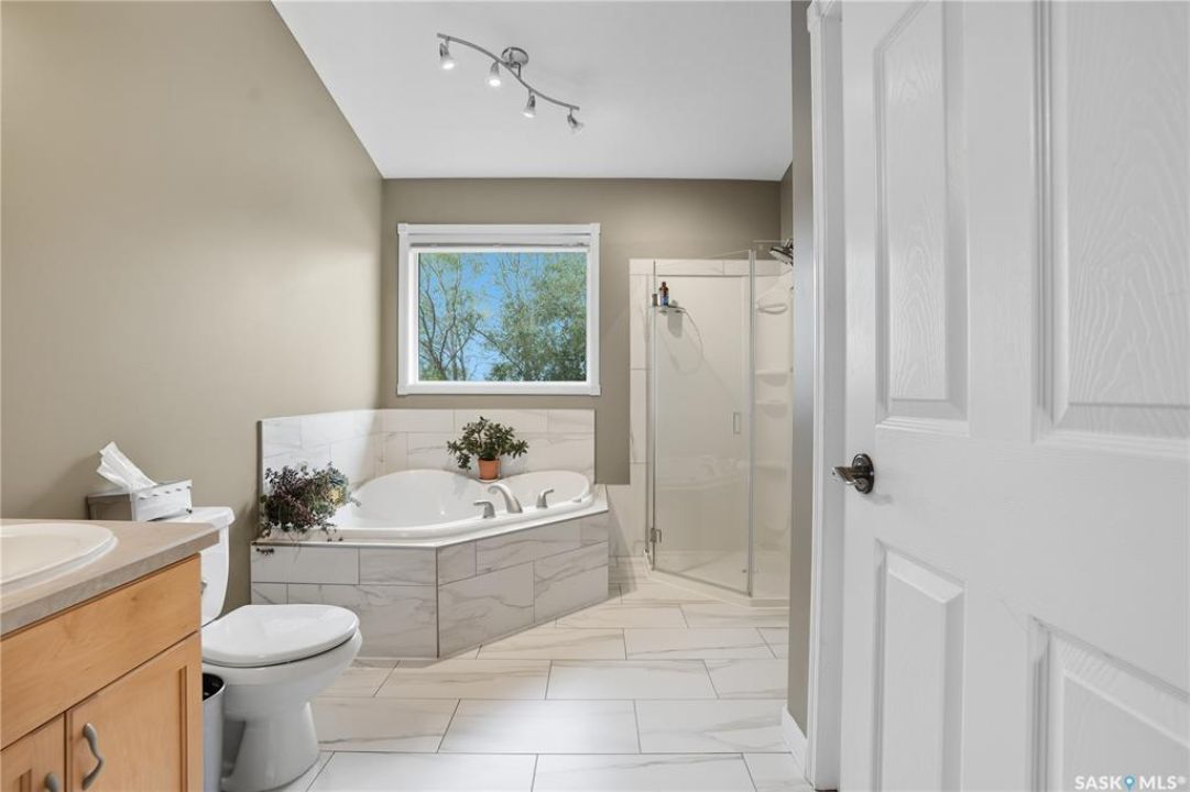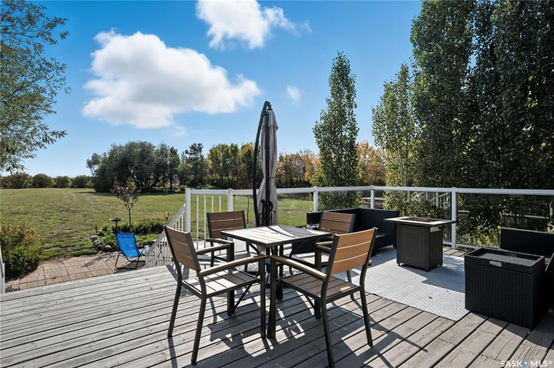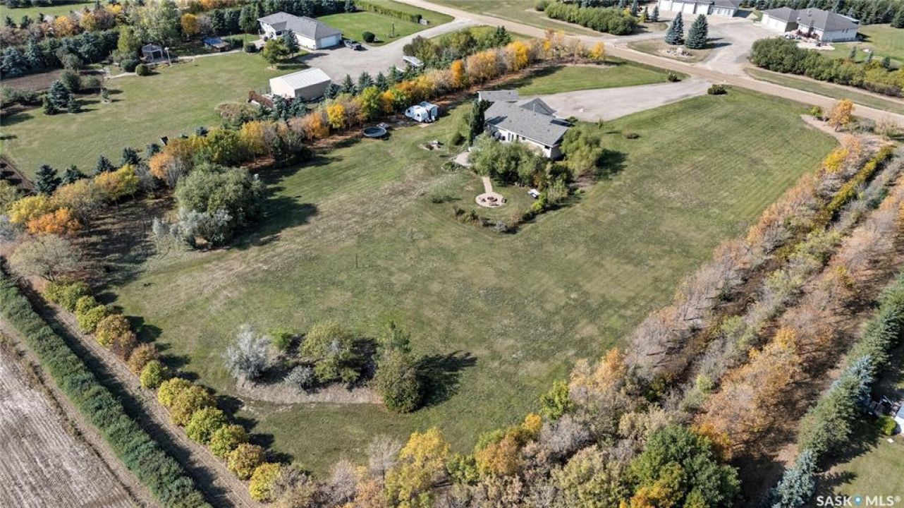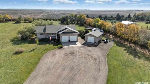 Tucked into Valley Ridge Estates and surrounded by mature trees, shrubs and natural screening! This private 2.77 acre property offers country living, while being only seconds away from Moose Jaw city limits and walking distance to the brand new Coteau Hills elementary school. Built in 2002 and lovingly maintained, this home features a comfortable main floor with an open concept kitchen/dining and living room featuring vaulted ceilings and a gas fireplace. The primary bedroom boasts a generous ensuite with a Jacuzzi tub, standalone shower and a large walk-in closet. Another full bathroom, a separate laundry room as well as an additional bedroom complete the main floor living space. The fully finished lower level is bright and airy thanks to the oversized windows found throughout. A large family room, three additional good size bedrooms and another 4 piece bath with jacuzzi tub complete the lower level. The double car attached garage plus an additional 16' x 24' detached garage provide ample storage for all of your toys and equipment. The rear of the home features a large south facing deck and a lower patio area perfect for entertaining or enjoying your hot tub(included). This home is move in ready, the only thing left to do is put your feet up and enjoy the peace and tranquility. Recent updates include shingles (2020), new furnace (2024), hot water heater (2022), new flooring in basement (2017), new flooring upstairs (2019). Property is on Municipal water.