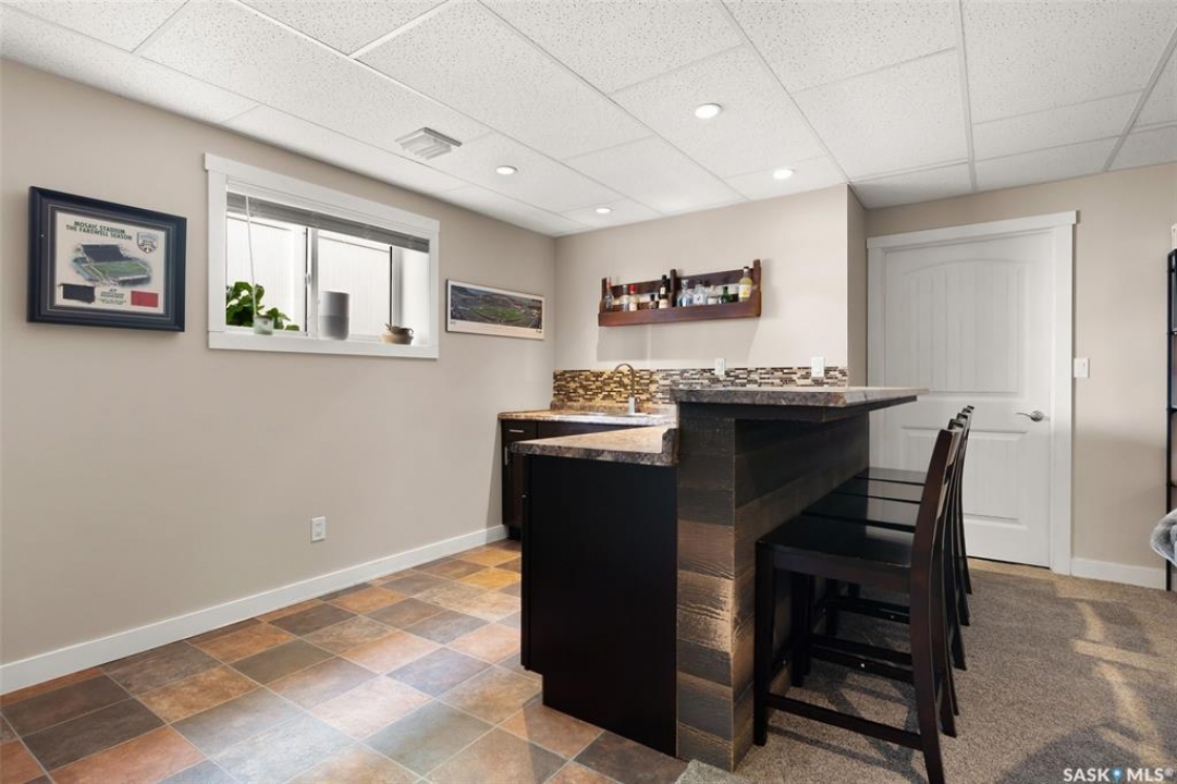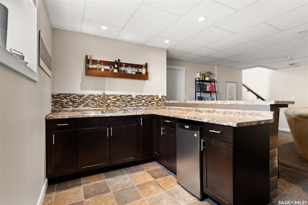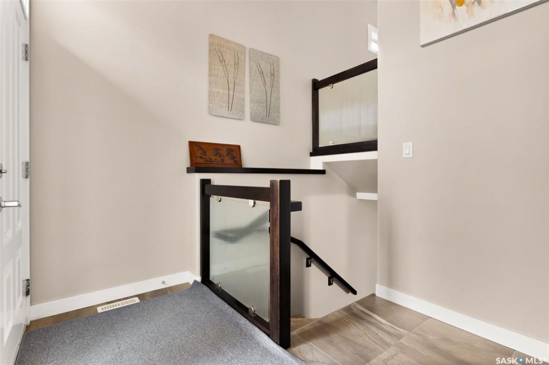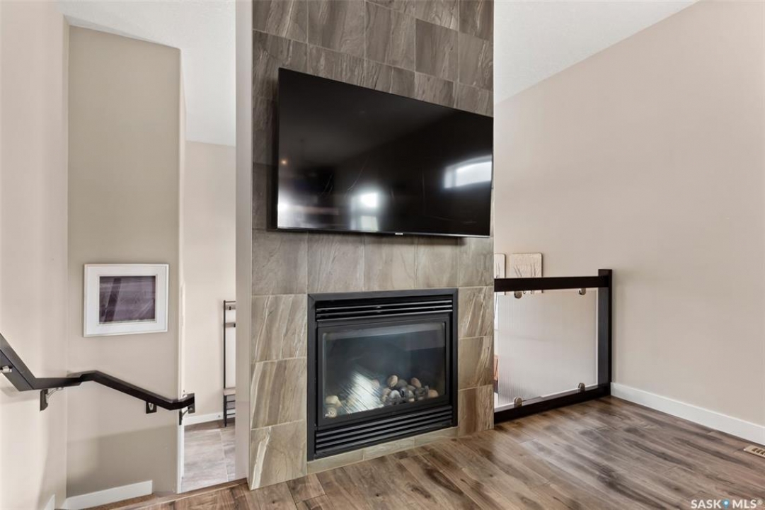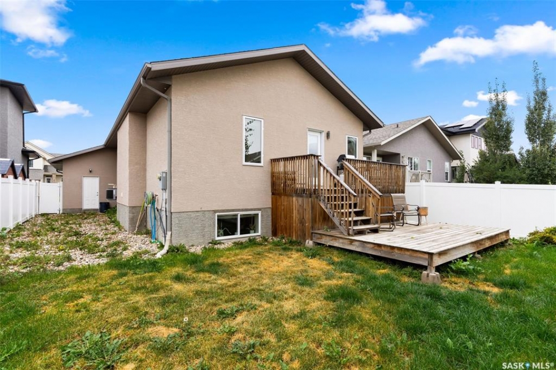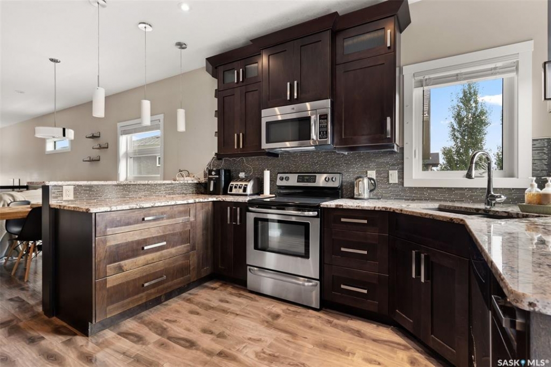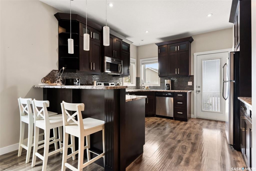 This stunning 5 bed, 3 bath bi-level perfectly blends style, function, and location—nestled on a quiet street just steps from both public and Catholic elementary schools, playgrounds, and the convenience of Acre 21 shopping and dining. From the moment you step inside, the grand tiled foyer makes a statement. A striking feature wall with a gas fireplace sets the tone, while the custom glass-inset railing hints at the thoughtful upgrades throughout. Upstairs, soaring 9' ceilings and warm engineered hardwood floors create an inviting atmosphere. The kitchen is a true centerpiece, featuring rich dark cabinetry, a corner double sink framed by two windows, granite countertops, stainless tiled backsplash, pantry, and a peninsula with seating—perfect for morning coffee or evening conversation. The primary suite is a retreat of its own, complete with a walk-in closet and a 4-piece ensuite. Two additional bedrooms, a 4-piece bath, and the convenience of main-floor laundry round out the upper level. The fully finished basement offers even more living space with a bright rec room, wet bar for entertaining, two large bedrooms, and a 3-piece bath. Every detail has been considered, from the HE furnace, Central A/C, HRV, and tankless water heater to the sump pump and backflow valve. The triple-car garage is insulated and boarded, with a handy side yard access door—perfect for families with multiple vehicles, hobbies, or storage needs. Step outside to the south-facing backyard with a two-tiered deck and durable PVC fencing. Built by Queen City Custom Homes.
