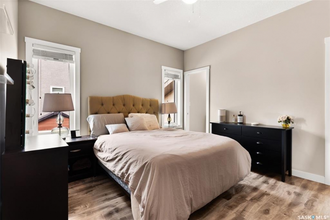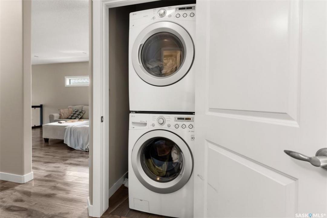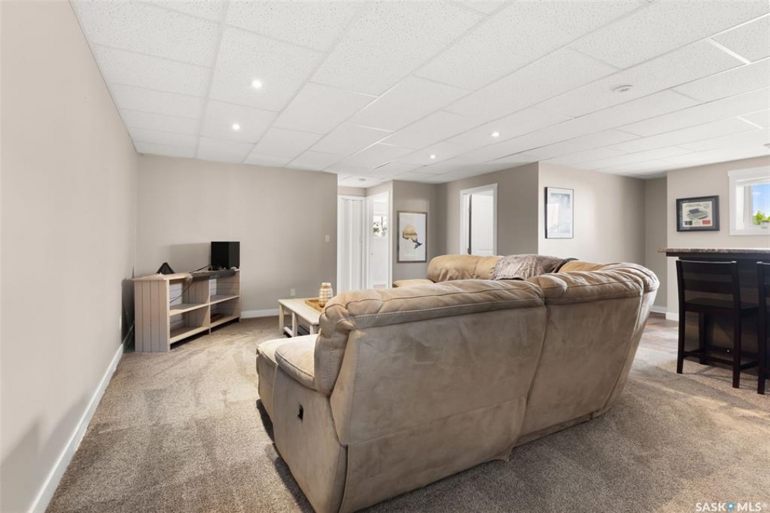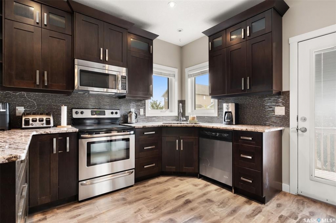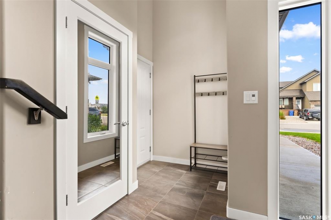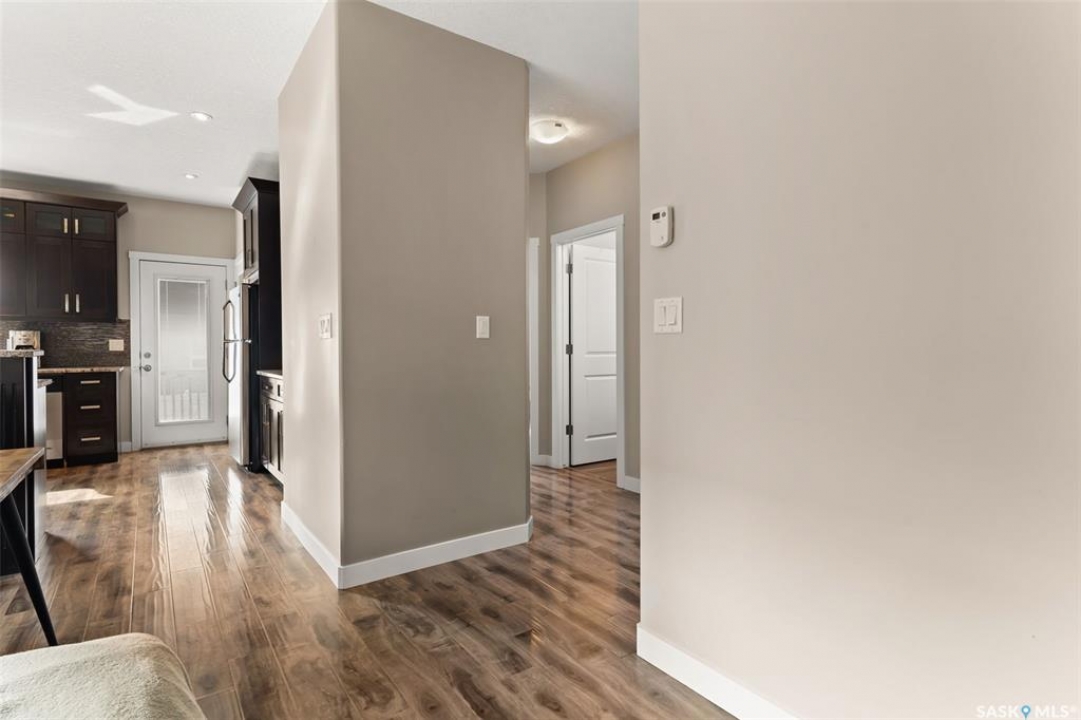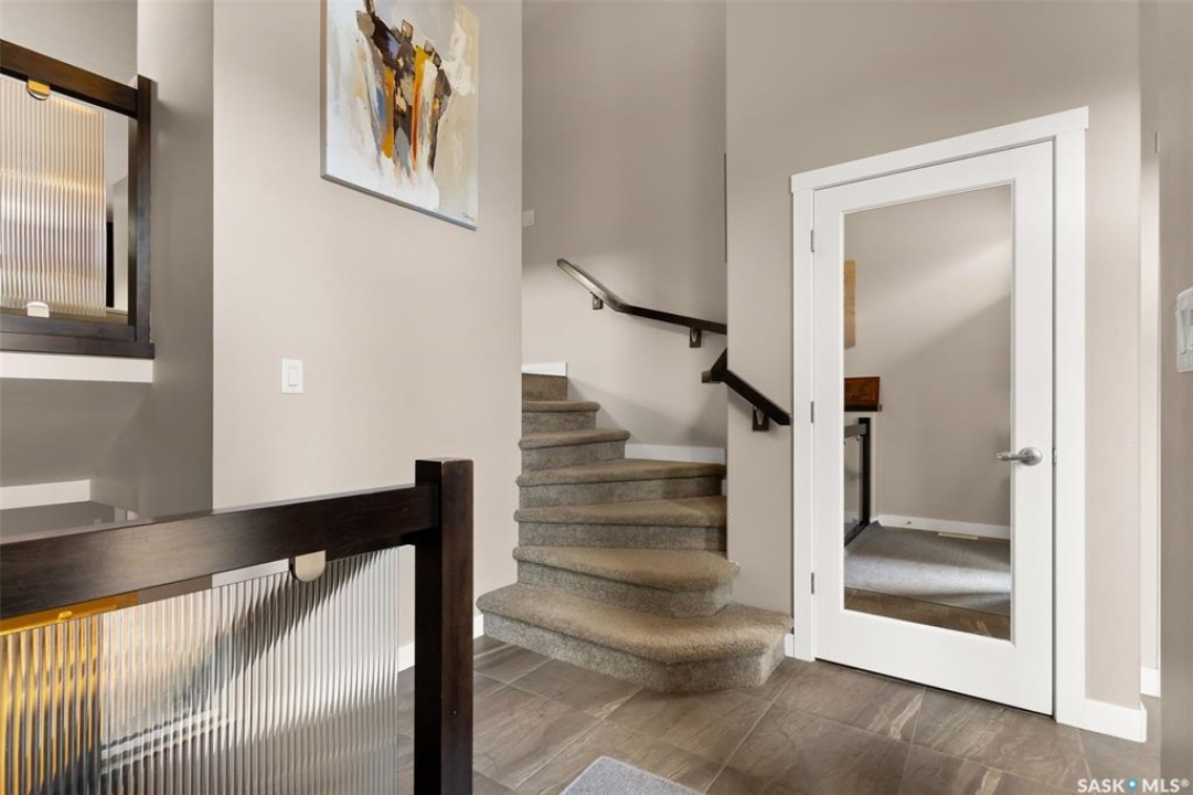 This stunning 5 bed, 3 bath bi-level perfectly blends style, function, and location—nestled on a quiet street just steps from both public and Catholic elementary schools, playgrounds, and the convenience of Acre 21 shopping and dining. From the moment you step inside, the grand tiled foyer makes a statement. A striking feature wall with a gas fireplace sets the tone, while the custom glass-inset railing hints at the thoughtful upgrades throughout. Upstairs, soaring 9' ceilings and warm engineered hardwood floors create an inviting atmosphere. The kitchen is a true centerpiece, featuring rich dark cabinetry, a corner double sink framed by two windows, granite countertops, stainless tiled backsplash, pantry, and a peninsula with seating—perfect for morning coffee or evening conversation. The primary suite is a retreat of its own, complete with a walk-in closet and a 4-piece ensuite. Two additional bedrooms, a 4-piece bath, and the convenience of main-floor laundry round out the upper level. The fully finished basement offers even more living space with a bright rec room, wet bar for entertaining, two large bedrooms, and a 3-piece bath. Every detail has been considered, from the HE furnace, Central A/C, HRV, and tankless water heater to the sump pump and backflow valve. The triple-car garage is insulated and boarded, with a handy side yard access door—perfect for families with multiple vehicles, hobbies, or storage needs. Step outside to the south-facing backyard with a two-tiered deck and durable PVC fencing. Built by Queen City Custom Homes.
