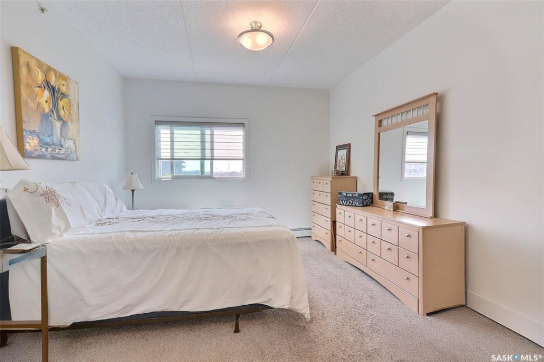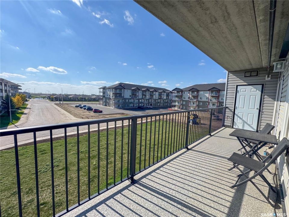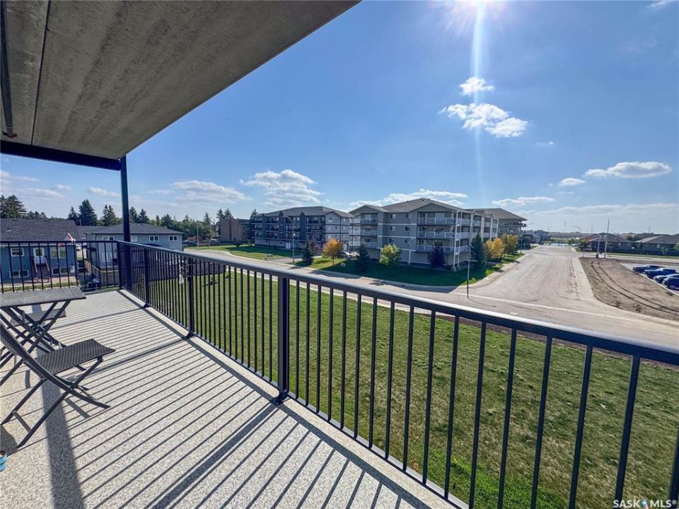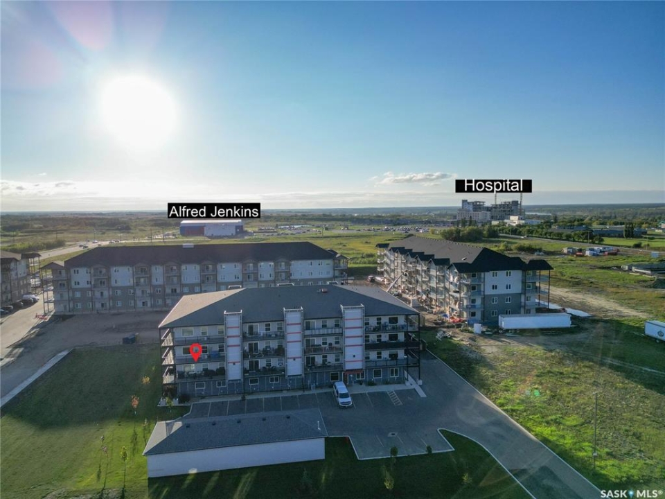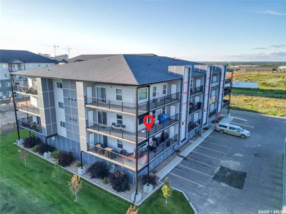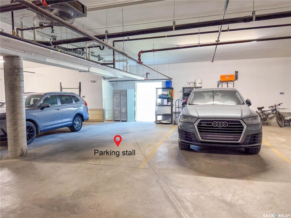 Stunning 2 bedroom, 2 bathroom condo offering 1,174 sq ft of luxury and low-maintenance living. This open-concept home features vinyl plank flooring and quartz countertops throughout, a bright white kitchen with stainless steel appliances, a 6' island, and expansive windows that flood the space with natural light. Soaring 9' ceilings enhance the spacious feel, while the southeast-facing covered wrap-around balcony includes two electrified and insulated storage rooms plus a natural gas BBQ line. The primary suite boasts its own bathroom, and the in-suite laundry provides additional storage space for convenience. Building amenities include an elevator, heated parking garage space, workshop, common room with a kitchenette, and an exercise area. Ideally located near the Alfred Jenkins Field House, hospital, and many other amenities, this condo combines elegance, comfort, and ease of living.