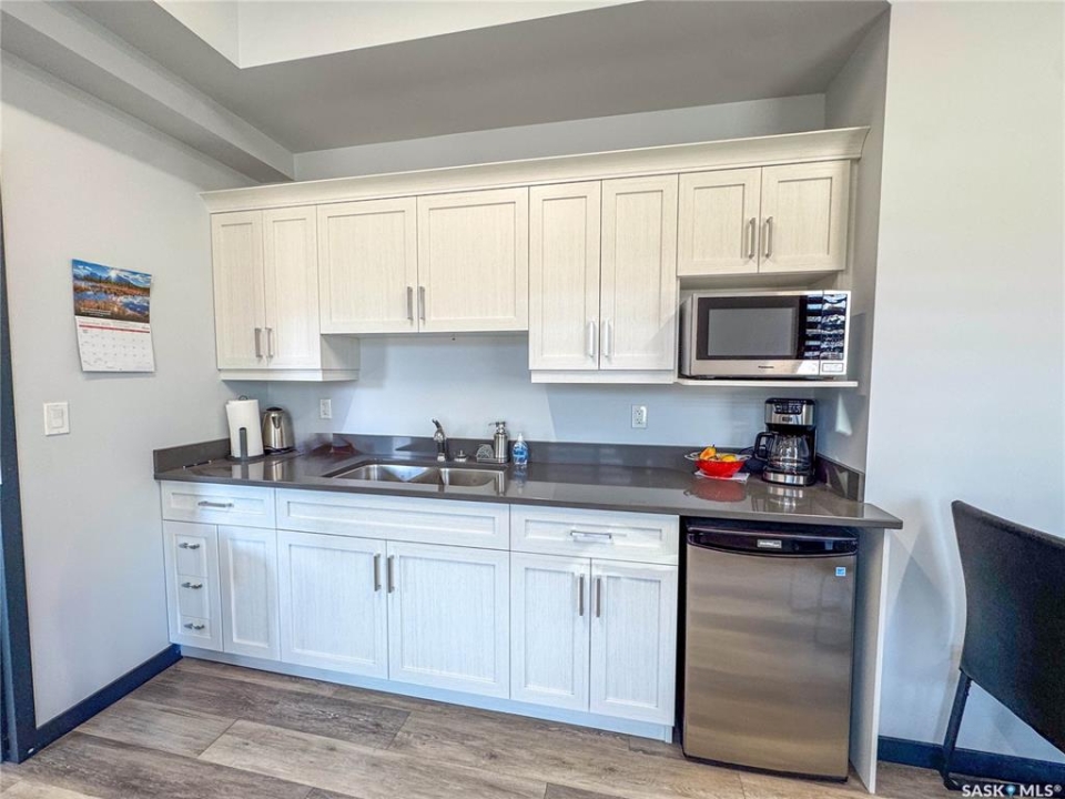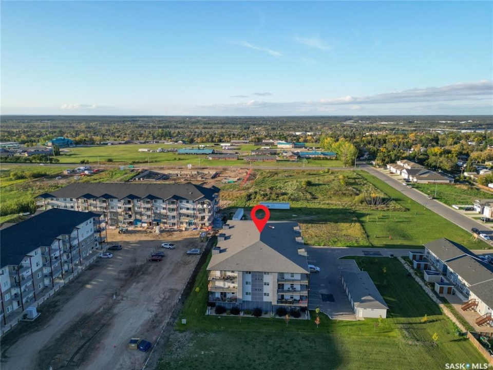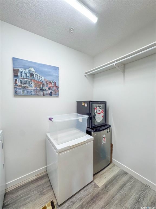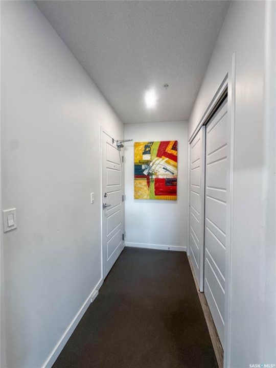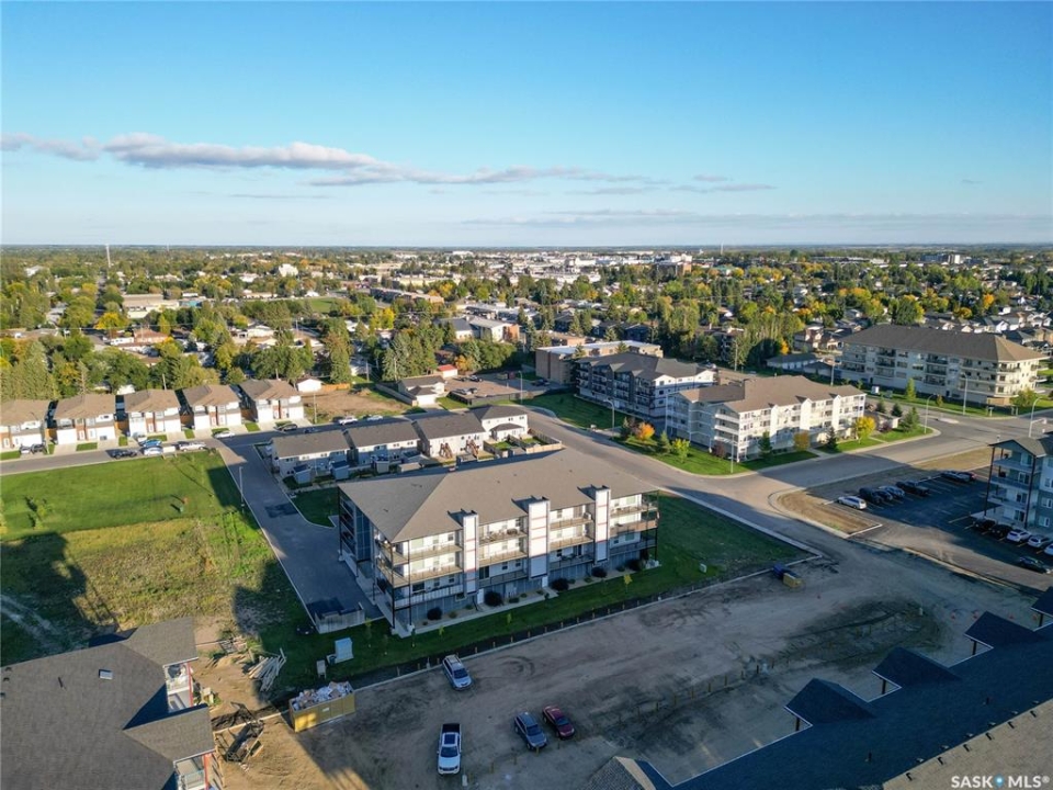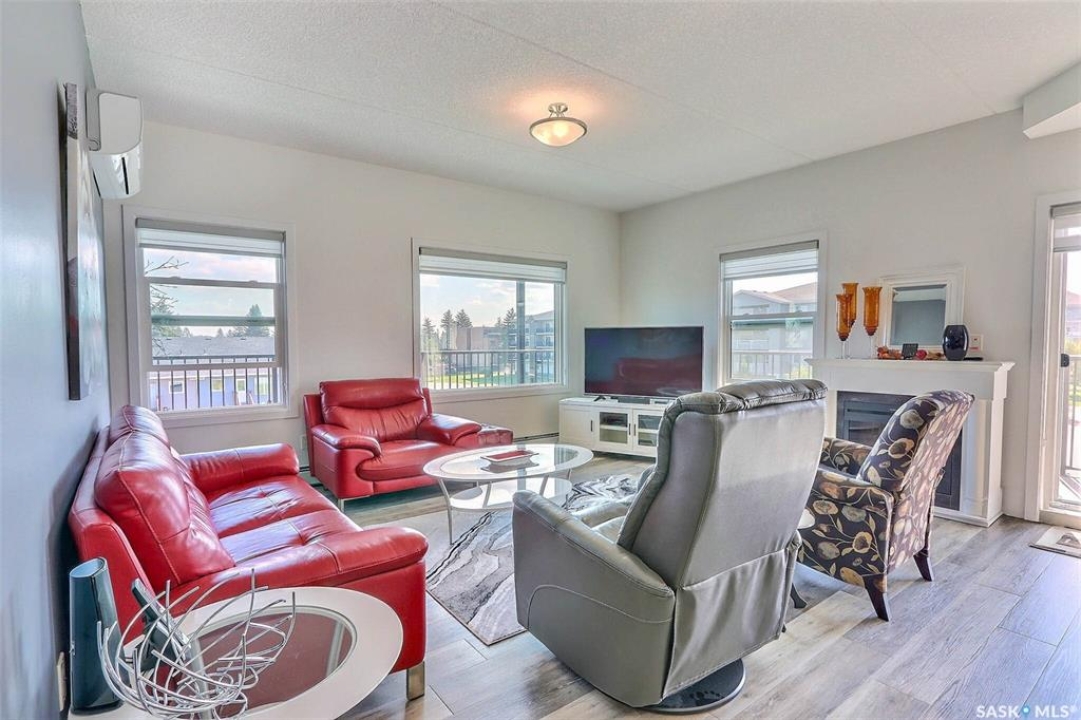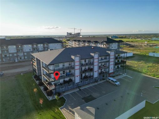 Stunning 2 bedroom, 2 bathroom condo offering 1,174 sq ft of luxury and low-maintenance living. This open-concept home features vinyl plank flooring and quartz countertops throughout, a bright white kitchen with stainless steel appliances, a 6' island, and expansive windows that flood the space with natural light. Soaring 9' ceilings enhance the spacious feel, while the southeast-facing covered wrap-around balcony includes two electrified and insulated storage rooms plus a natural gas BBQ line. The primary suite boasts its own bathroom, and the in-suite laundry provides additional storage space for convenience. Building amenities include an elevator, heated parking garage space, workshop, common room with a kitchenette, and an exercise area. Ideally located near the Alfred Jenkins Field House, hospital, and many other amenities, this condo combines elegance, comfort, and ease of living.
