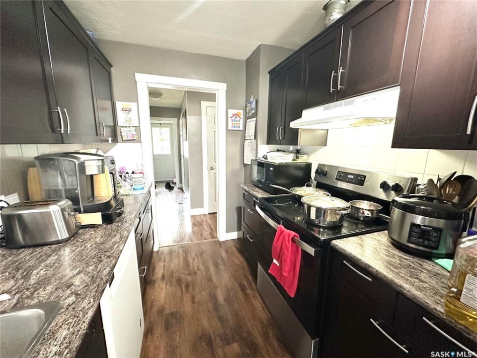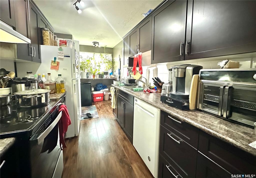 This home located on the west side of North Battleford in an excellent location has two beautifully renovated suites both with own entry and laundry and shared utilities. This truly unique home has 6 bedrooms and a 14x20 shed with 11 parking stalls. 9 stalls are currently allocated to the commercial building adjacent and an easement will be in place for the use of these stalls. On the main the kitchen has been recently replaced and offers 3 spacious bedrooms and an updated bathroom. The basement suite is accessed off the back with its own entry and has 10 foot ceilings. This suite is also extensively renovated with an updated kitchen and flooring. The backyard has a shed added in 2019 that is 14x20 and a driveway that accommodated 2 cars.