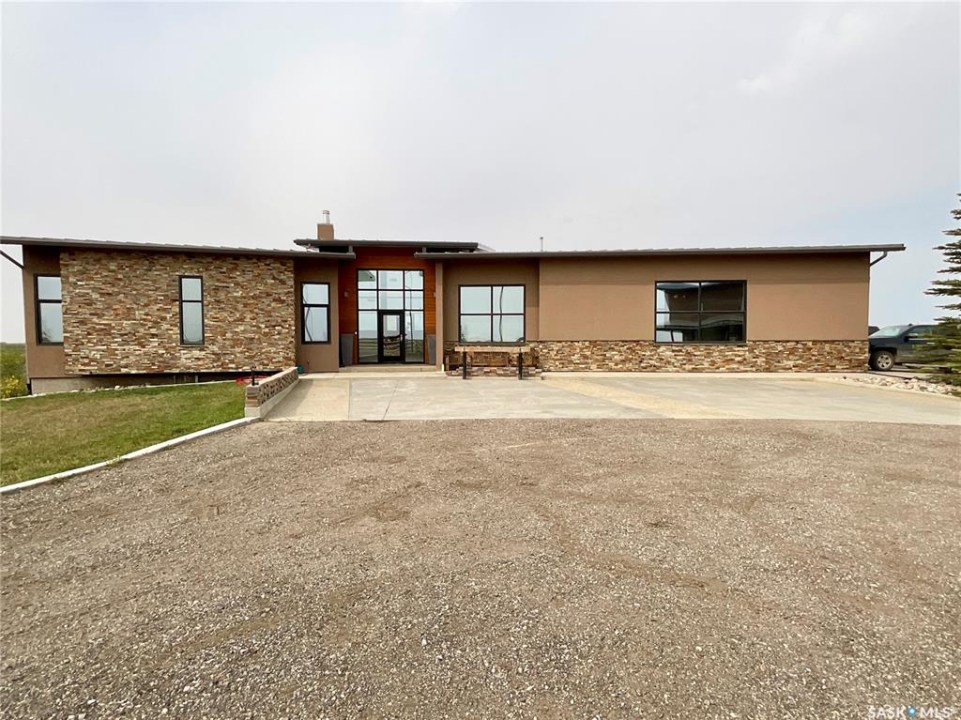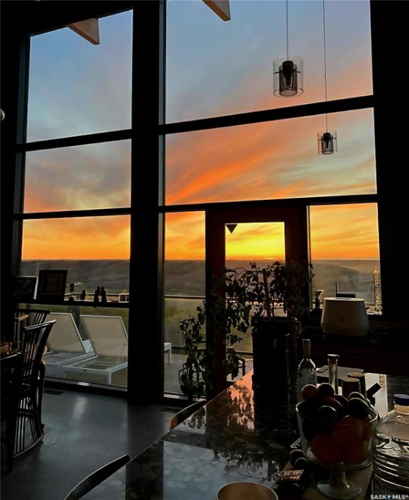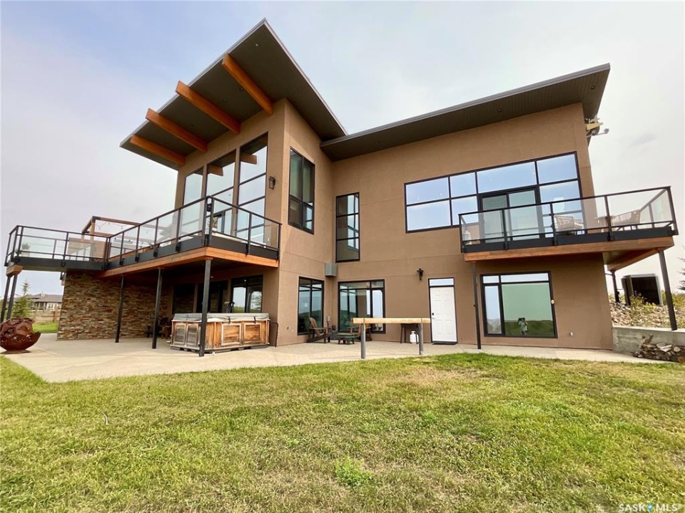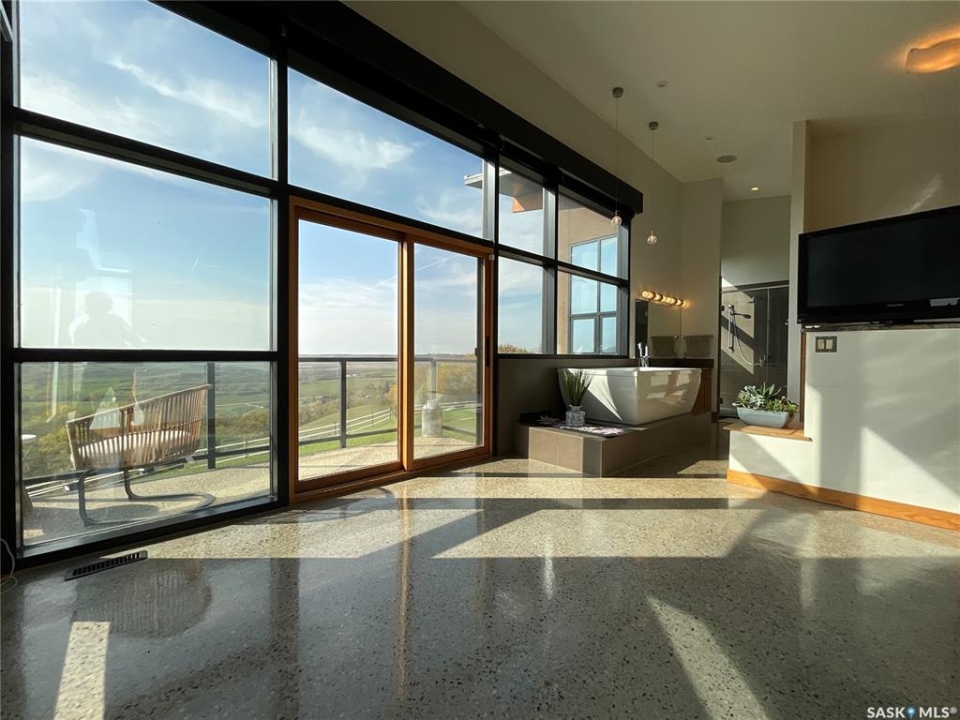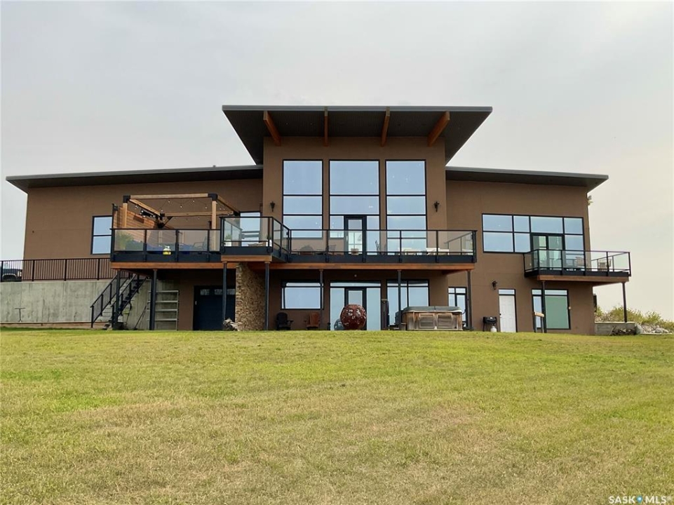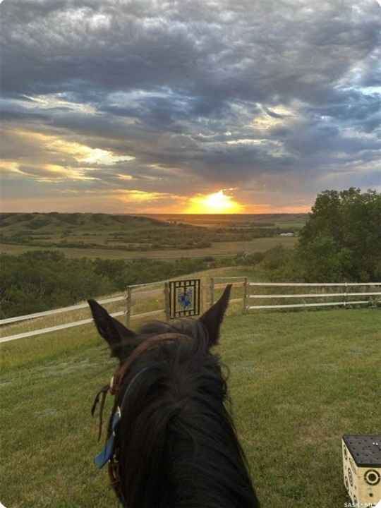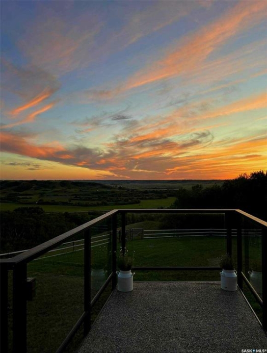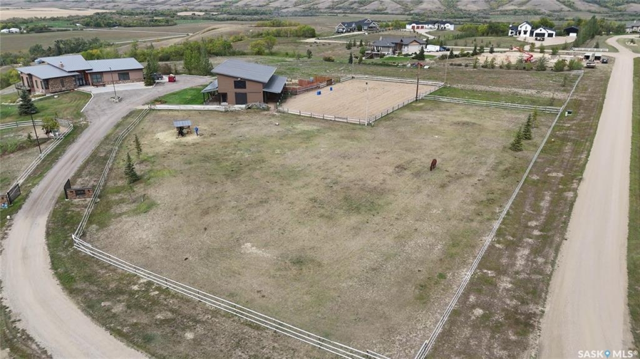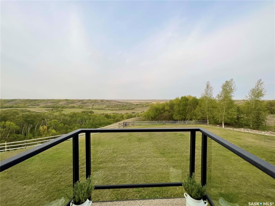 Experience 40 Apollo Drive in the Acreages at Minerva Ridge near Lumsden. From the powered gate and lit lane, this 5-bedroom, 4-bath home offers 2,200 sq. ft. on the main plus a full walkout level, including a private entrance suite for extended family or a caregiver. Floor-to-ceiling curtain wall windows showcase the Wascana and Qu'Appelle valleys, filling the home with light. Built for comfort and efficiency, the home features zoned in-floor hydronic heating, high-efficiency boiler, gas furnace with A/C backup, spray foam insulation, EIFS stucco, triple-pane argon windows, and a 12.6 kW solar system powering both house and barn—keeping costs near net zero. The kitchen includes a built-in gas cooktop, double wall oven, drawer microwave, fridge, dishwasher, and a butler's pantry with upright freezer and extra fridge. A mudroom with built-ins sits just off the garage. Technology upgrades include RA2 automation for blinds, lights, climate, and locks, whole-home audio, five video screens, Ring security, an 8-camera CCTV system, and permanent holiday lights. The lower level adds a wet bar, games area, and gym with overhead door for fresh air workouts. Outside, enjoy a covered patio with built-in BBQ, 8-person hot tub, and heater. A heated 1,080 sq. ft. garage and 35x70 insulated barn/shop provide storage, stalls, tack room, hay loft, and heated workshop. Equine features include a 100x180 LED-lit riding arena, two fenced pastures with solar fencing, and automatic water systems. Extras include a reinforced secure room, 200-amp service, water softener, and custom cold storage. Lumsden's schools and amenities are minutes away, with Regina only a 15-minute drive. Purchasers also have first right of refusal on the adjoining 3-acre parcel. https://youtu.be/mPkNdWGtmeE