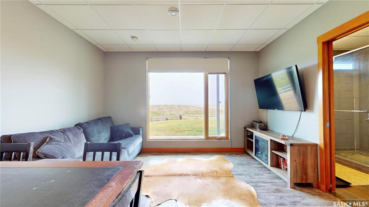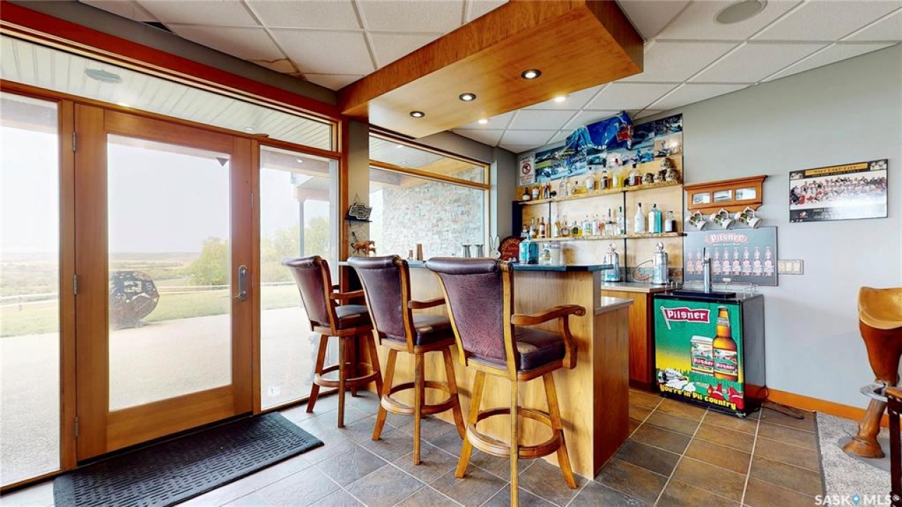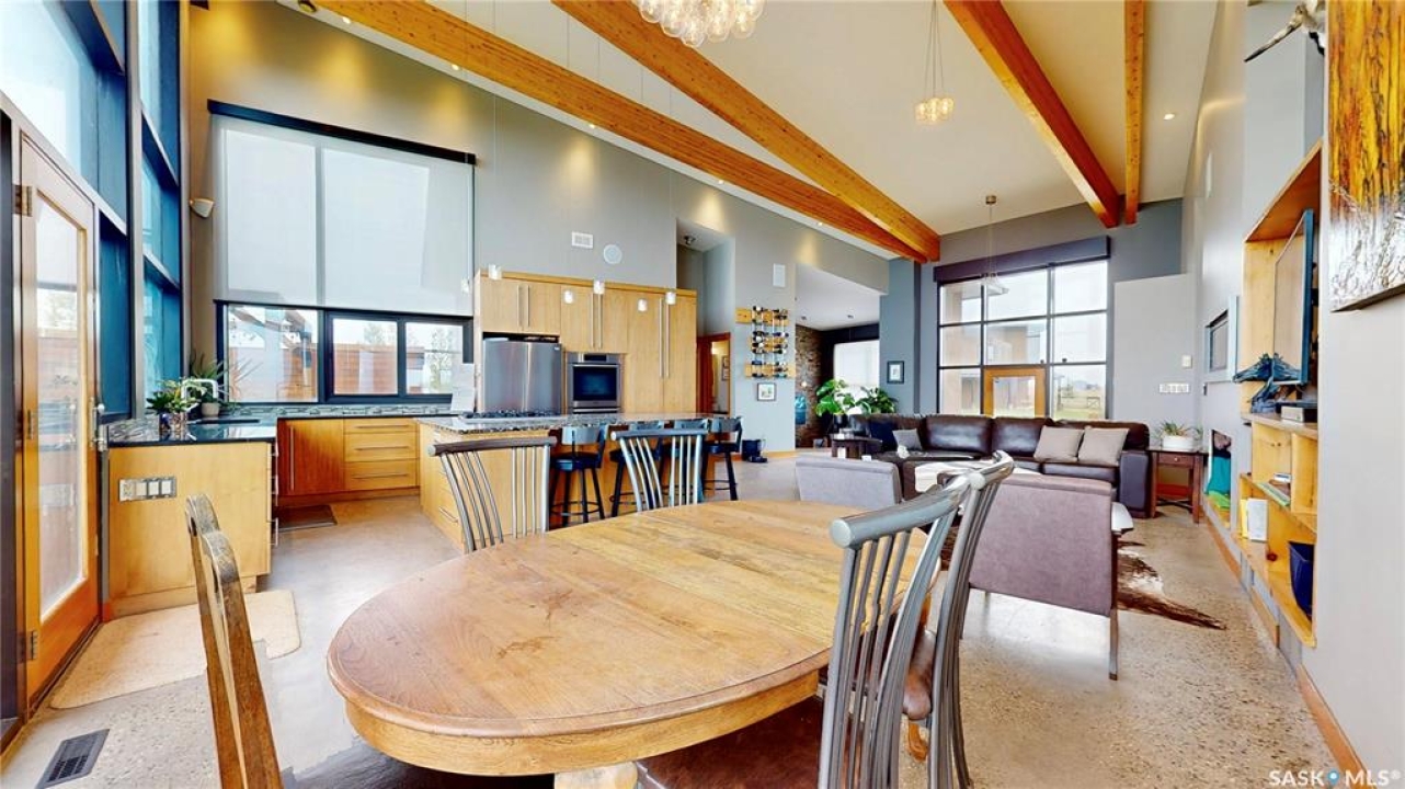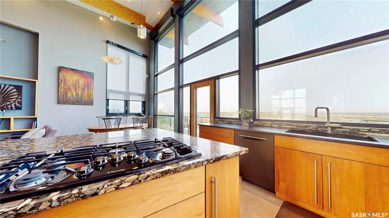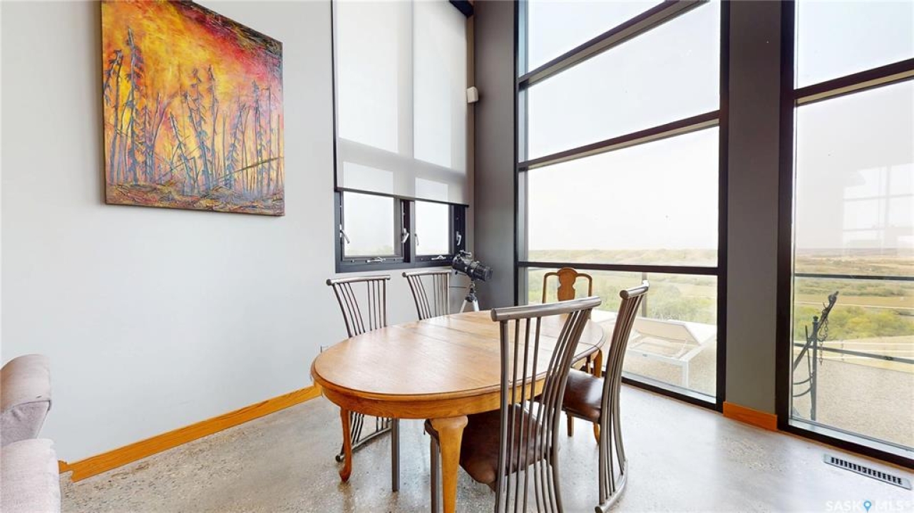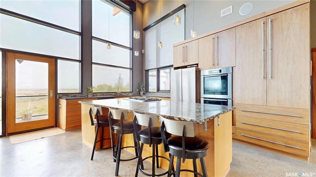 Experience 40 Apollo Drive in the Acreages at Minerva Ridge near Lumsden. From the powered gate and lit lane, this 5-bedroom, 4-bath home offers 2,200 sq. ft. on the main plus a full walkout level, including a private entrance suite for extended family or a caregiver. Floor-to-ceiling curtain wall windows showcase the Wascana and Qu'Appelle valleys, filling the home with light. Built for comfort and efficiency, the home features zoned in-floor hydronic heating, high-efficiency boiler, gas furnace with A/C backup, spray foam insulation, EIFS stucco, triple-pane argon windows, and a 12.6 kW solar system powering both house and barn—keeping costs near net zero. The kitchen includes a built-in gas cooktop, double wall oven, drawer microwave, fridge, dishwasher, and a butler's pantry with upright freezer and extra fridge. A mudroom with built-ins sits just off the garage. Technology upgrades include RA2 automation for blinds, lights, climate, and locks, whole-home audio, five video screens, Ring security, an 8-camera CCTV system, and permanent holiday lights. The lower level adds a wet bar, games area, and gym with overhead door for fresh air workouts. Outside, enjoy a covered patio with built-in BBQ, 8-person hot tub, and heater. A heated 1,080 sq. ft. garage and 35x70 insulated barn/shop provide storage, stalls, tack room, hay loft, and heated workshop. Equine features include a 100x180 LED-lit riding arena, two fenced pastures with solar fencing, and automatic water systems. Extras include a reinforced secure room, 200-amp service, water softener, and custom cold storage. Lumsden's schools and amenities are minutes away, with Regina only a 15-minute drive. Purchasers also have first right of refusal on the adjoining 3-acre parcel. https://youtu.be/mPkNdWGtmeE