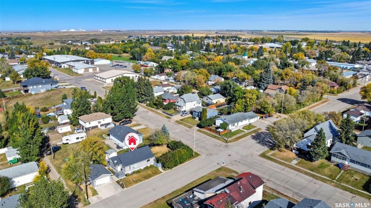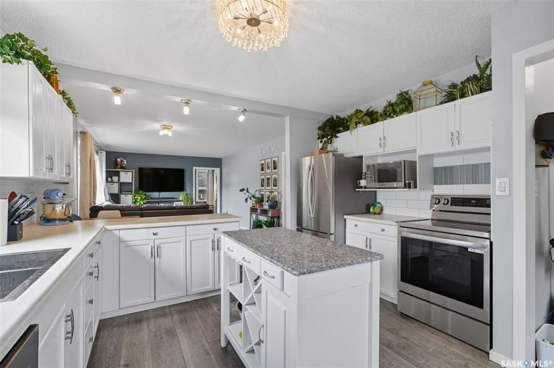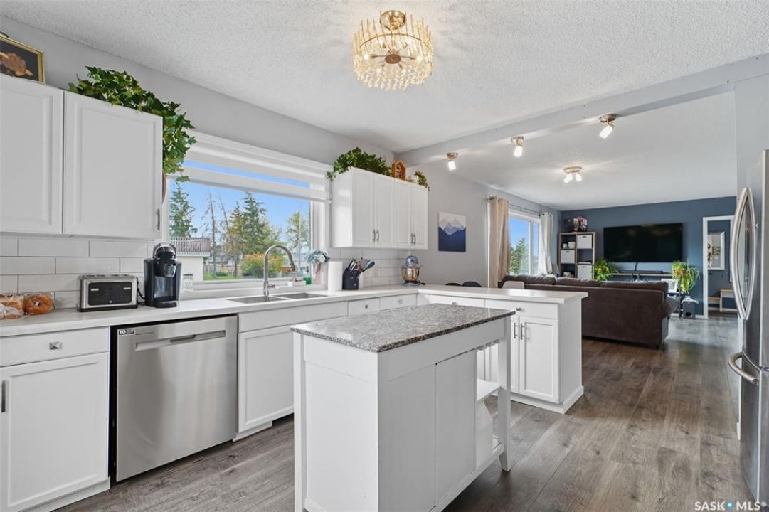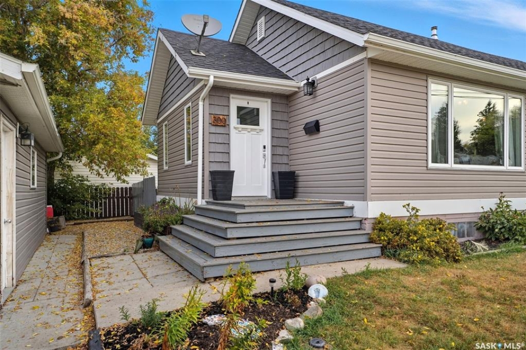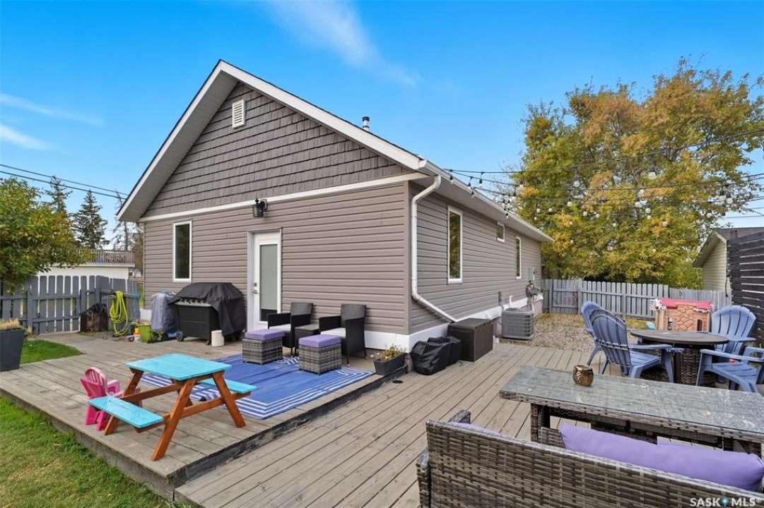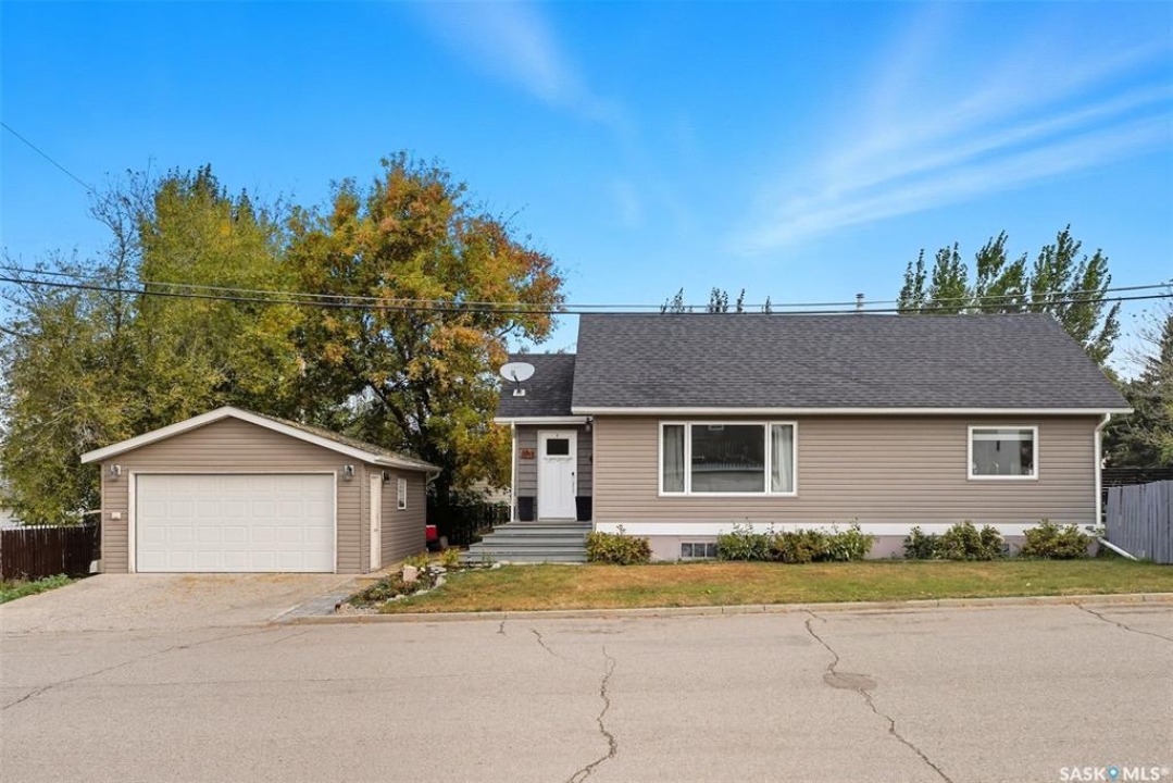 Situated on a large corner lot in Delisle, this 934 square foot home blends comfort, updates, and small-town charm. The front entry offers a practical drop zone and plenty of closet space, setting the tone for an organized and welcoming home. The main floor features an open-concept layout that connects the living room, dining area, and kitchen. Bright white cabinetry, a brand-new stove and dishwasher, and a refreshed sink and backsplash (2025) make the kitchen both cheerful and functional. The primary bedroom includes its own two-piece ensuite, while a second bedroom and a full four-piece bathroom complete the main level. The fully finished basement, completed in 2024, adds valuable living space and includes a new bathroom finished in 2025. Modern comforts like central air conditioning and a heated detached garage ensure year-round convenience. Outdoors, a large back deck with privacy fencing overlooks established perennial gardens, making it an ideal spot for both relaxing and entertaining. With the splash park, ball diamonds, and the golf course all just a short walk away, this property offers the perfect balance of quiet living and community connection. Contact your realtor today to arrange a private viewing