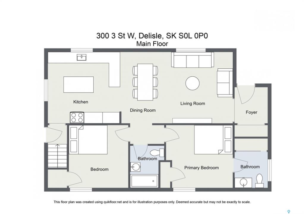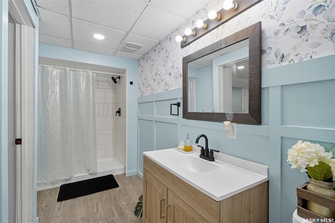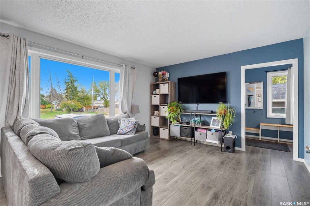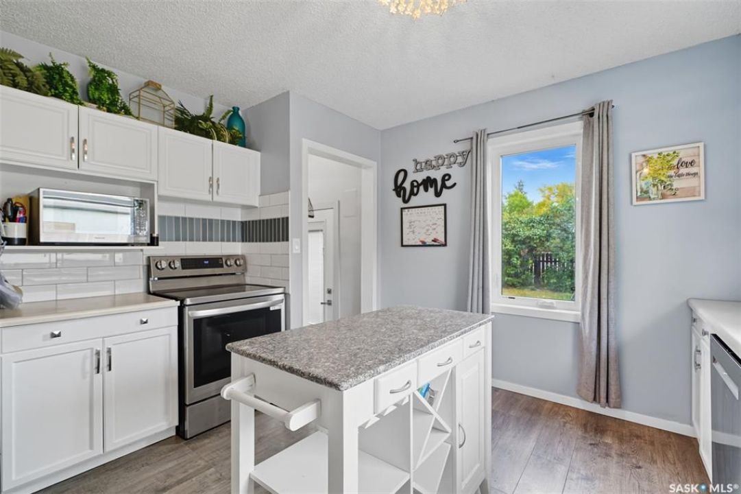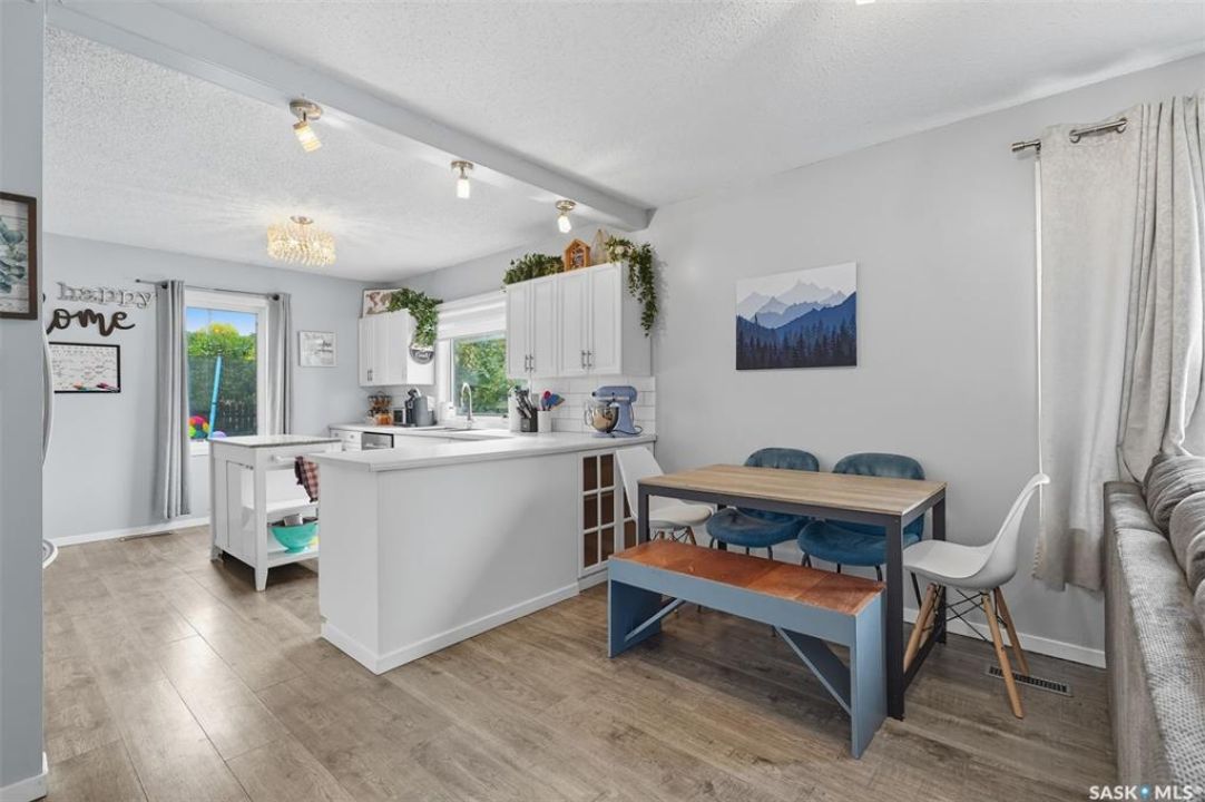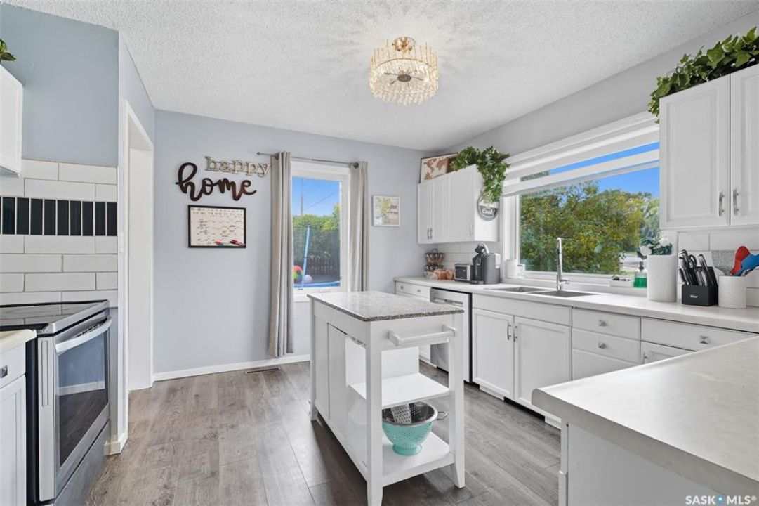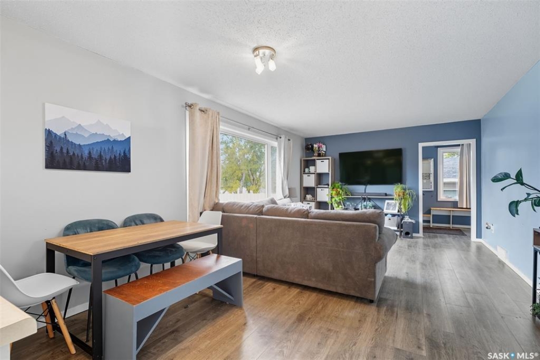 Situated on a large corner lot in Delisle, this 934 square foot home blends comfort, updates, and small-town charm. The front entry offers a practical drop zone and plenty of closet space, setting the tone for an organized and welcoming home. The main floor features an open-concept layout that connects the living room, dining area, and kitchen. Bright white cabinetry, a brand-new stove and dishwasher, and a refreshed sink and backsplash (2025) make the kitchen both cheerful and functional. The primary bedroom includes its own two-piece ensuite, while a second bedroom and a full four-piece bathroom complete the main level. The fully finished basement, completed in 2024, adds valuable living space and includes a new bathroom finished in 2025. Modern comforts like central air conditioning and a heated detached garage ensure year-round convenience. Outdoors, a large back deck with privacy fencing overlooks established perennial gardens, making it an ideal spot for both relaxing and entertaining. With the splash park, ball diamonds, and the golf course all just a short walk away, this property offers the perfect balance of quiet living and community connection. Contact your realtor today to arrange a private viewing