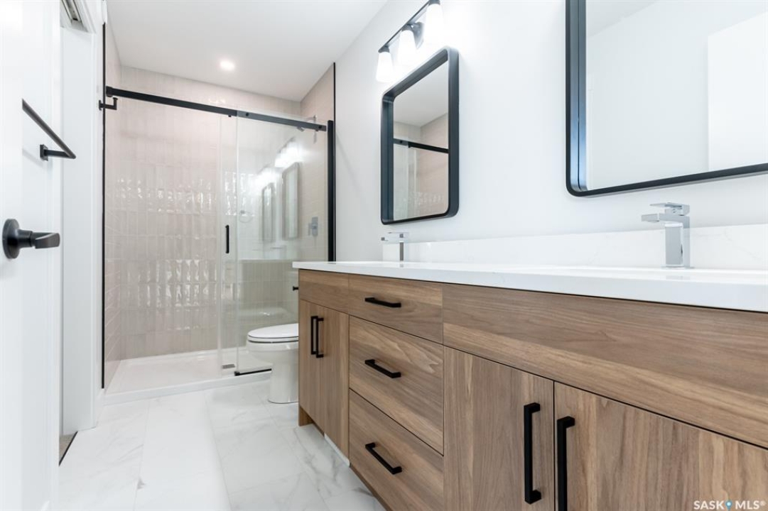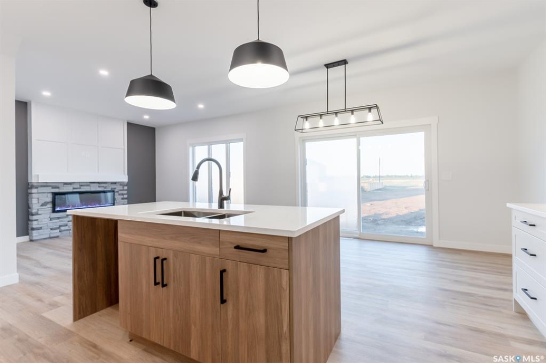 Welcome to The Escada! This beautifully designed 1,848 sq. ft. Step inside from the fully insulated garage into a convenient mudroom that leads directly to the walk-through pantry. The modern kitchen features custom cabinetry, quartz countertops, a stylish backsplash, and a spacious island. An oversized patio door in the dining area and large living room windows fill the space with natural light, while the fireplace creates a cozy atmosphere for winter evenings. Upstairs, a bonus room at the front of the home offers additional living space. The primary bedroom, located at the back, boasts a spacious walk-in closet and a 5' custom tiled shower in the ensuite, complete with dual sinks and extra vanity storage. Two additional bedrooms, a laundry area with a cabinet and sink, and a well-appointed main bath complete the second floor. Outside, the home includes a concrete driveway and front landscaping. Built by Edgewater Homes, this property is covered under the Sask New Home Warranty for peace of mind. Please note: Photos may not be exact representations of the home and are for reference only. Errors and omissions excluded. Prices, plans, and specifications are subject to change without notice. PST & GST included with rebate to builder.