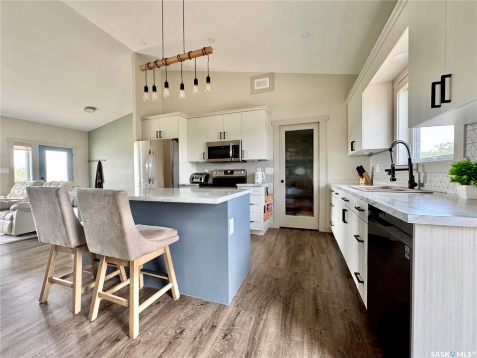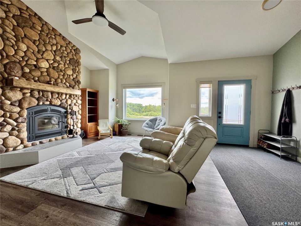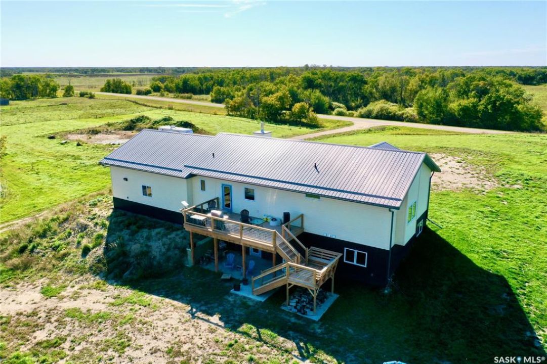 At Natures Edge Acres, nature and new construction come together in a way rarely seen in SE Saskatchewan. Tucked behind a mature shelterbelt where deer and songbirds wander, this 2022 custom build delivers more than 3,000 sqft. of exceptional living space—a chance to own a true countryside original without the wait of building. Designed from the ground up with family and entertaining in mind, the home offers 5 bedrooms and 4 bathrooms, plus a surprise you'll be talking about long after the showing: a 6th bedroom with a built-in slide right at the heart of the house. Whether it's kids at play or simply hauling heavy bags downstairs, the slide turns everyday tasks into something fun. The main living area wows from the moment you walk in. Vaulted ceilings and wall-to-wall windows capture prairie light from sunrise to those legendary Saskatchewan sunsets. A dramatic floor-to-vault river rock fireplace anchors the space—beautiful to look at and practical too, with settings that keep the home warm even if the power goes out. The chef's kitchen is ready for gatherings big or small, complete with a generous prep island, deep dovetailed pot drawers, and soft-close cabinetry. The sink frames tranquil eastern views while the west-facing picture window serves up nightly sunset shows. Built with modern efficiency in mind, the home features geothermal heating and cooling, weeping tile, excellent insulation, and spa-style ensuite showers. The electrical wiring has been thoughtfully planned—“overbuilt,” as the owners like to say—so you're ready for anything from a future basement bar with toe-kick lighting to advanced tech upgrades. Outside, the unfinished shop is already set up for big projects with a welder plug, 30-amp camper hookup, and doors tall enough for a lifted truck. Whether you're after a family retreat, a place to host unforgettable gatherings, or simply room to breathe, this acreage offers a rare combination of new-home comfort and Saskatchewan's natural beauty.