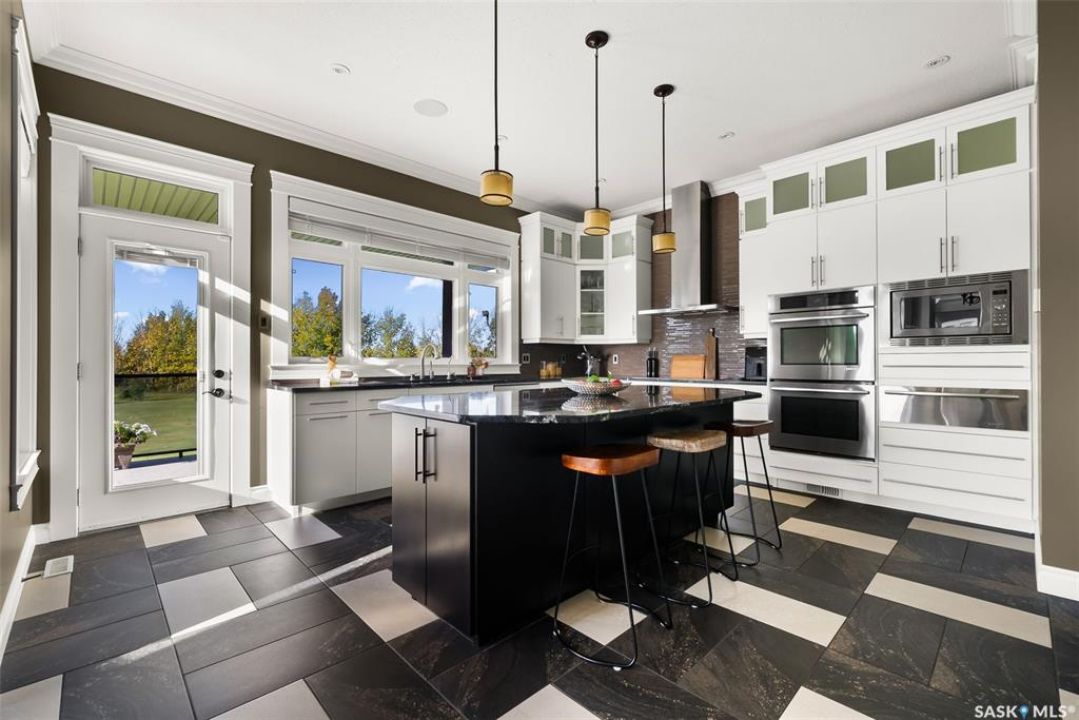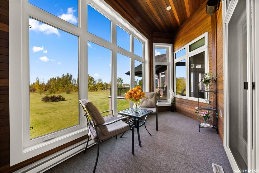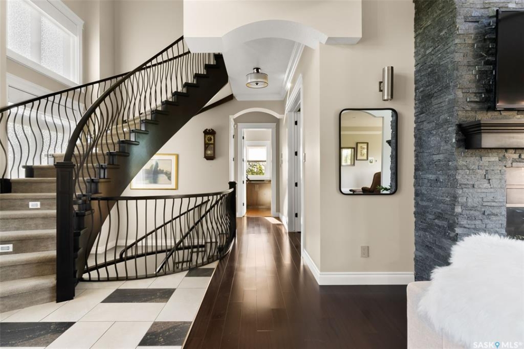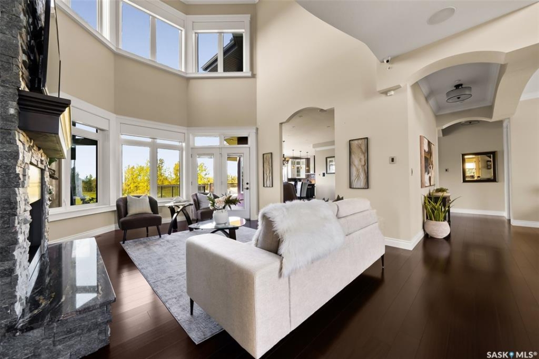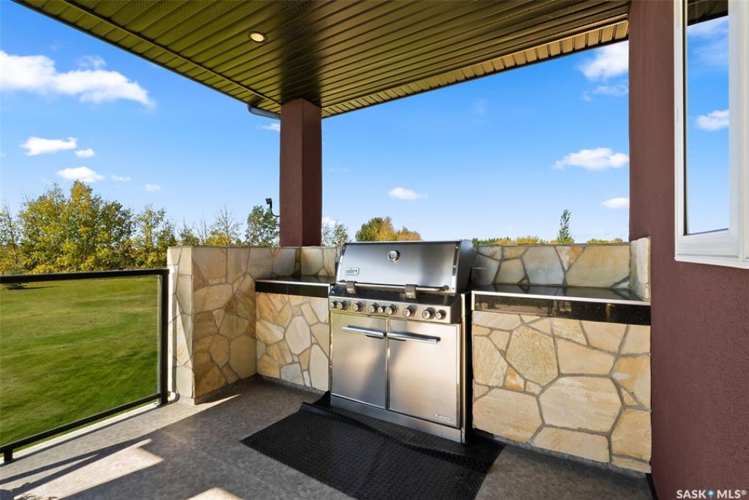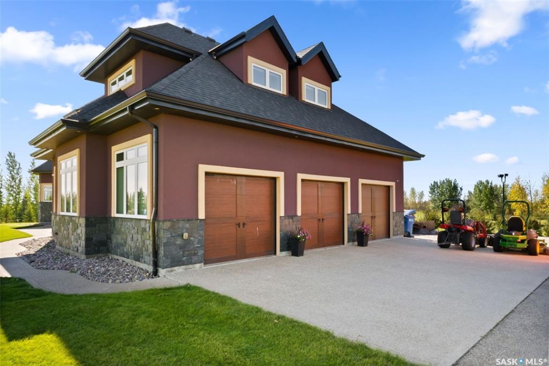 Step into unmatched luxury with this one-of-a-kind custom property, offering over 4,075 sq. ft. on the main and second levels plus a fully developed 2,500 sq. ft. walkout. Situated on 4.89 landscaped acres, this home blends elegance, comfort, and technology. A grand foyer with heated granite tile and a sweeping spiral staircase set the tone for the home's sophistication. The living room features expansive windows and a cozy gas fireplace, opening to the dining area with bar fridge and custom cabinetry. The chef's kitchen boasts Sub-Zero refrigeration, Jenn-Air appliances, walk-in pantry with heated tile, Culligan water filtration, and direct access to a three-season sunroom. The primary suite is a private retreat with cork flooring, his & hers walk-ins, spa-inspired ensuite with heated tile, Bain Ultra soaker tub, dual vanities, and a built-in mirror TV. Upstairs are 3 bedrooms and 3 baths, including 2 ensuites and a shared bath with tub/shower, plus a large bonus room. The walkout lower level includes a theatre with projector/screen, wet bar with wine room, exercise studio, sewing/office space, and an additional bedroom with ensuite. In-floor heat runs throughout, and 4 rooms offer direct backyard access. Smart home features include Savant automation for TVs, fireplaces, and blinds, Apple TV, Xbox/DVD integration, and 3 Shaw Direct satellite dishes. Bedrooms have blackout + lace blinds, while automated blinds are in the kitchen, living, and theatre. Additional highlights include heated mudroom tile, central vac with extra hoses, security with 8 cameras, fire sprinklers, and a heated 5-car garage with wheelchair-ready access. Outdoors, enjoy a multi-purpose sport court, solar-lit driveway, upper & lower decks with built-in BBQs, underground sprinklers, and wiring for a future hot tub. This property offers acreage living at its finest — a perfect blend of luxury, technology, and comfort in a private setting. Ask your REALTOR ® for a full list of features!